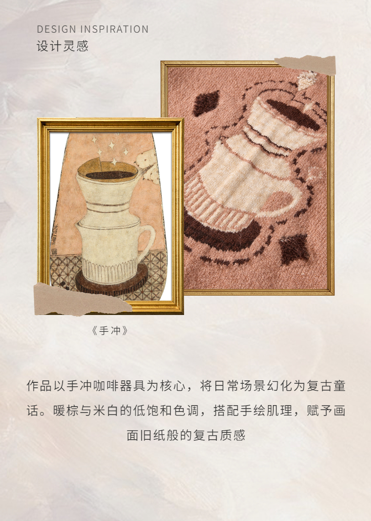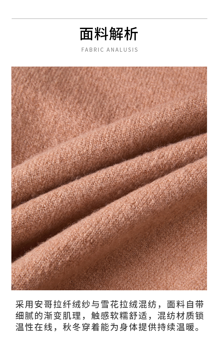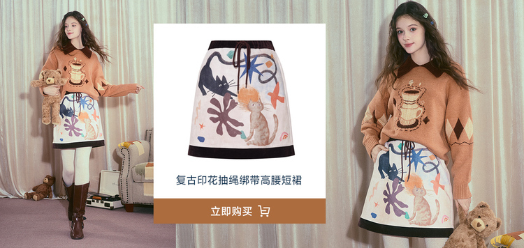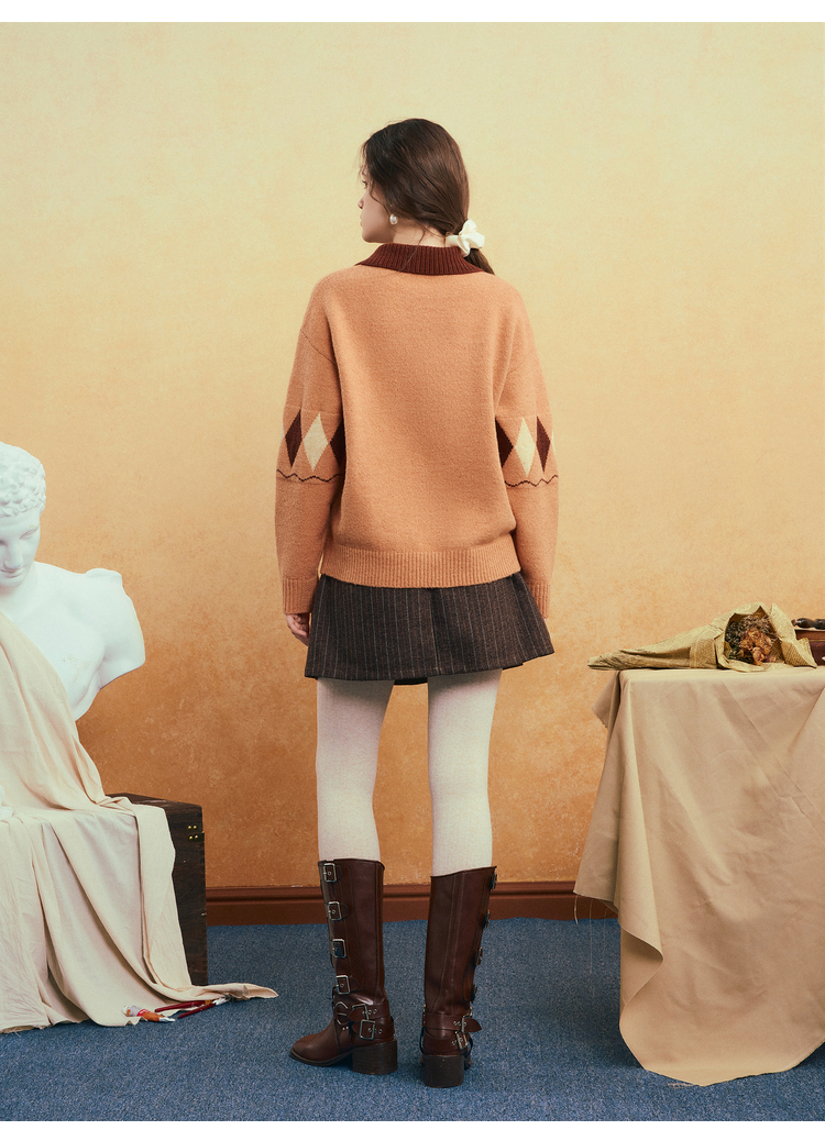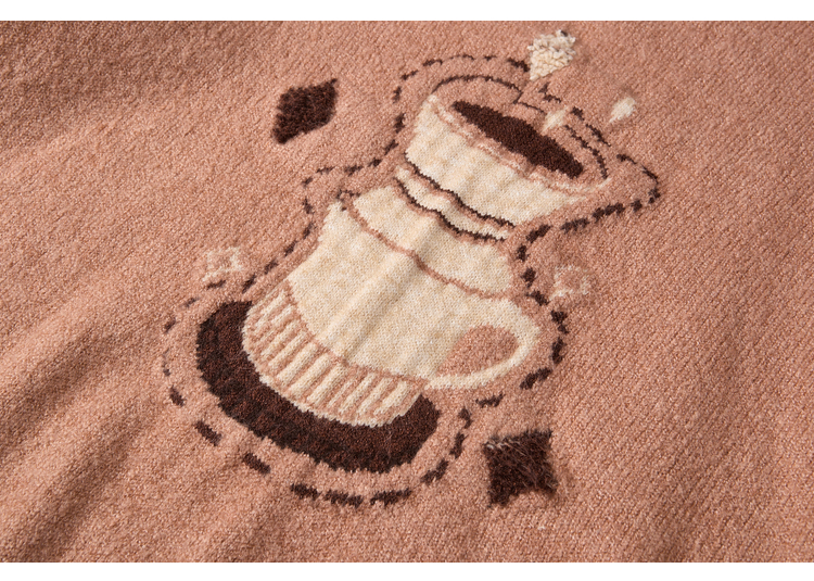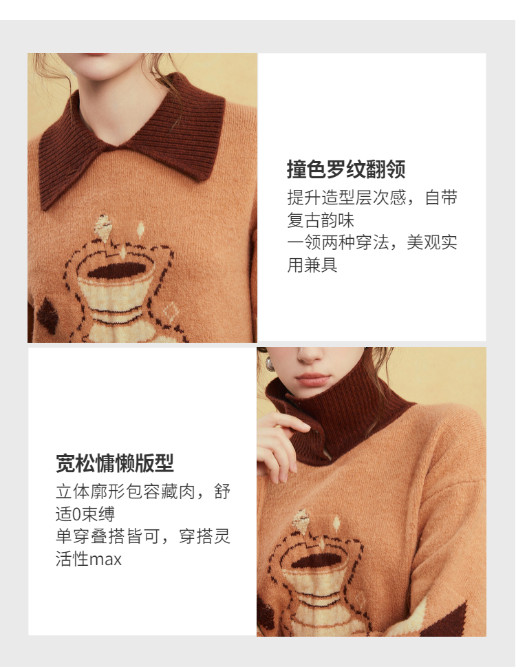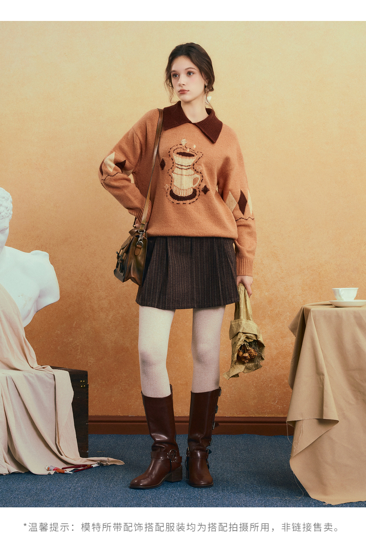 两三事晨咖暖叙2025冬季新款森系风咖啡壶图案拼色翻领套头毛衣女