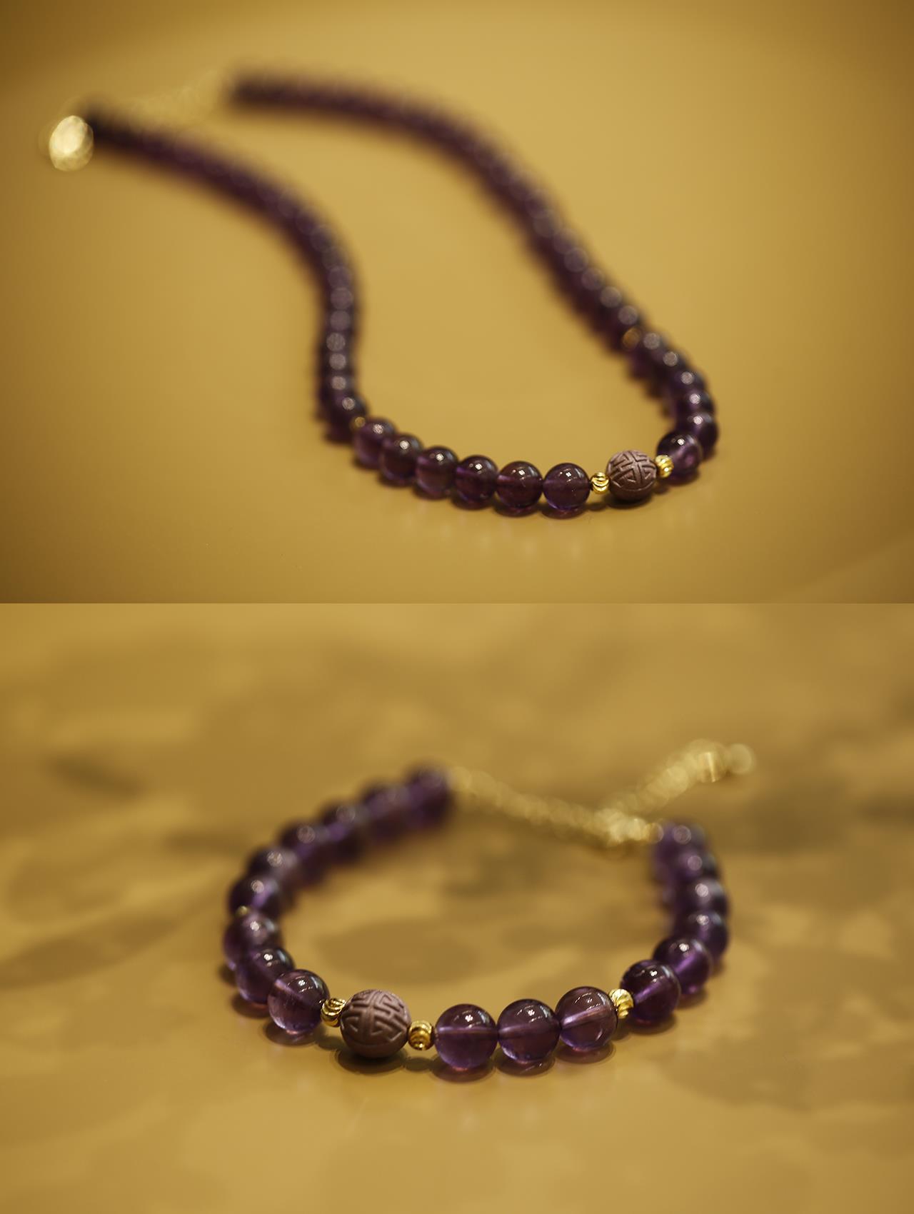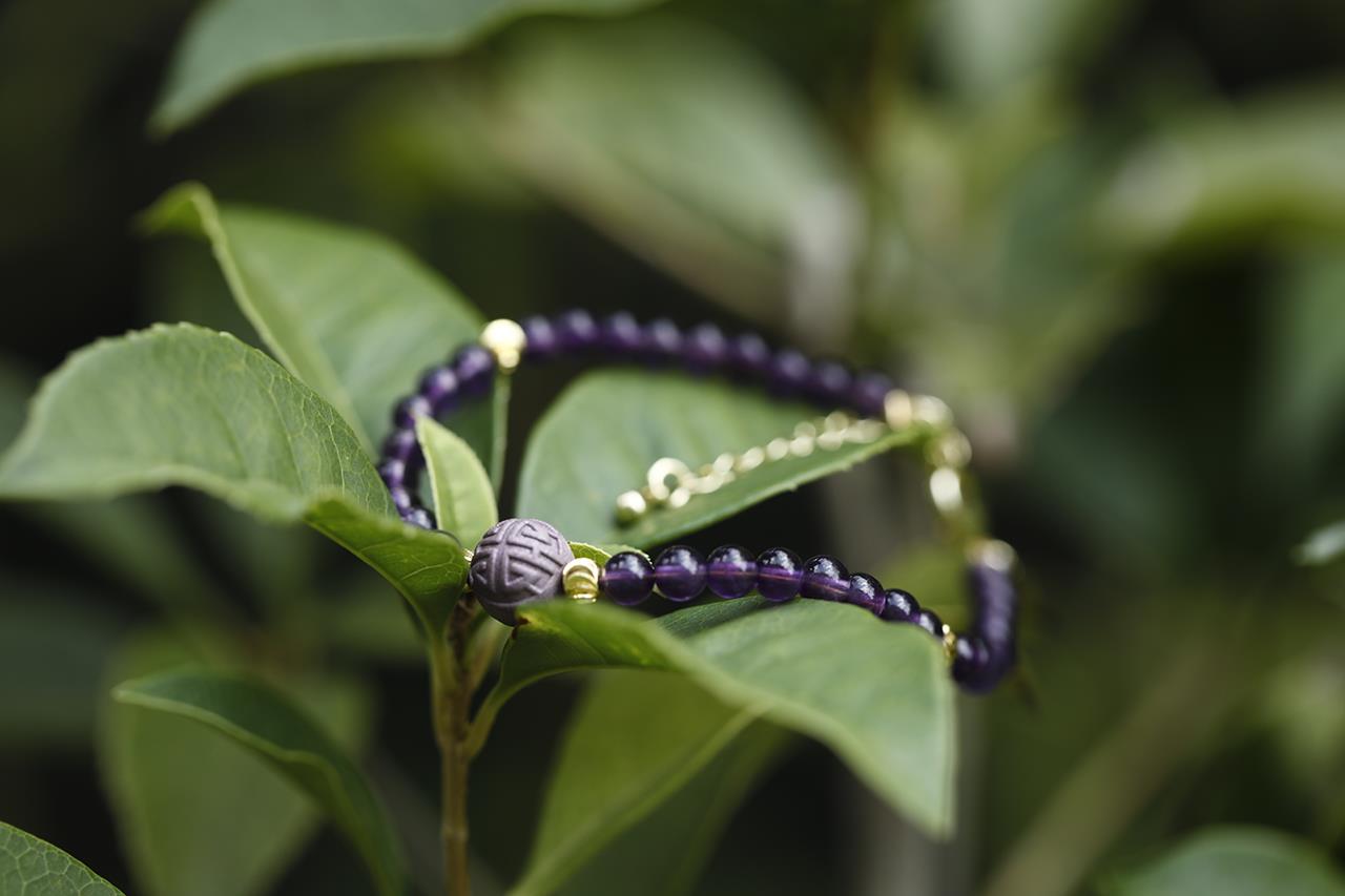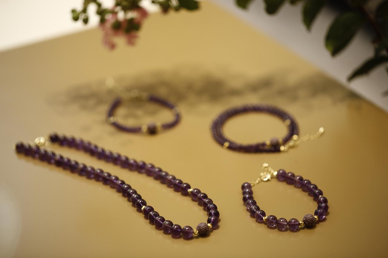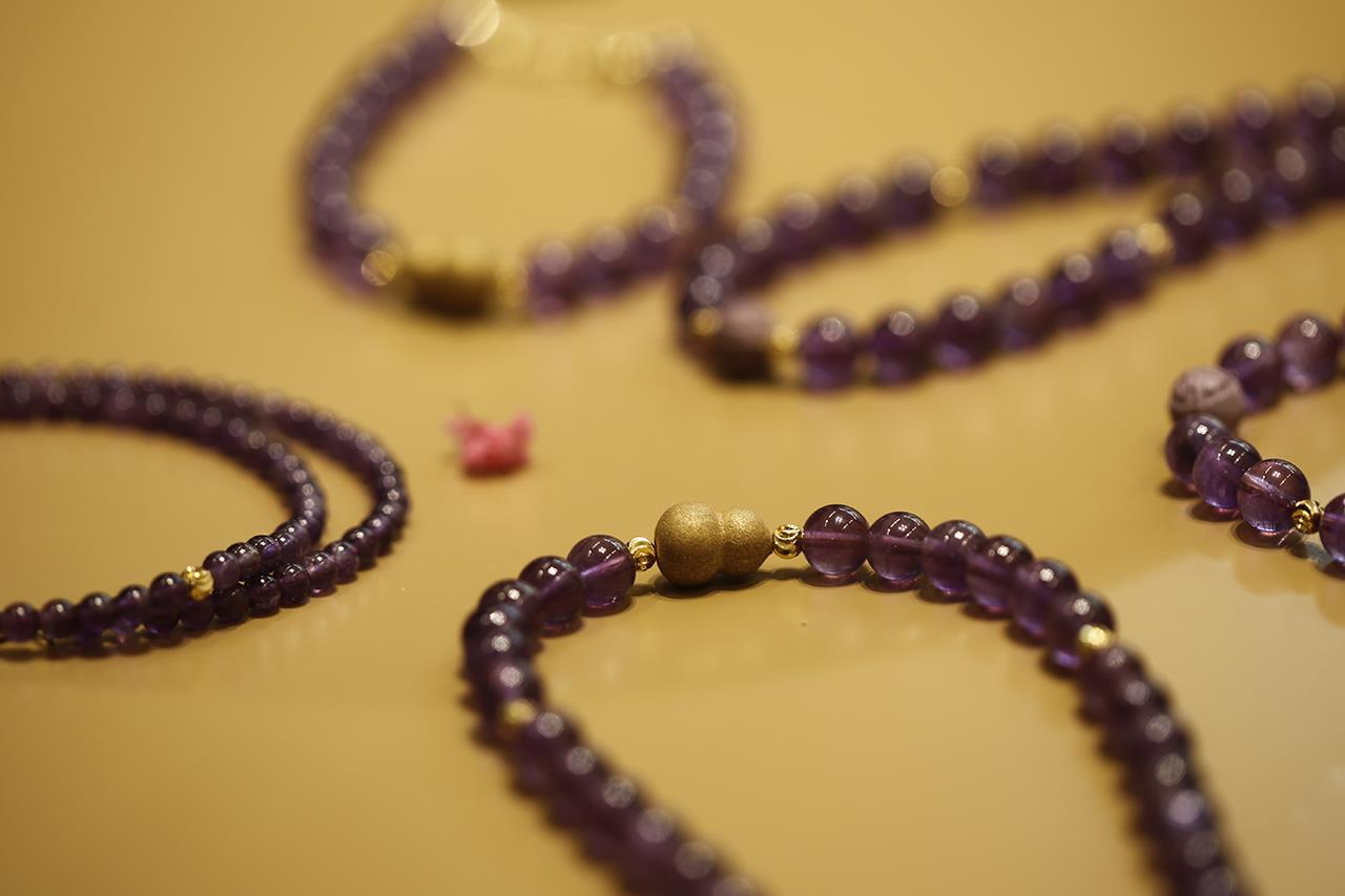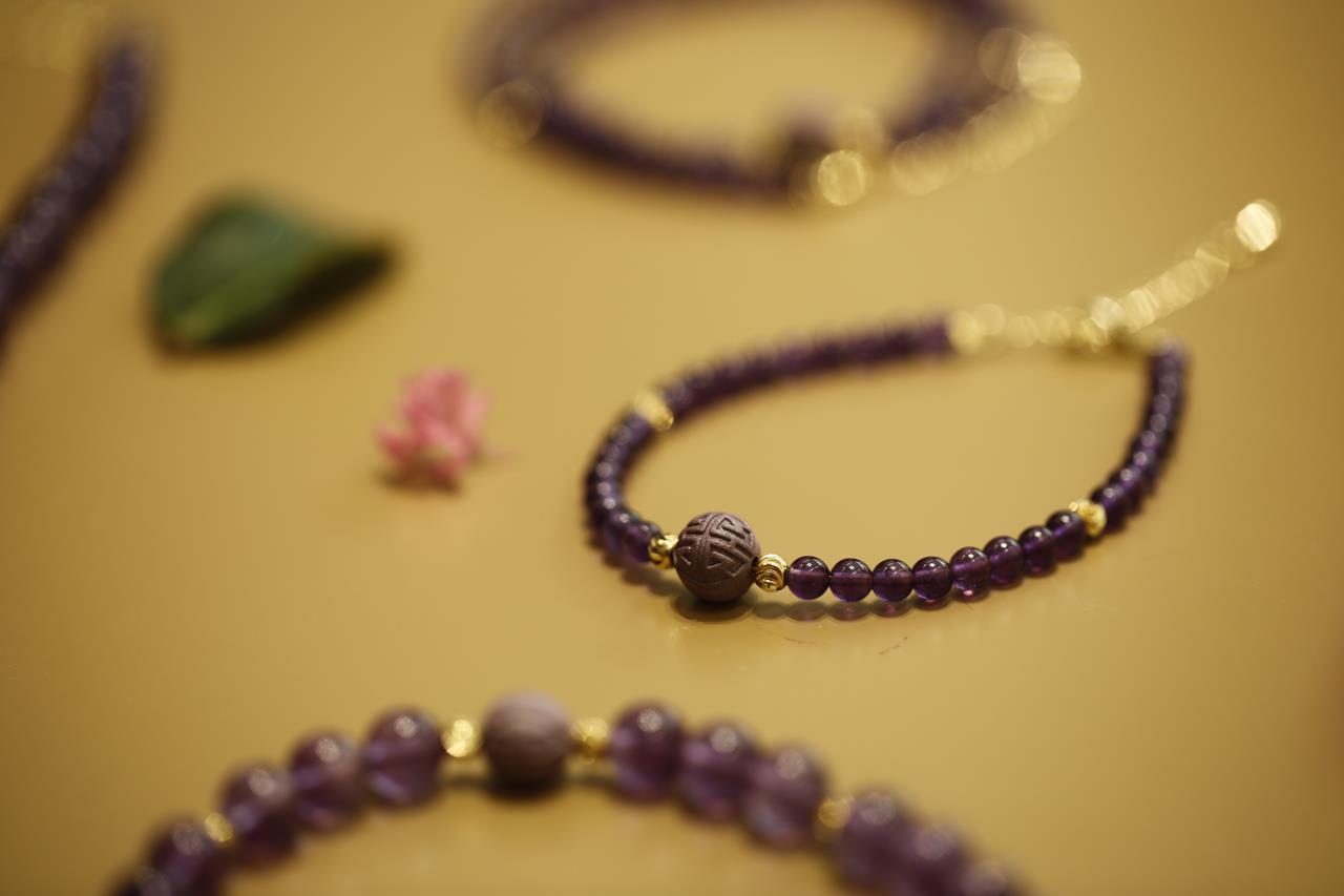 今年是九紫离火年的第一年,为此杜掌柜在这次香珠首饰上,特地选用了神秘浪漫的紫水晶搭配。
