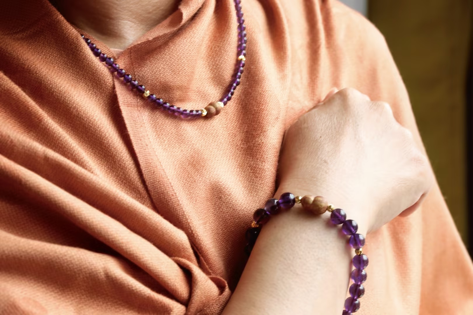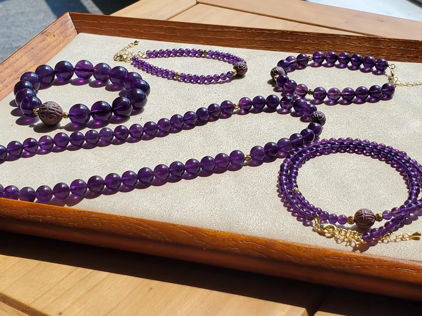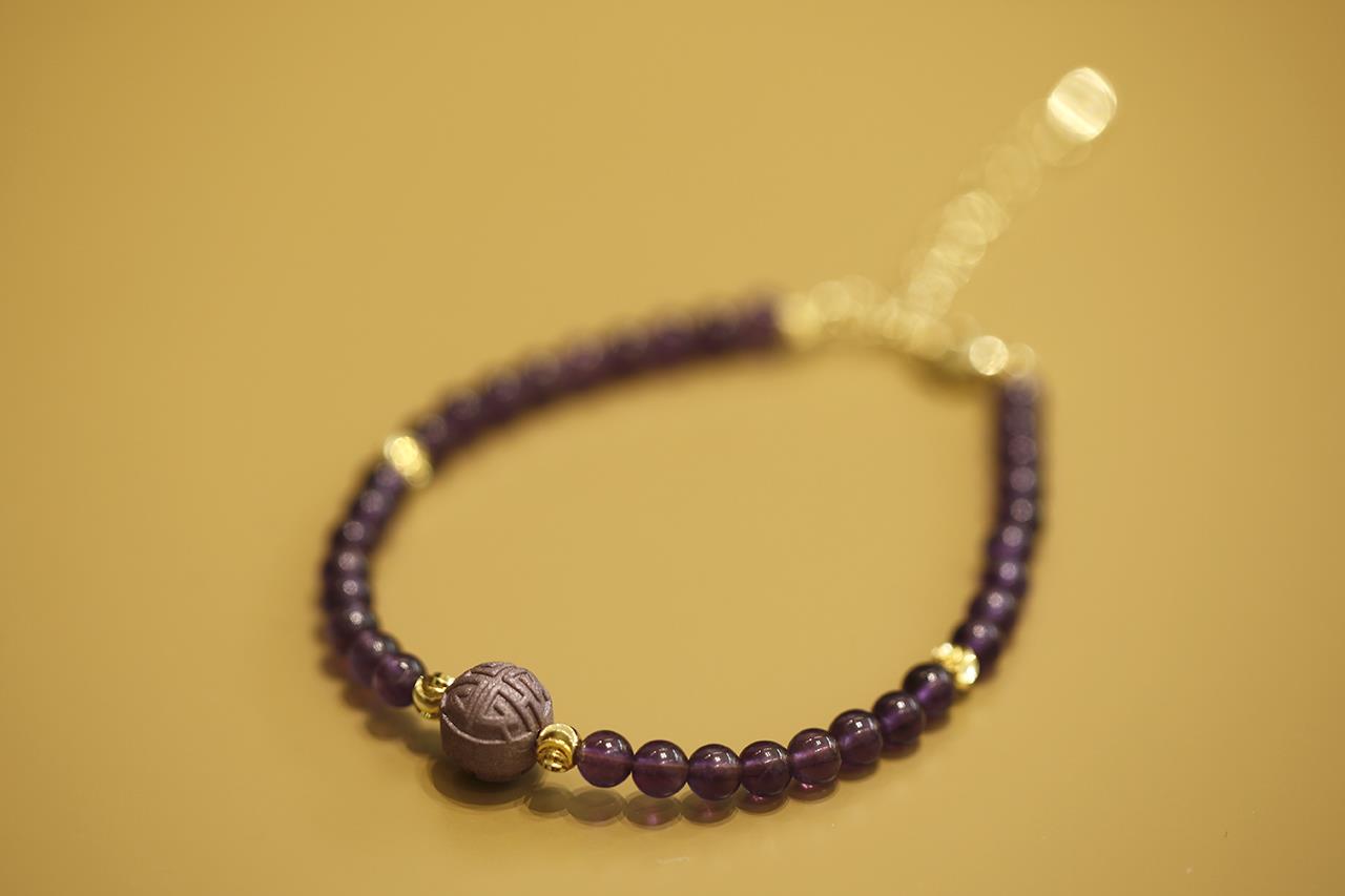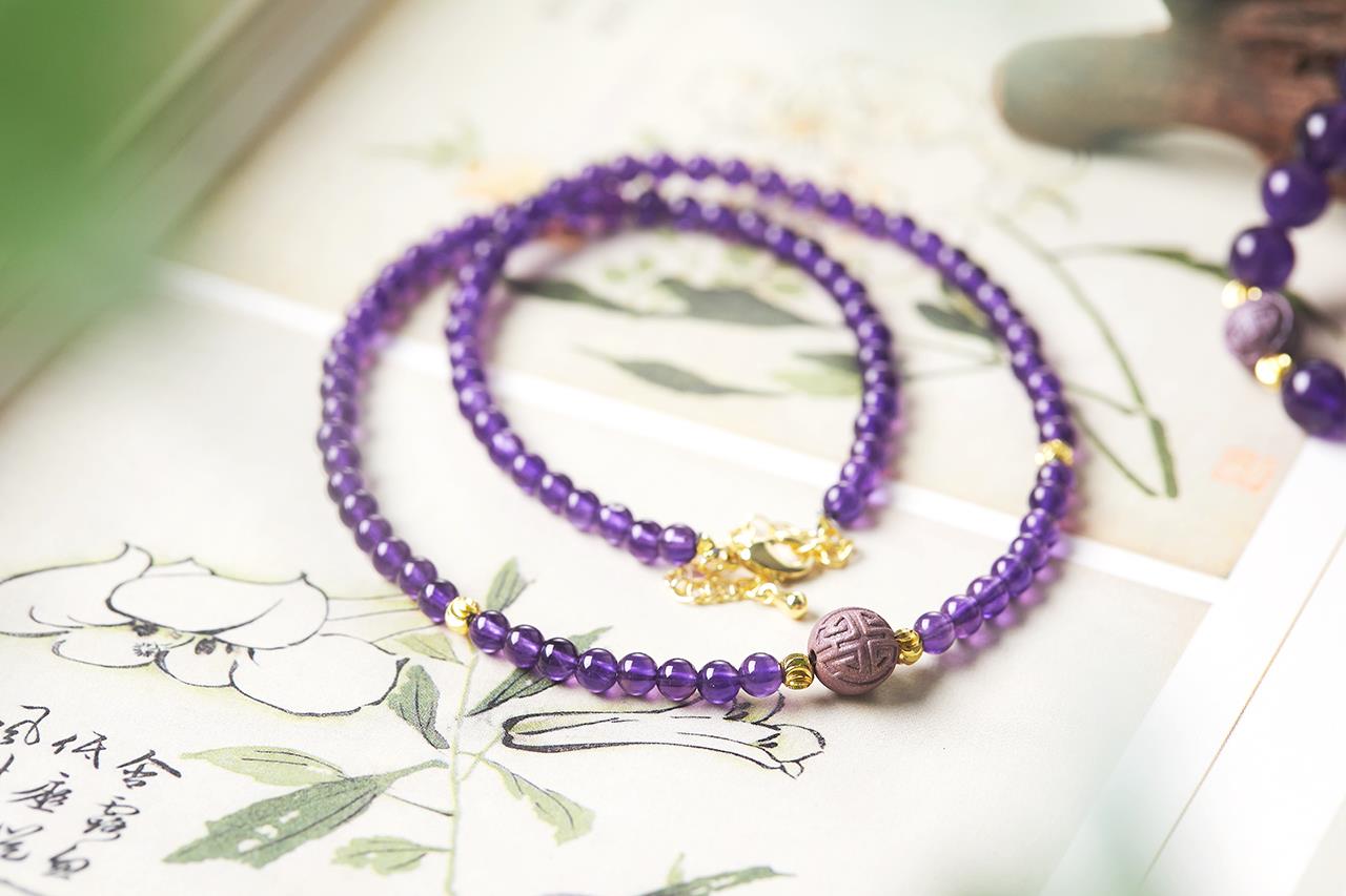 今年是九紫离火年的第一年,为此杜掌柜在这次香珠首饰上,特地选用了神秘浪漫的紫水晶搭配。