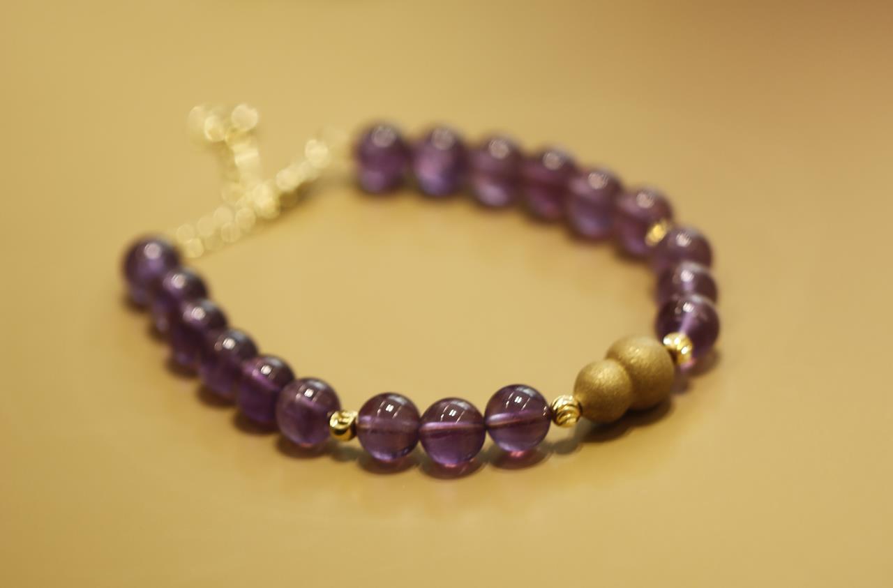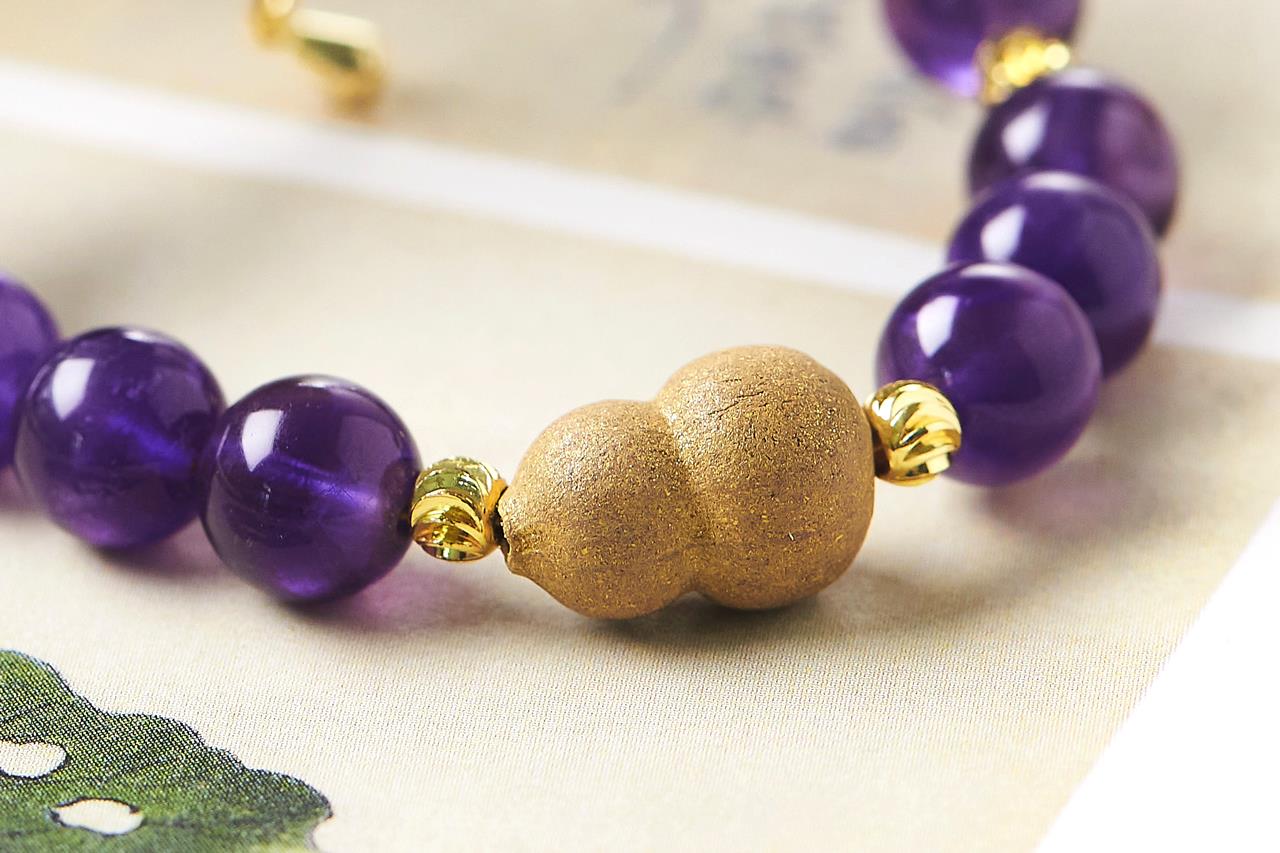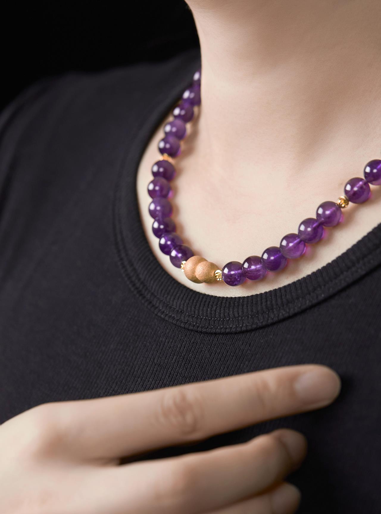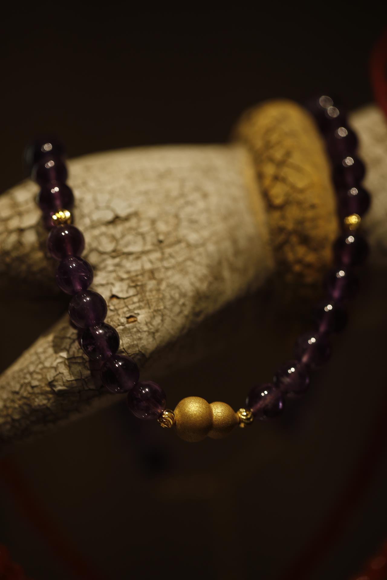 紫水晶素来由“智慧之石”的美誉,是勇气与力量的贵人之石,与紫色香珠相搭配,有紫气东来之意,有金色隔珠相辅,更是贵气逼人