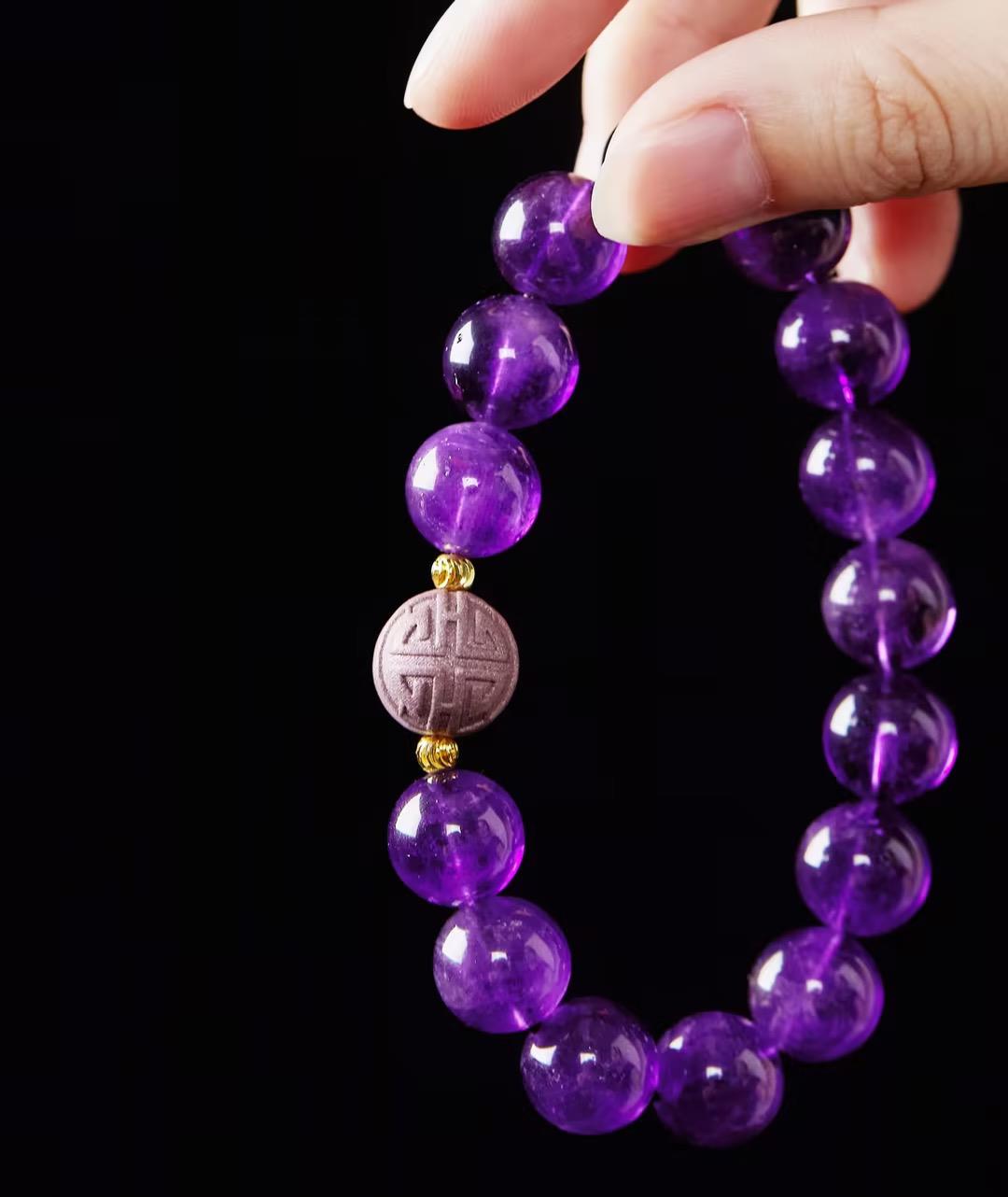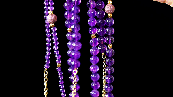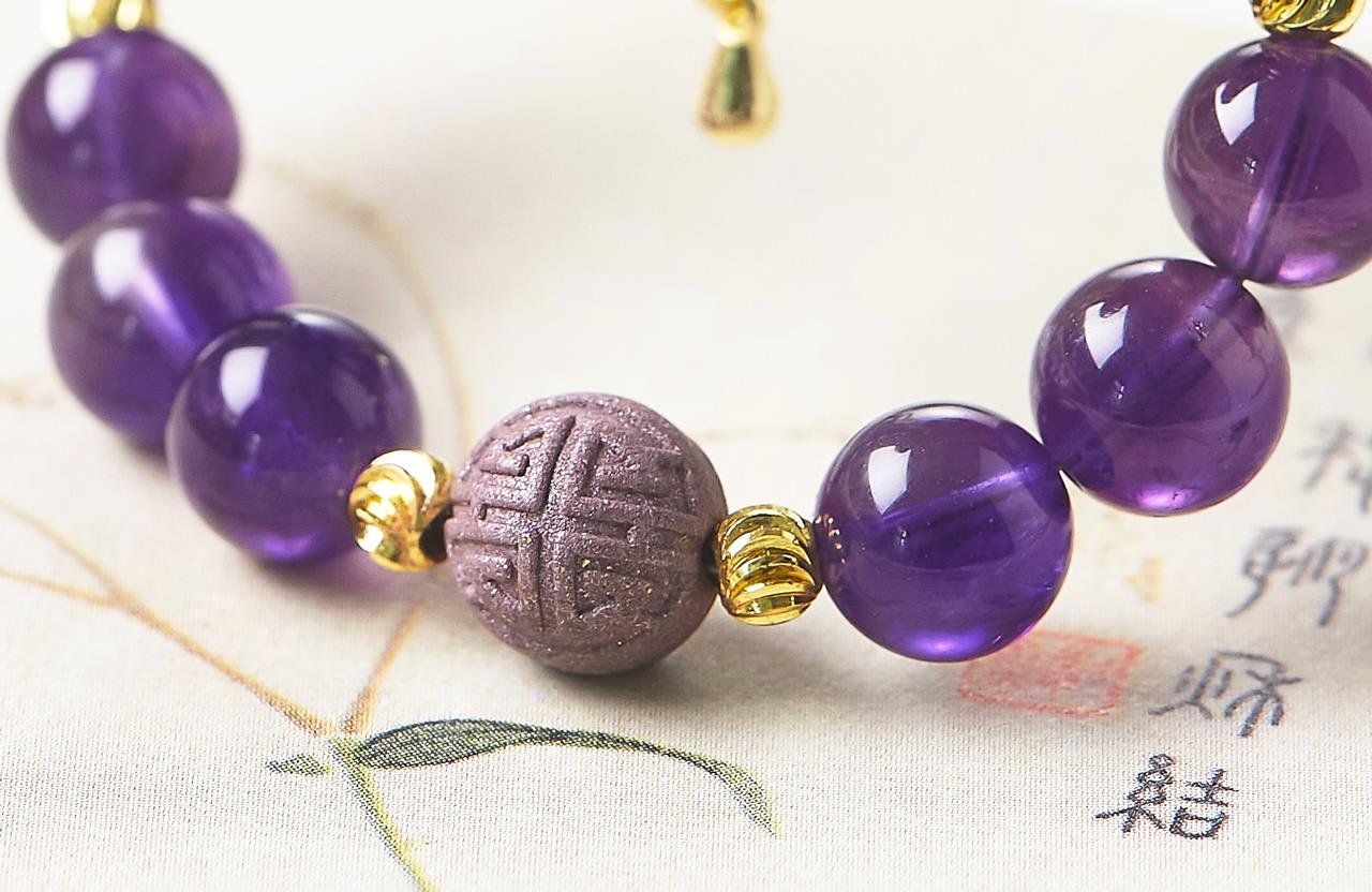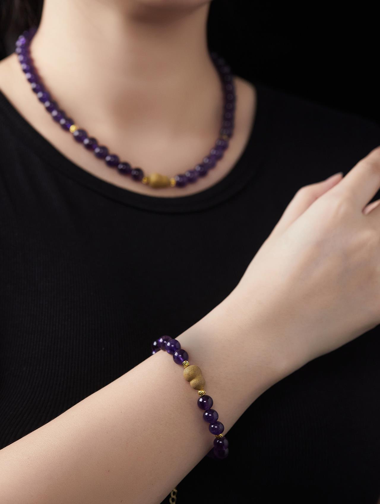 紫水晶素来由“智慧之石”的美誉,是勇气与力量的贵人之石,与紫色香珠相搭配,有紫气东来之意,有金色隔珠相辅,更是贵气逼人