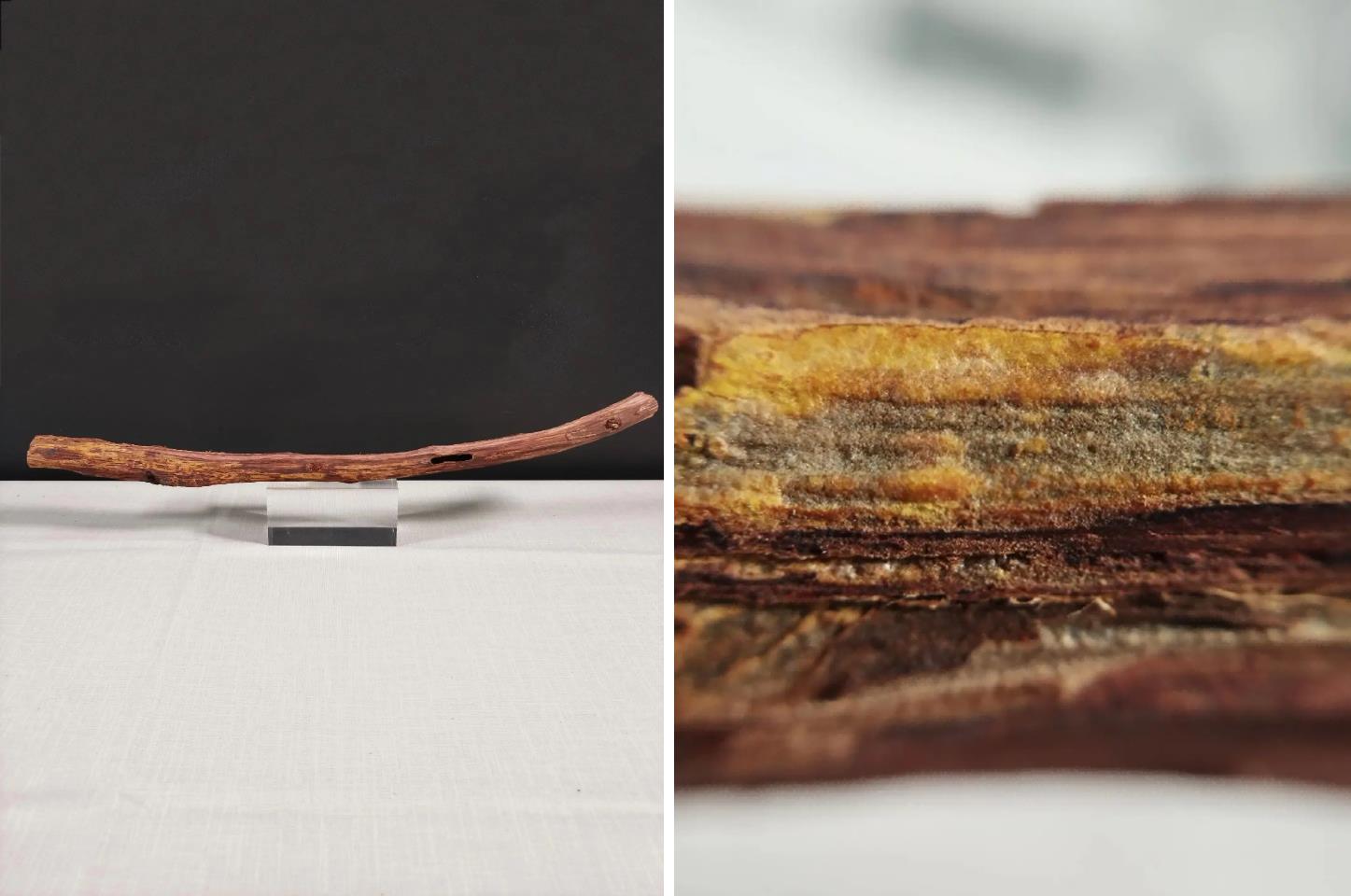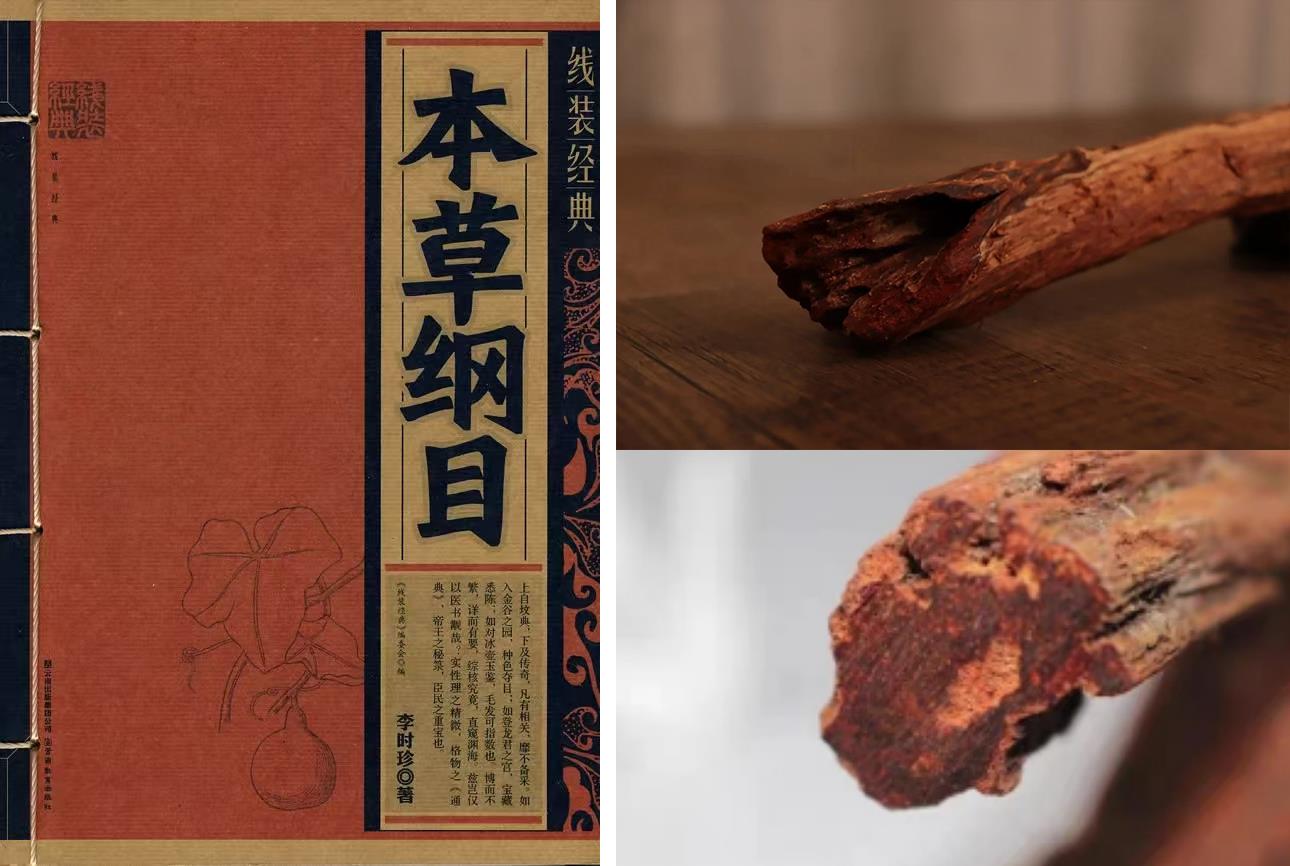 △紫藤降真香:干燥的根部芯材呈条块状,表面红褐至棕紫色,香气浓郁。