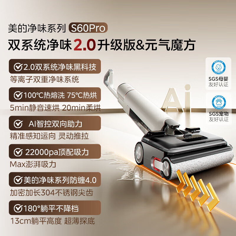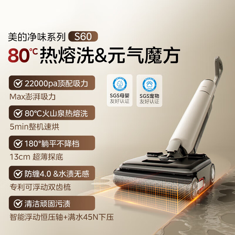 美的净味洗地机全自动清洗手持吸拖洗一体拖地机器人扫地机毛发防缠绕电动拖把 【吸拖洗一体全自动清洁】S60