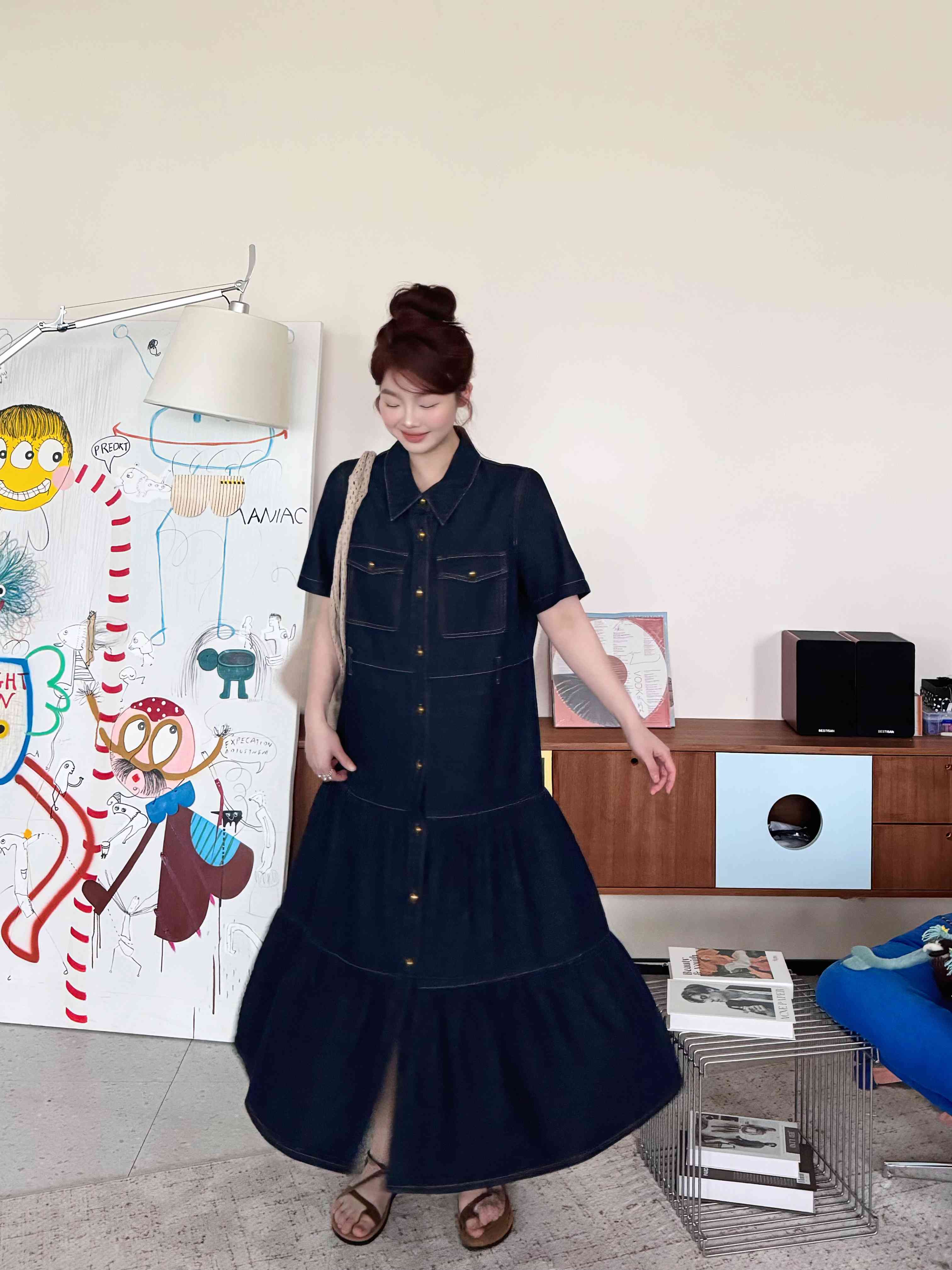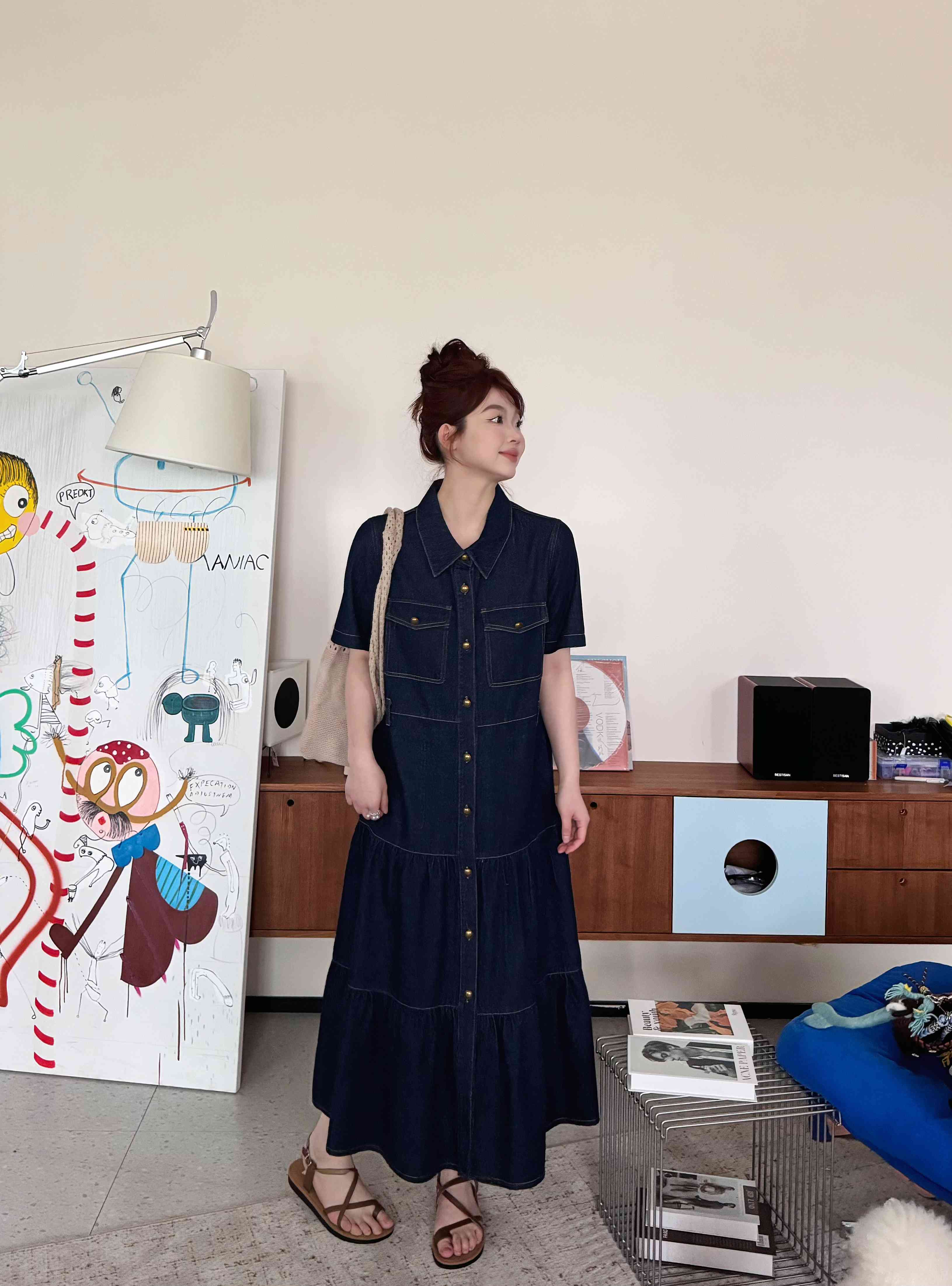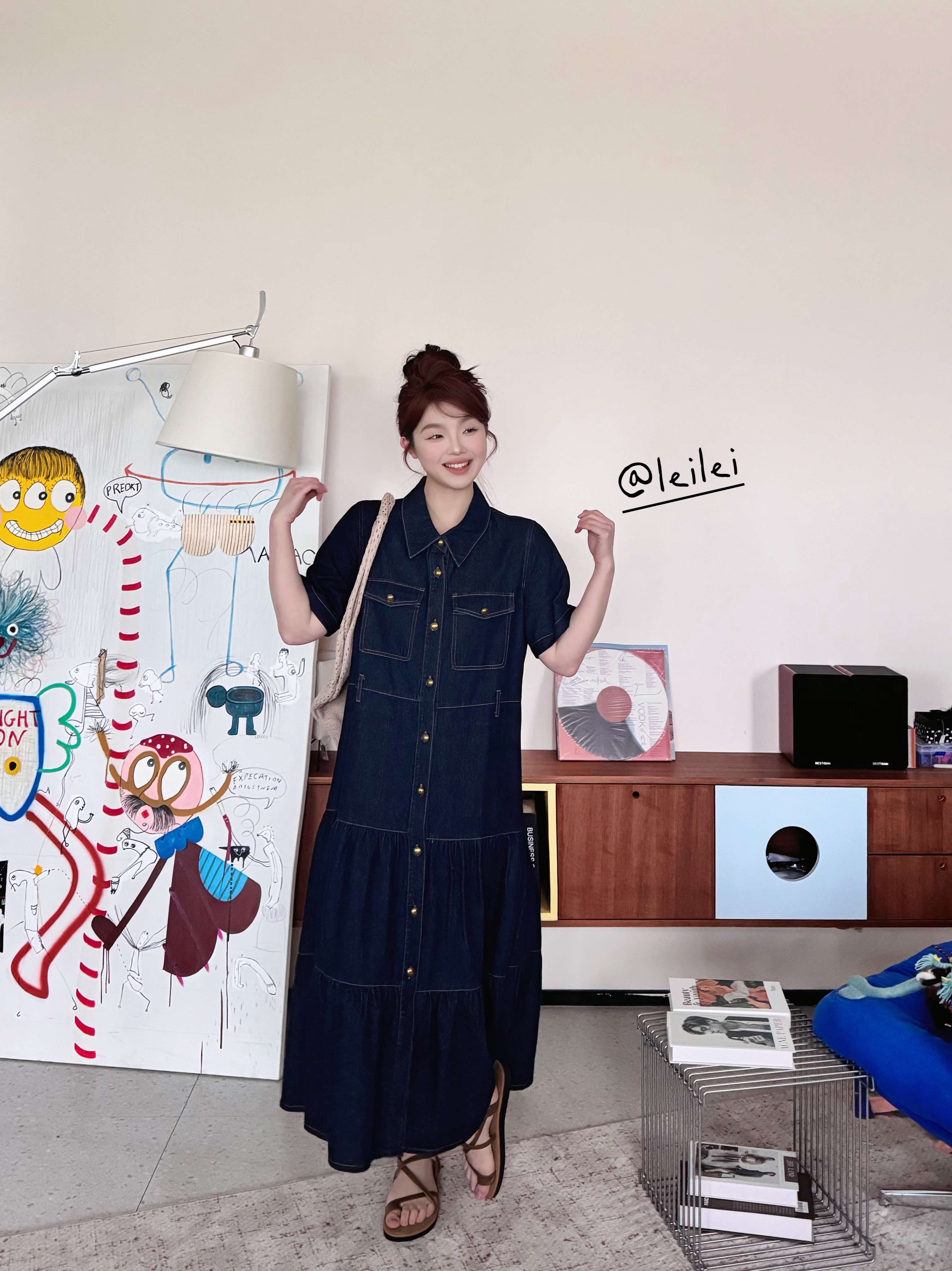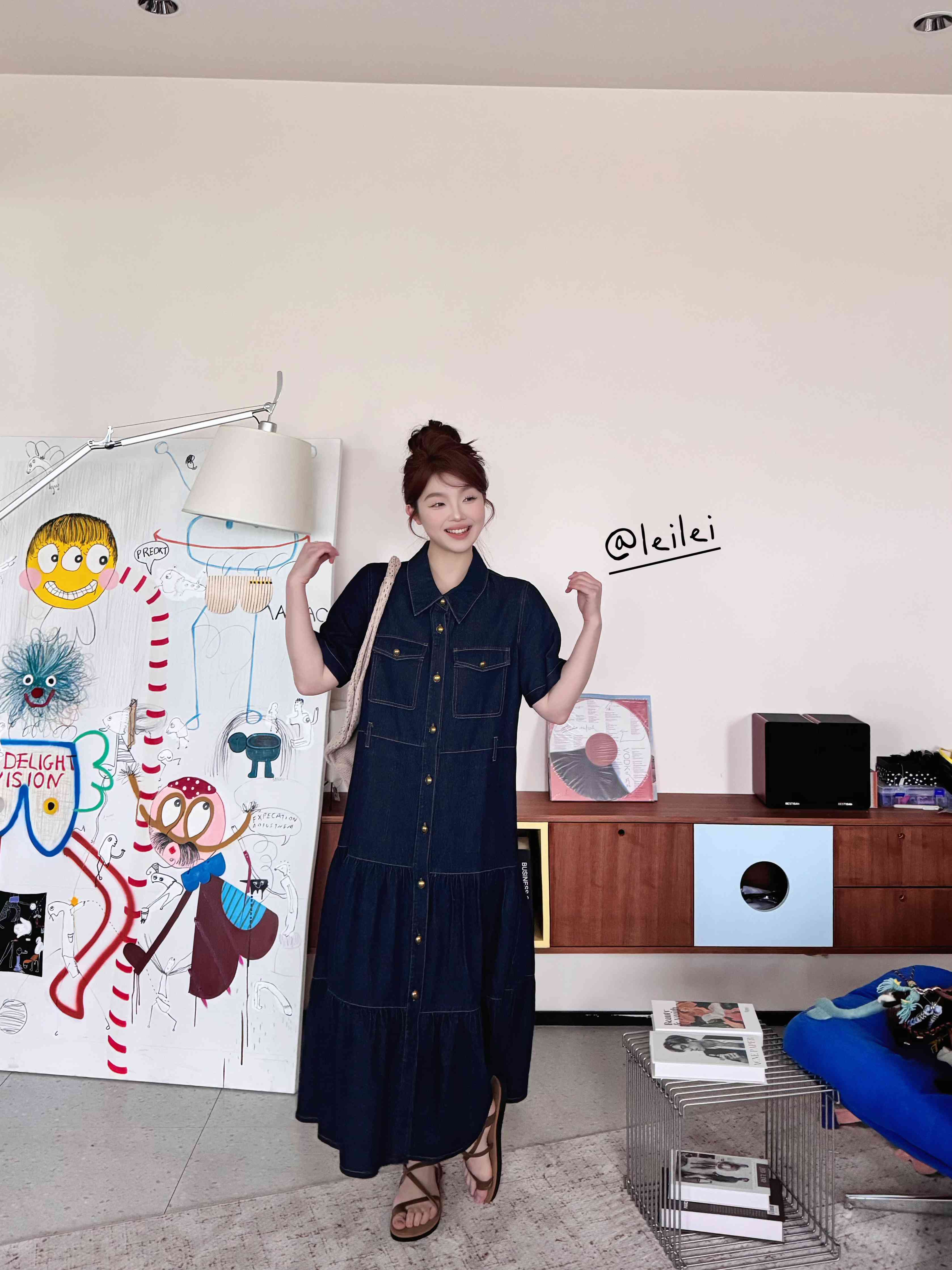 2025新品 蕾蕾同款【蓝调唱片】复古百搭下摆A字翻领短袖蛋糕牛仔连衣裙