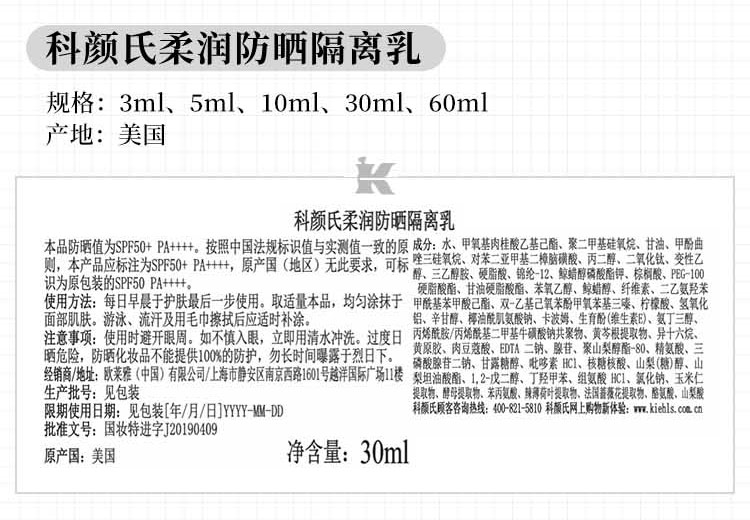 科颜氏(Kiehl's)柔润防晒隔离乳60ml 小橘盾防晒霜保湿修护抗皱护肤品 心选到家