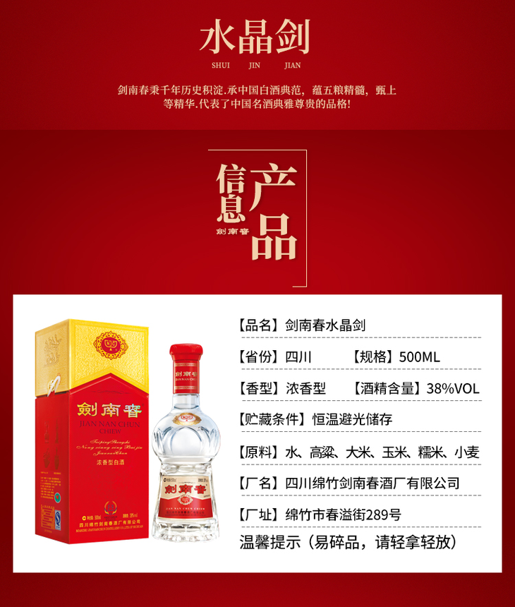 【推荐】剑南春 水晶剑 38度 整箱装白酒 500ml*6瓶 口感浓香型