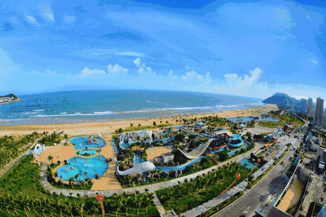 大角湾占地 18000 平方米,游乐资源丰富。一侧是湛蓝大海,一侧是大型水上乐园。海滩开阔广袤,水上游玩项目多样,为您带来精彩纷呈的海滨体验。