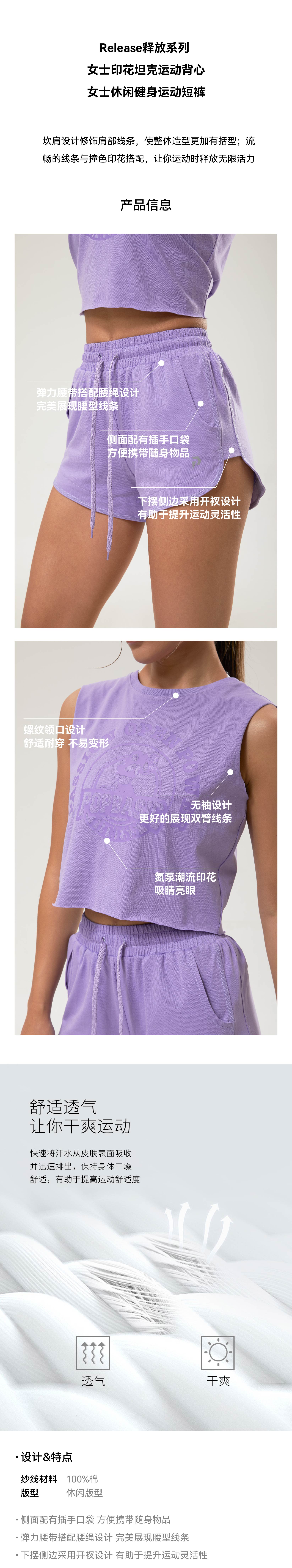 Release释放系列 女士印花坦克运动背心 女士休闲健身运动短裤
