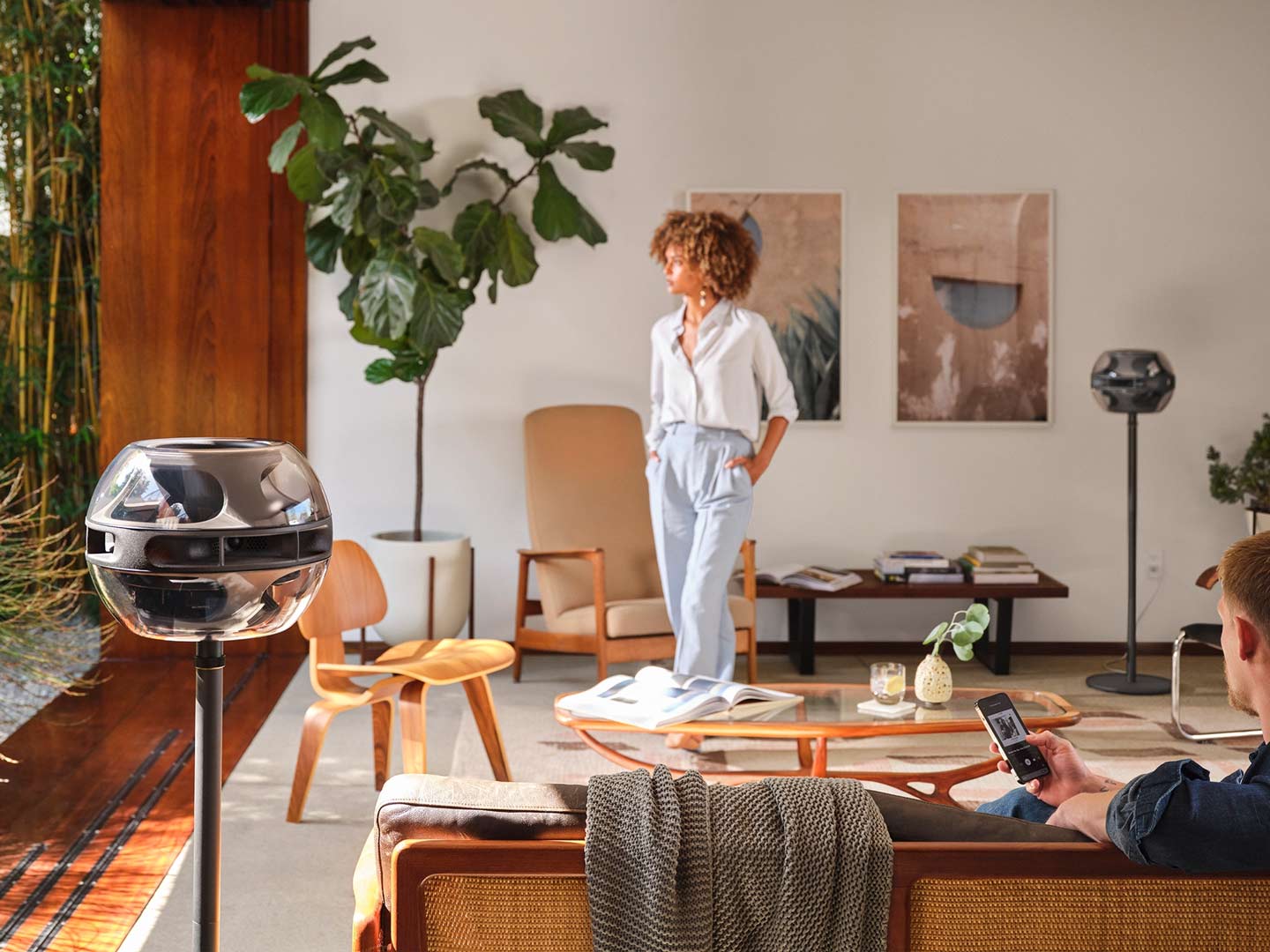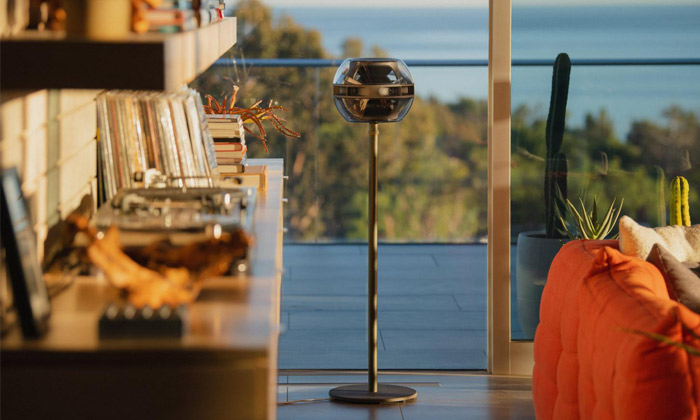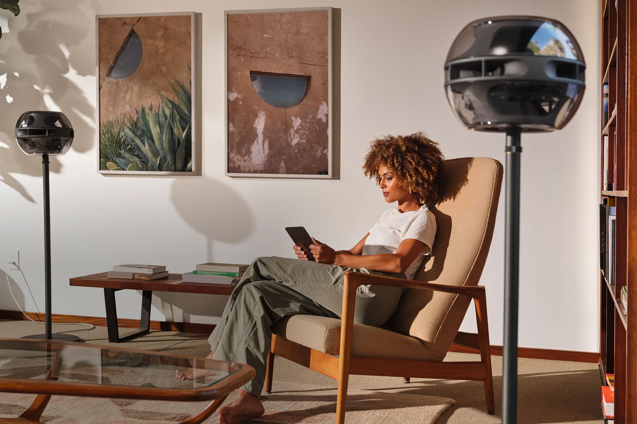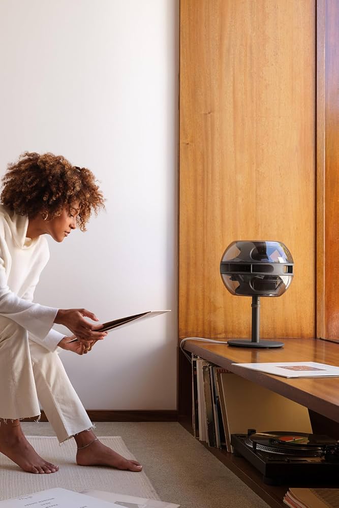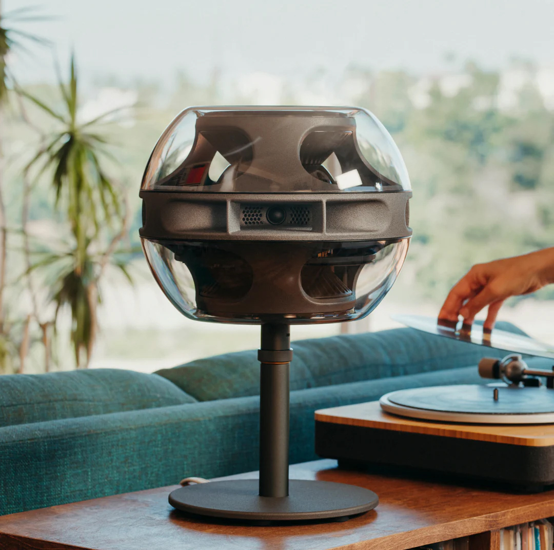 Alpha 充满工业、未来感的极简美学,与设备的功能「相辅相成」,整个「球体」由三部分组成,顶部、底部各有一组低音单元,并分别搭载两个驱动器,采用力平衡配置,通过为低音单元施加更多质量最终实现「三声道」环绕式音效。