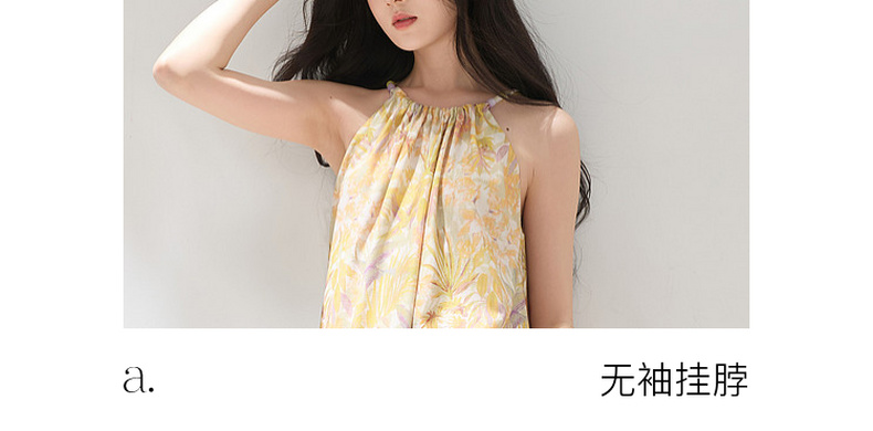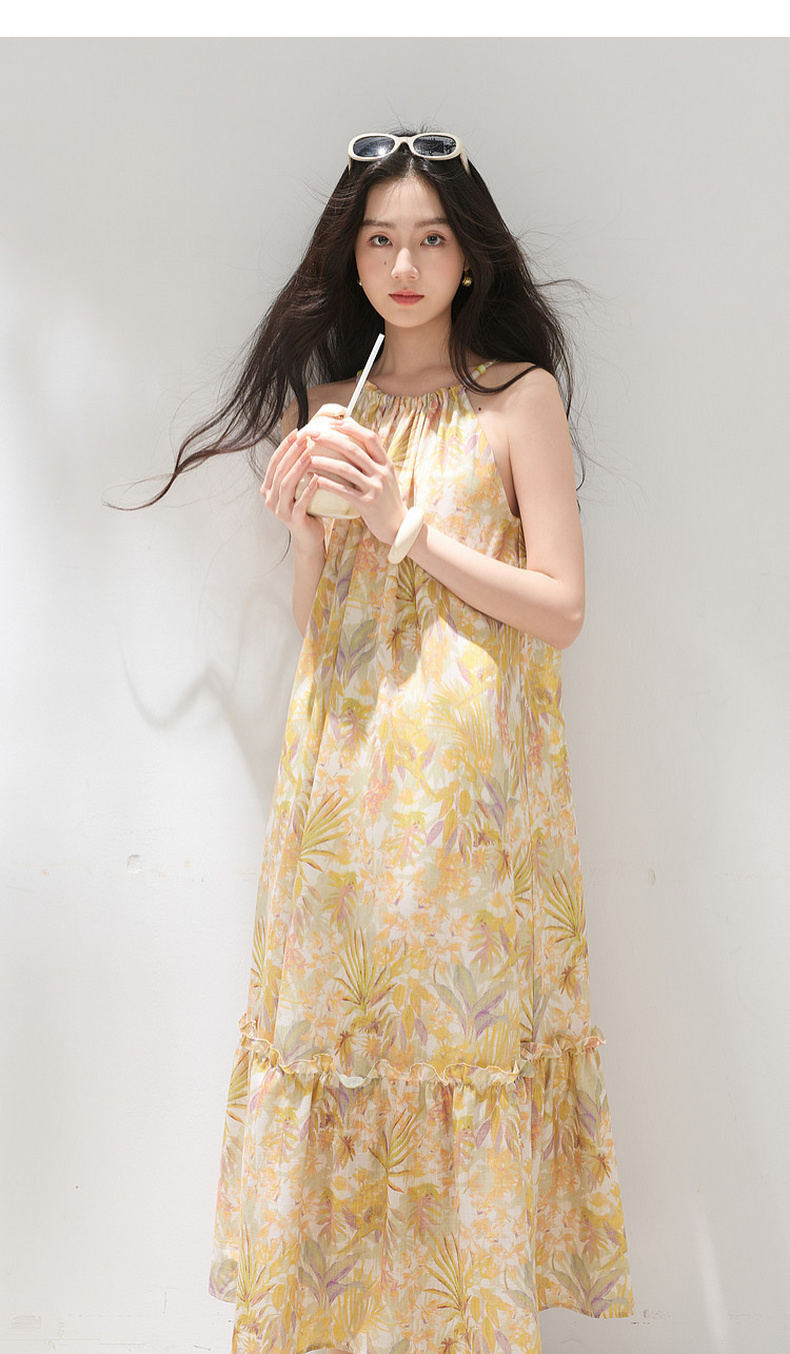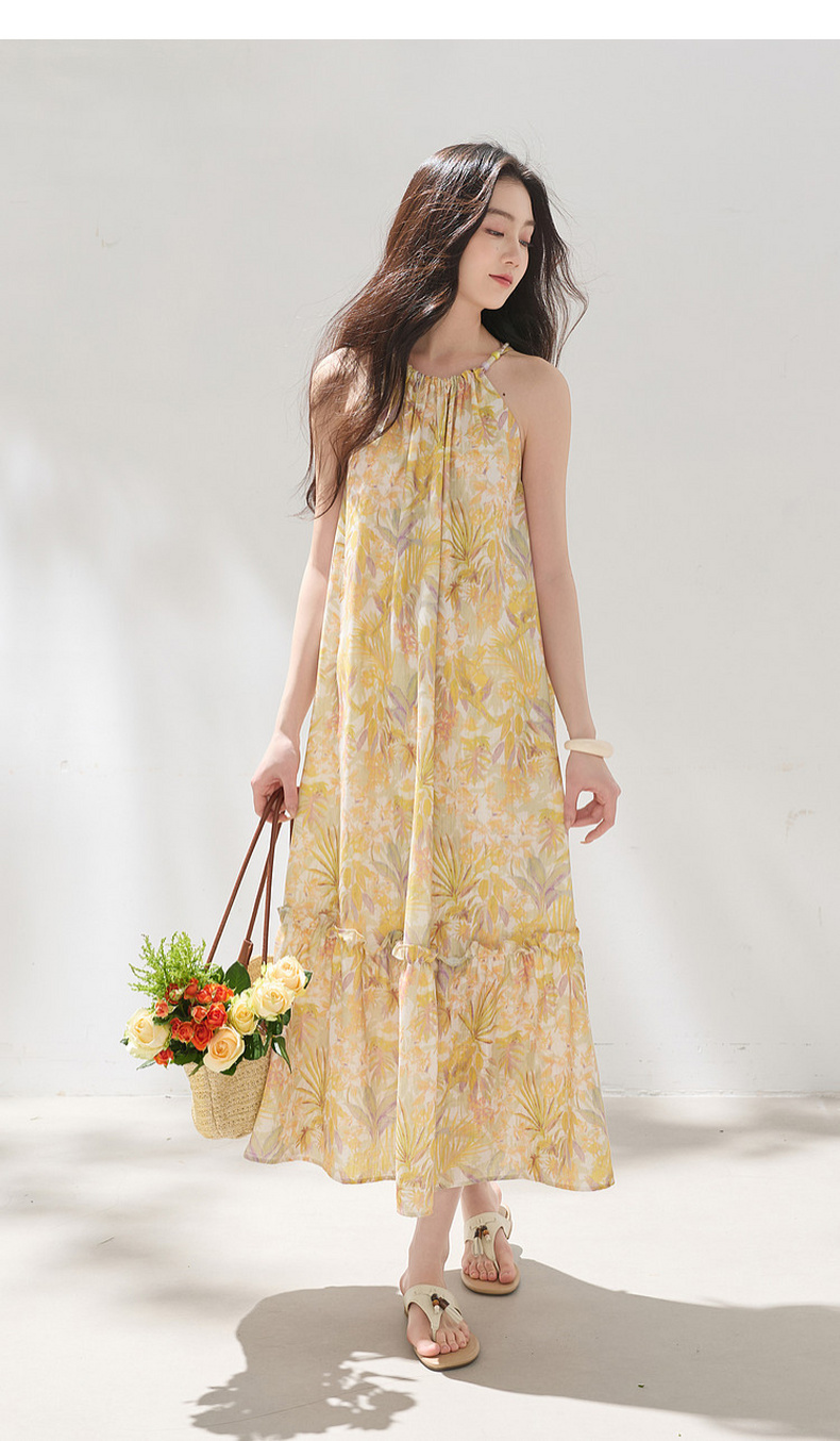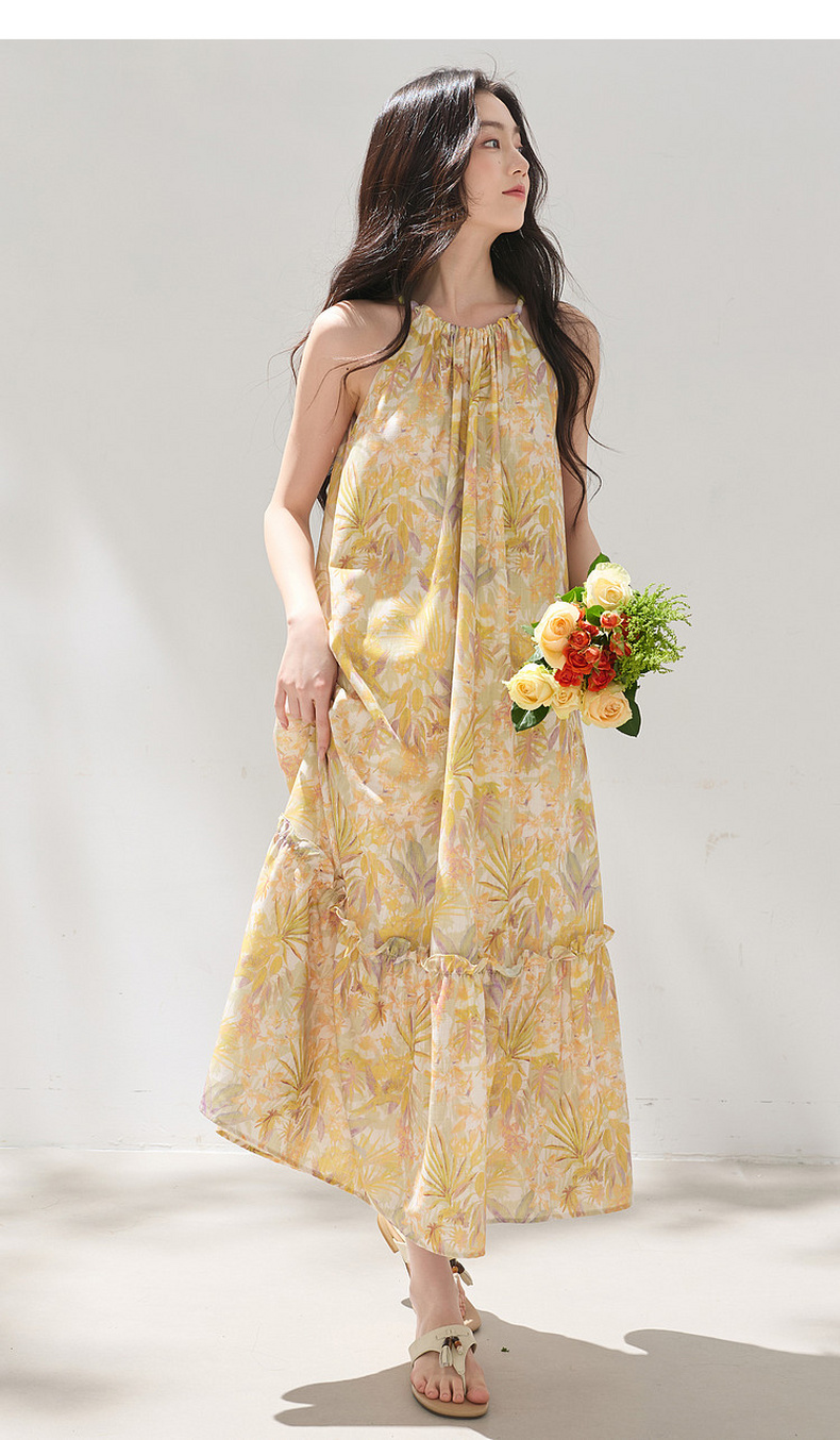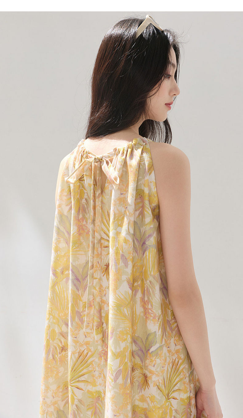 三彩2026夏季新款印花连衣裙挂脖无袖度假长裙宽松大摆M