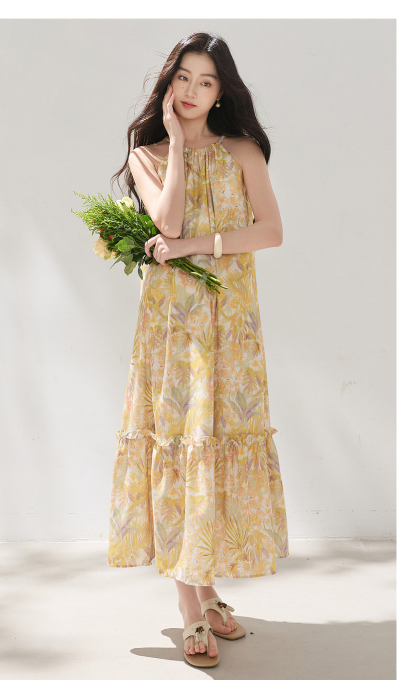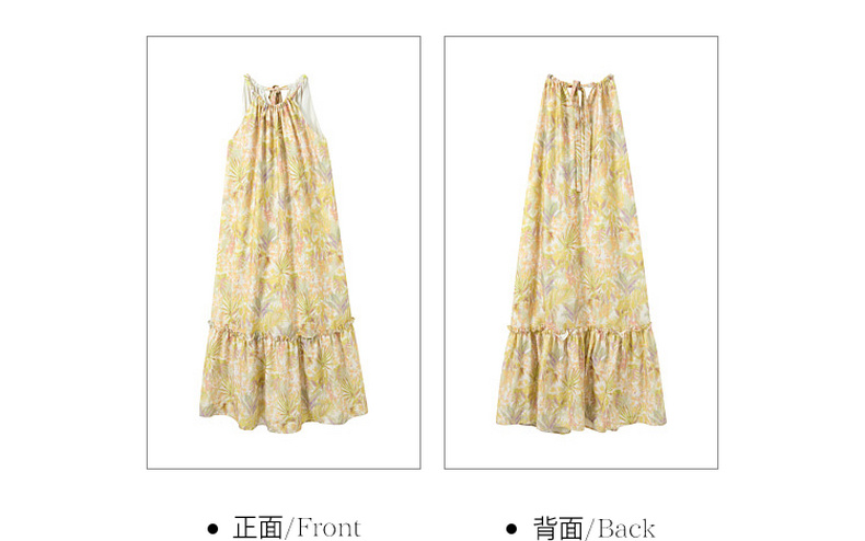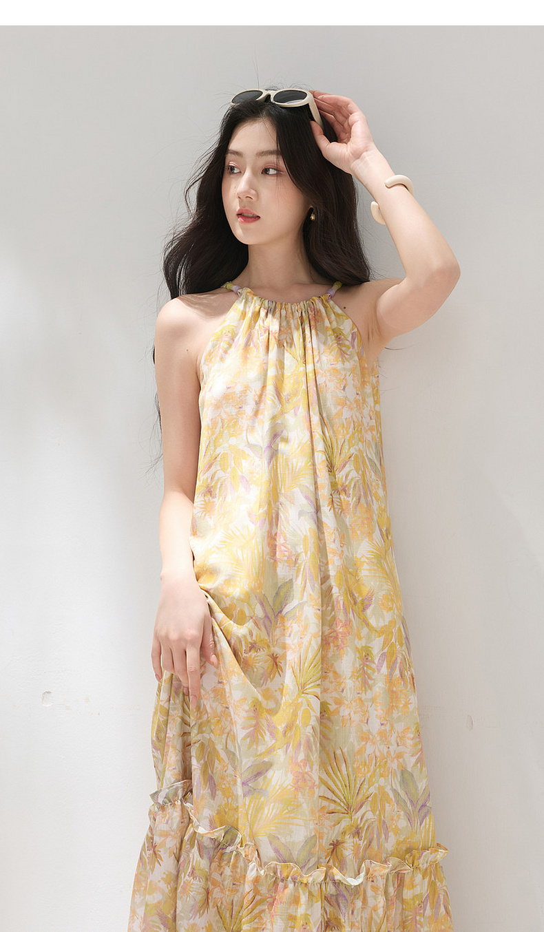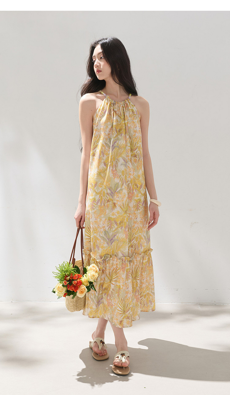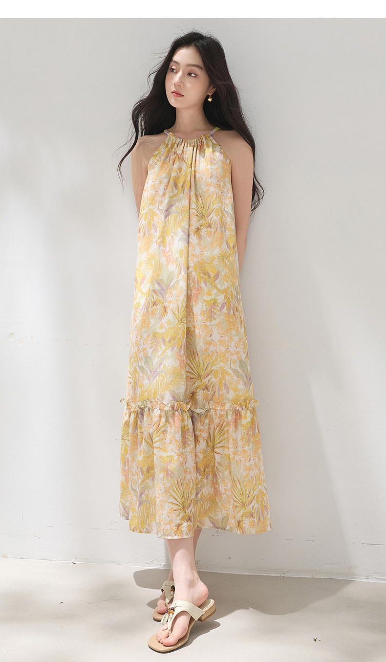 三彩2026夏季新款印花连衣裙挂脖无袖度假长裙宽松大摆M