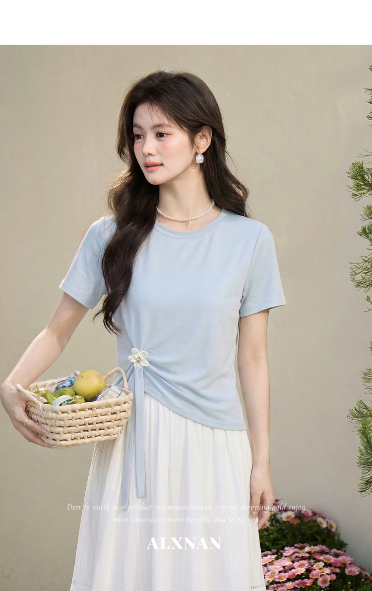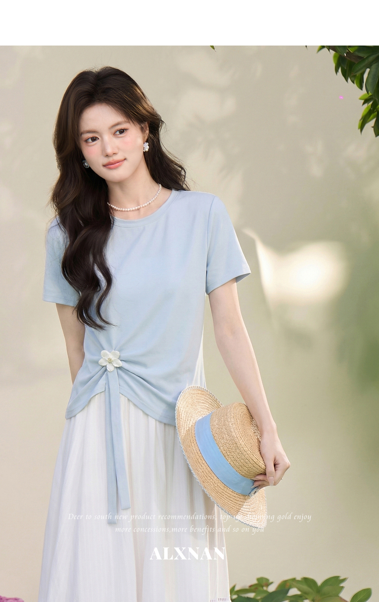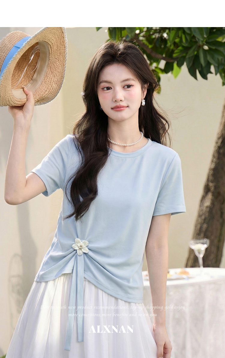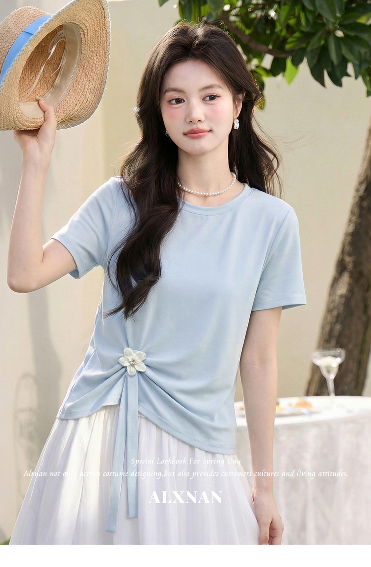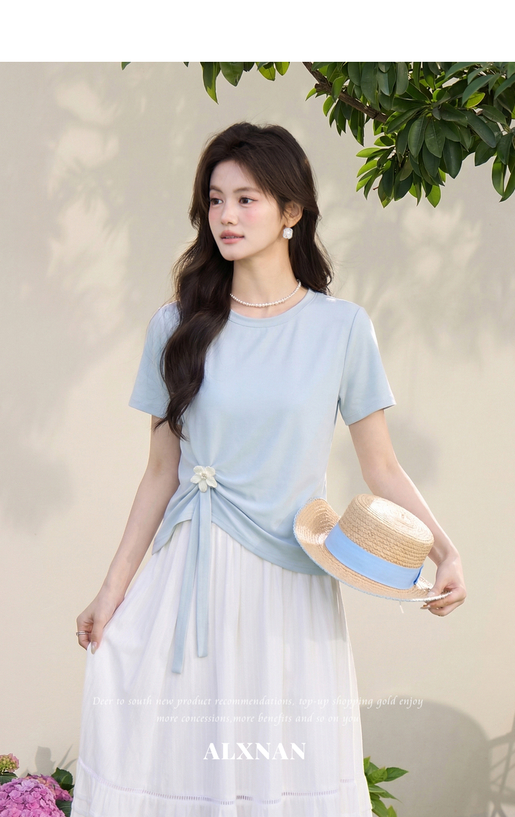 鹿向南「南巷清风」蓝色短袖T恤女夏季新款韩系chic漂亮减龄上衣