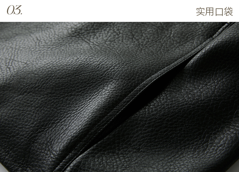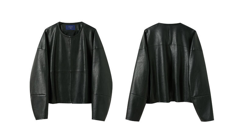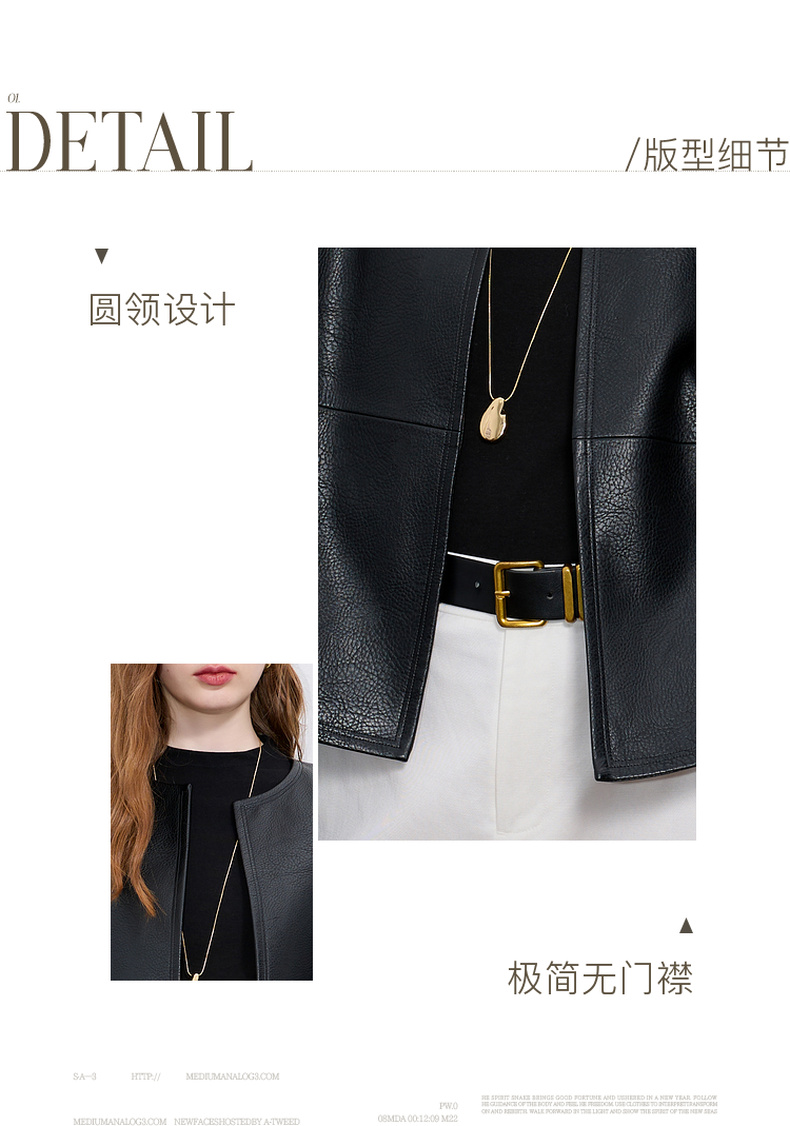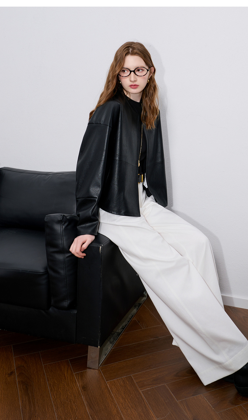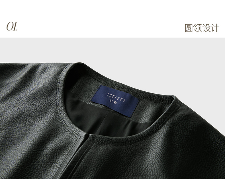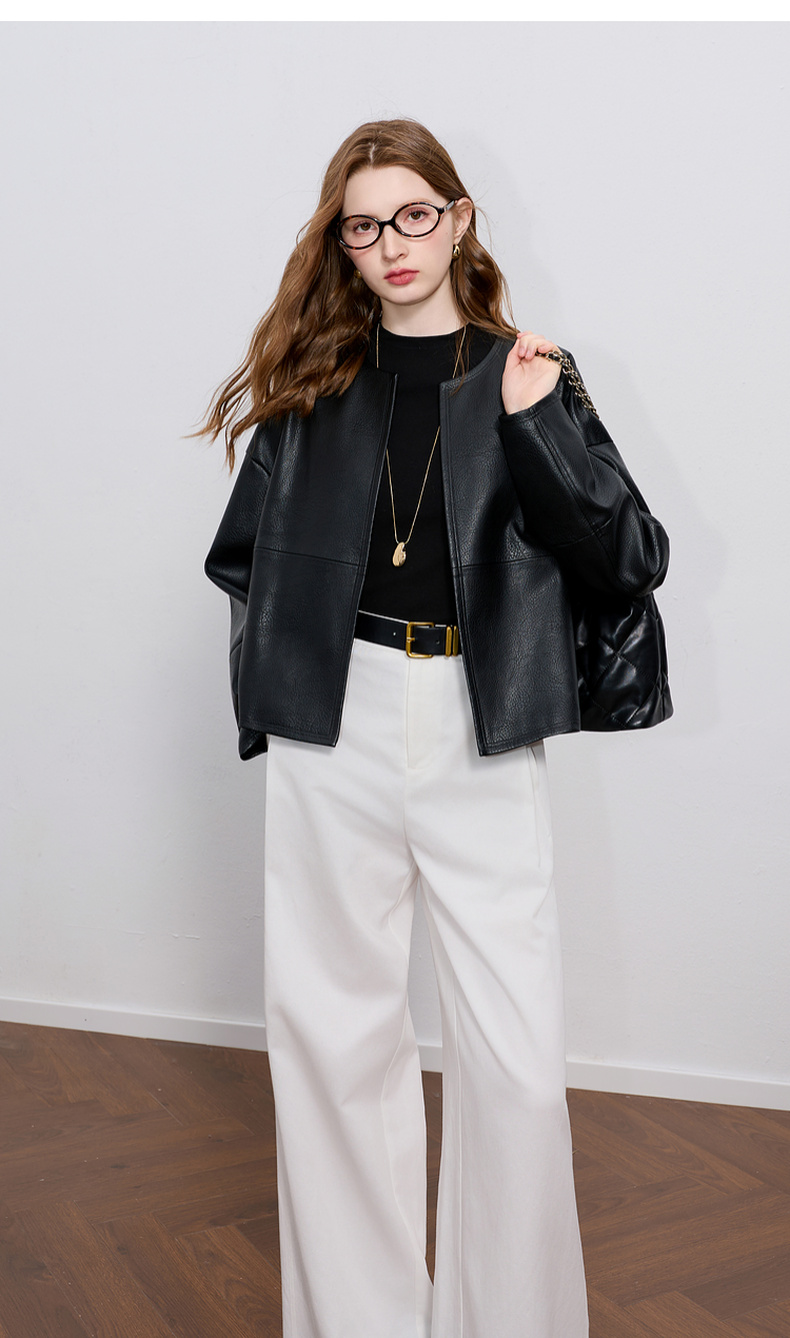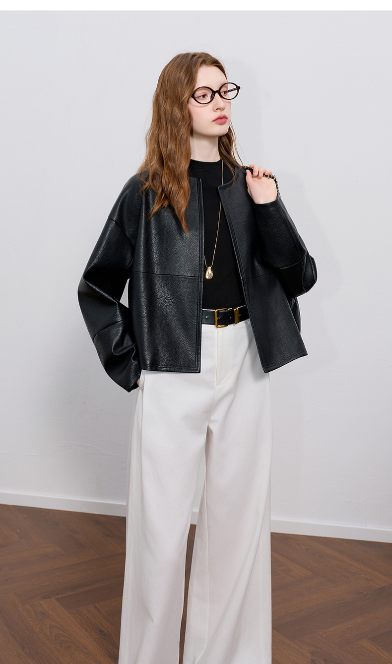 三彩2025秋季新款皮衣PU外套荔枝纹圆领宽松极简老钱S