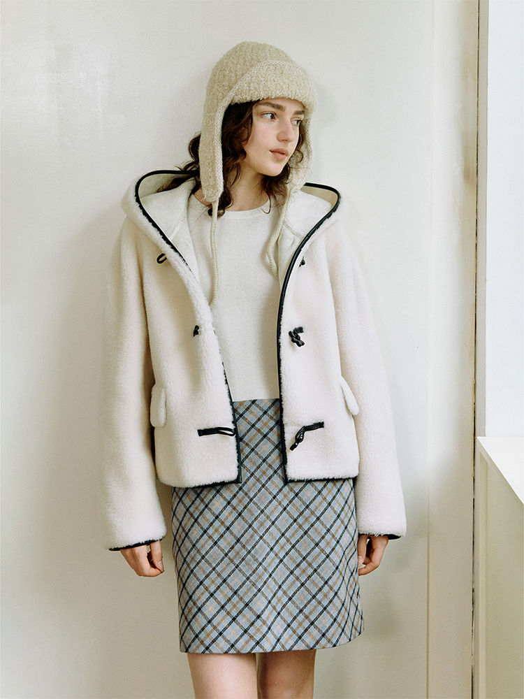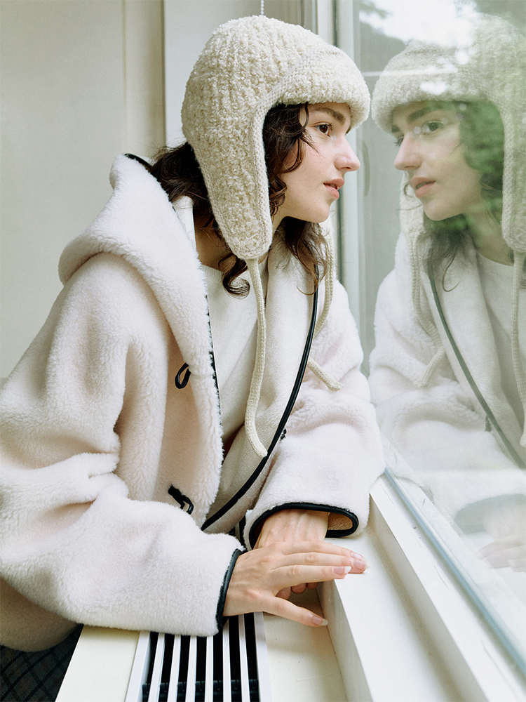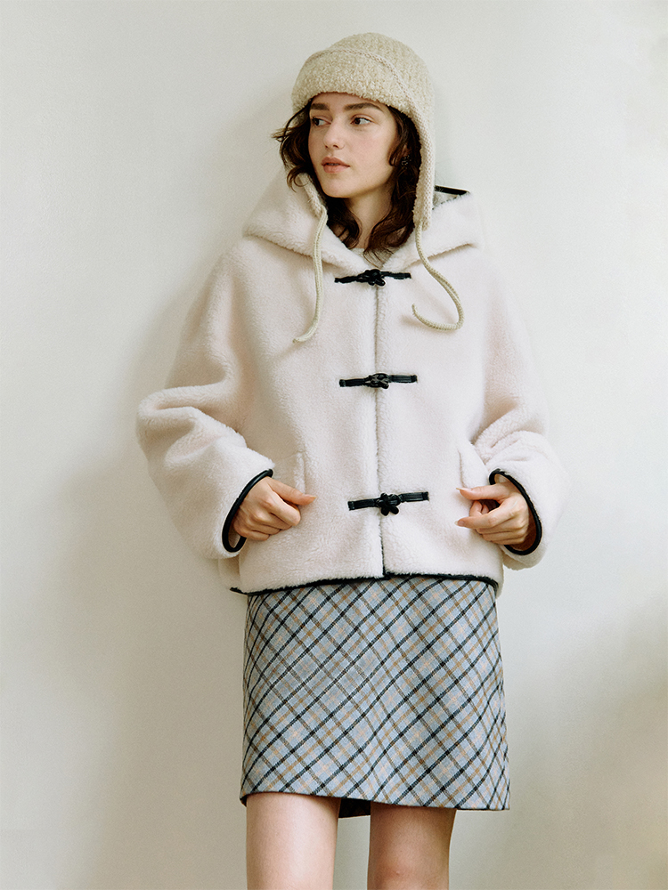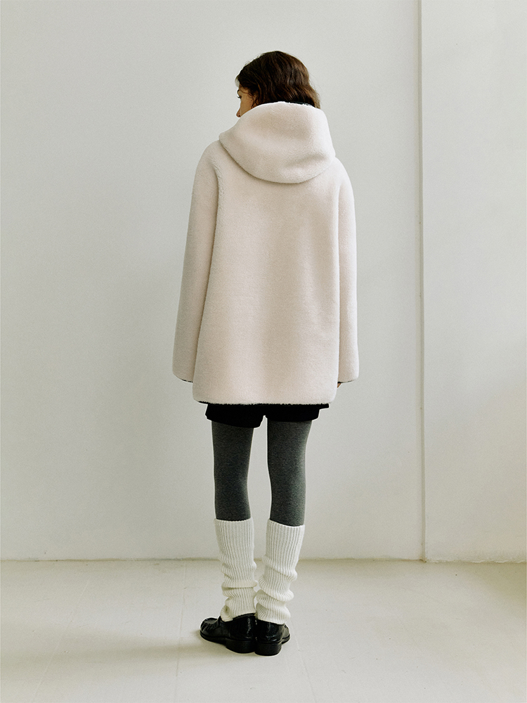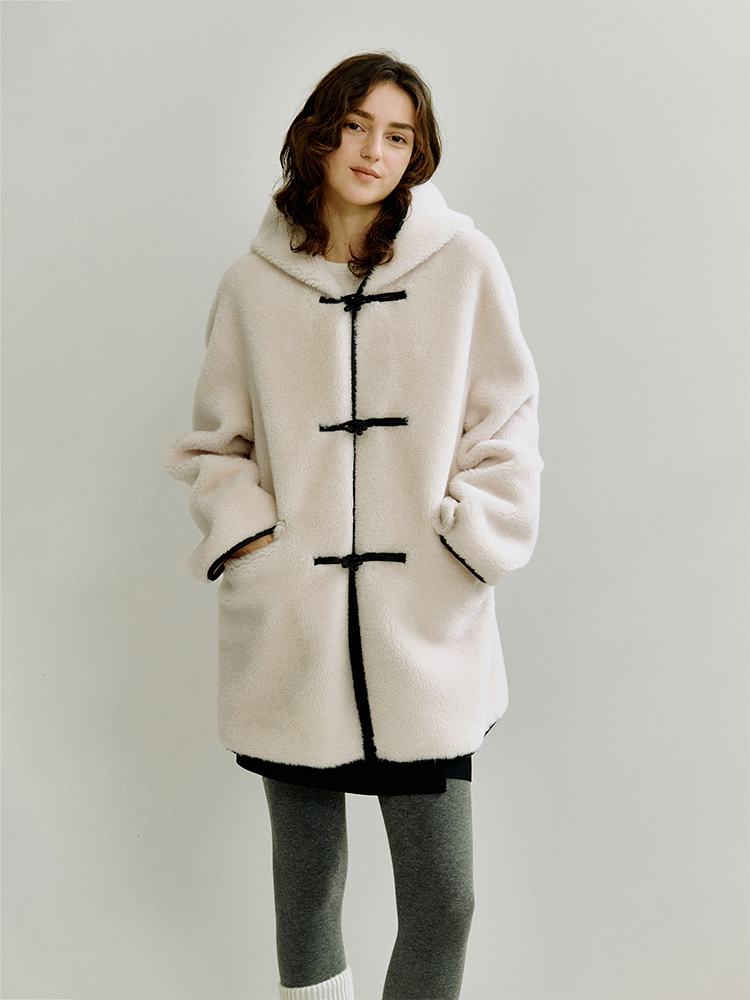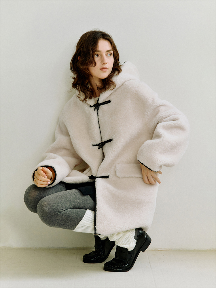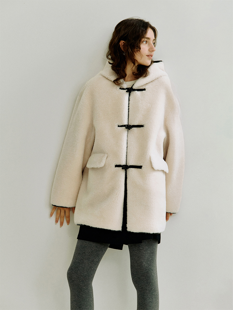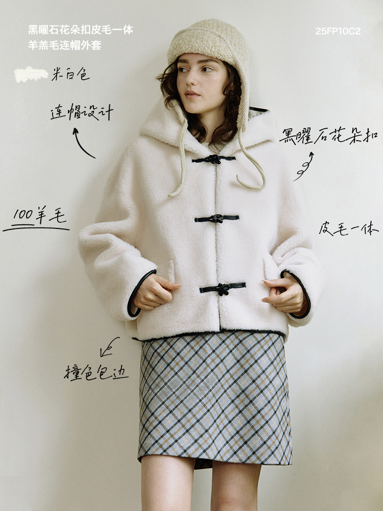 ForPoem 现货 25/FW原创设计黑曜石花朵扣皮毛一体羊羔毛连帽外套