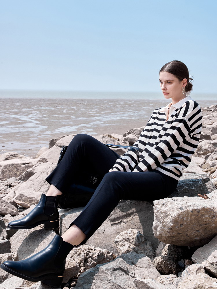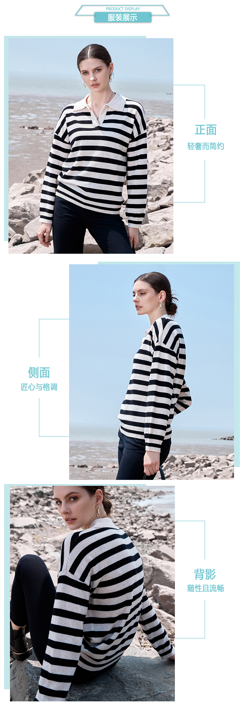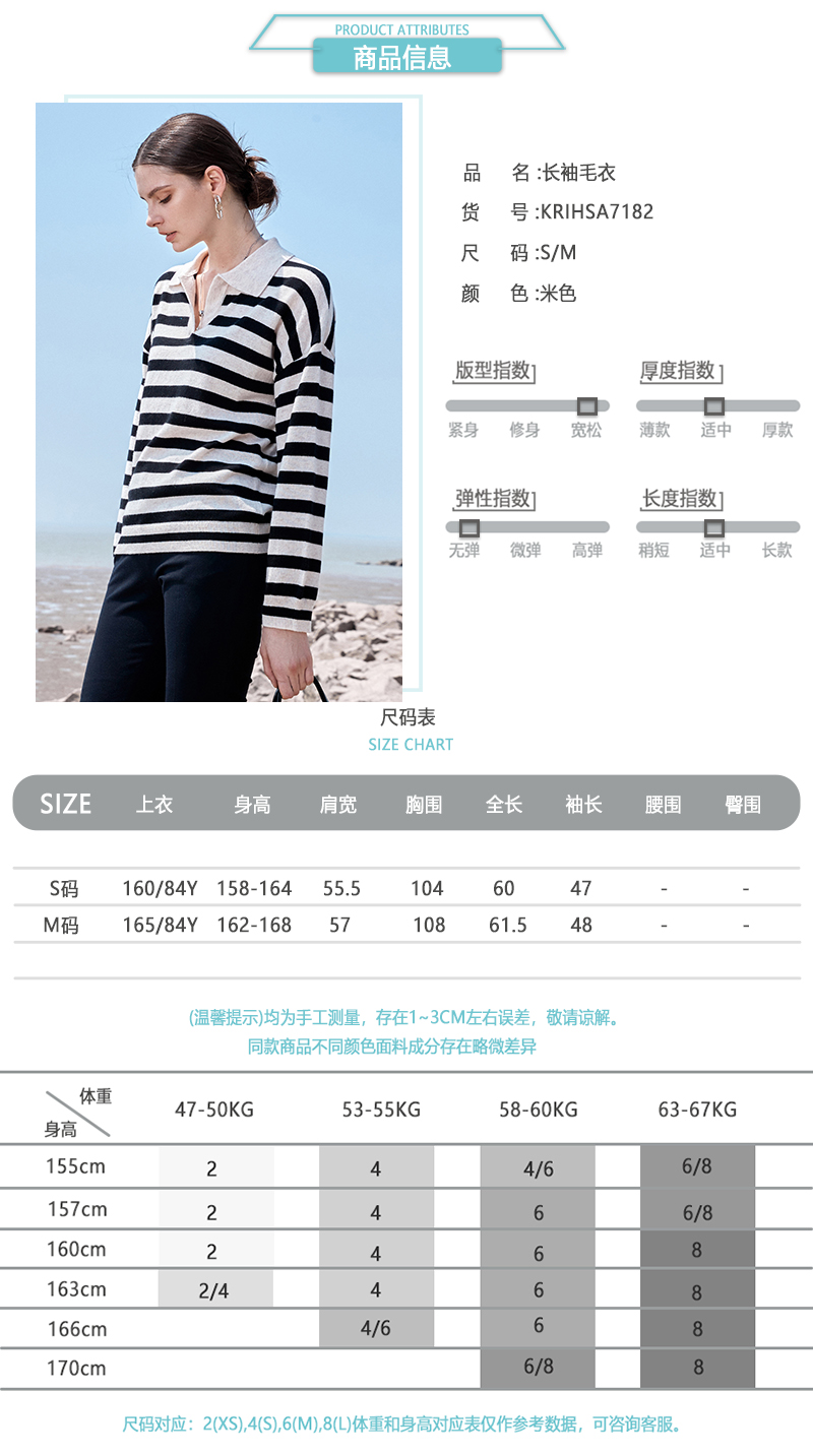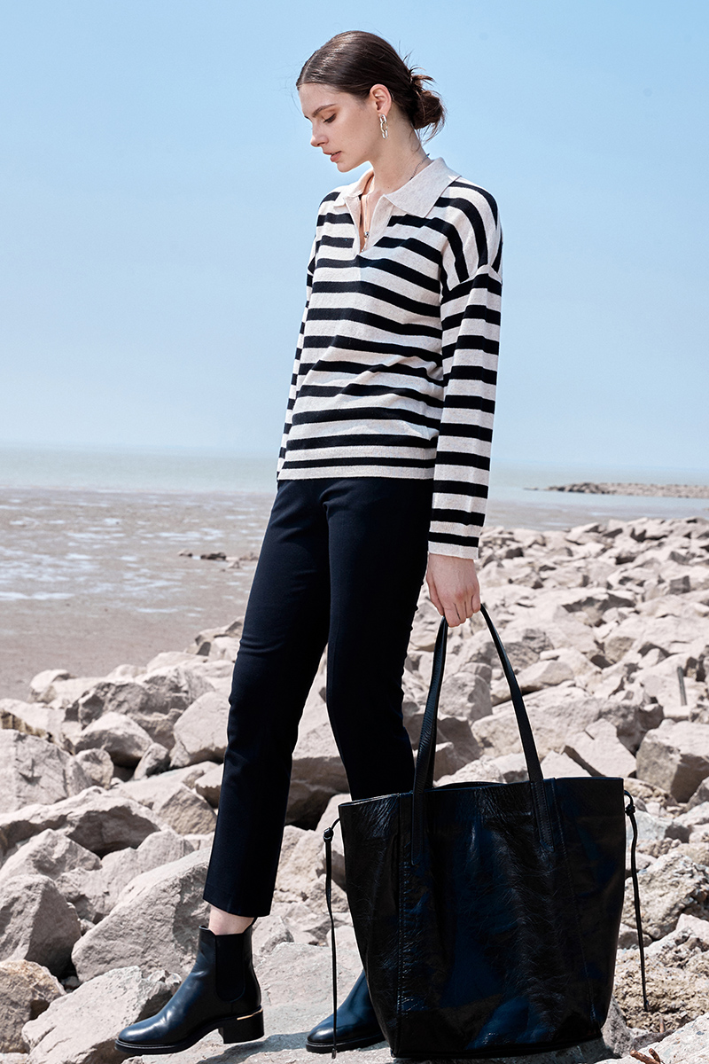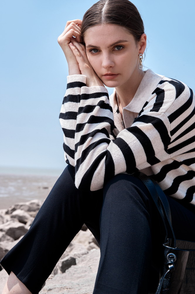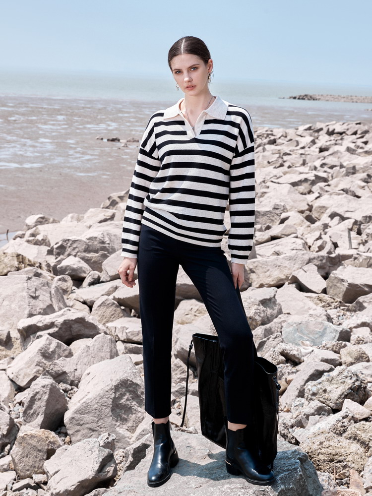 ICB日系春季通勤羊毛羊绒混纺方领套头条纹毛衣针织毛衫商场同款
