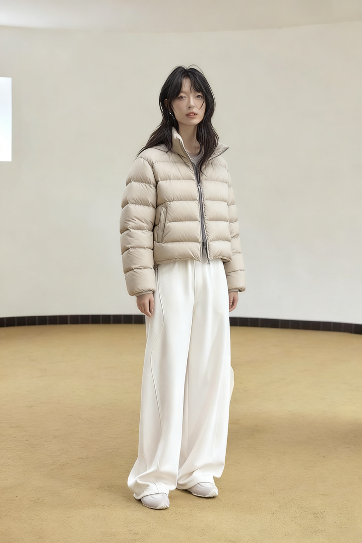 搭配短款羽绒服/大衣, 上半身是厚重的深色外套。正好用这条白色裤子来提亮整体造型,打破沉闷,显得轻盈又时髦。