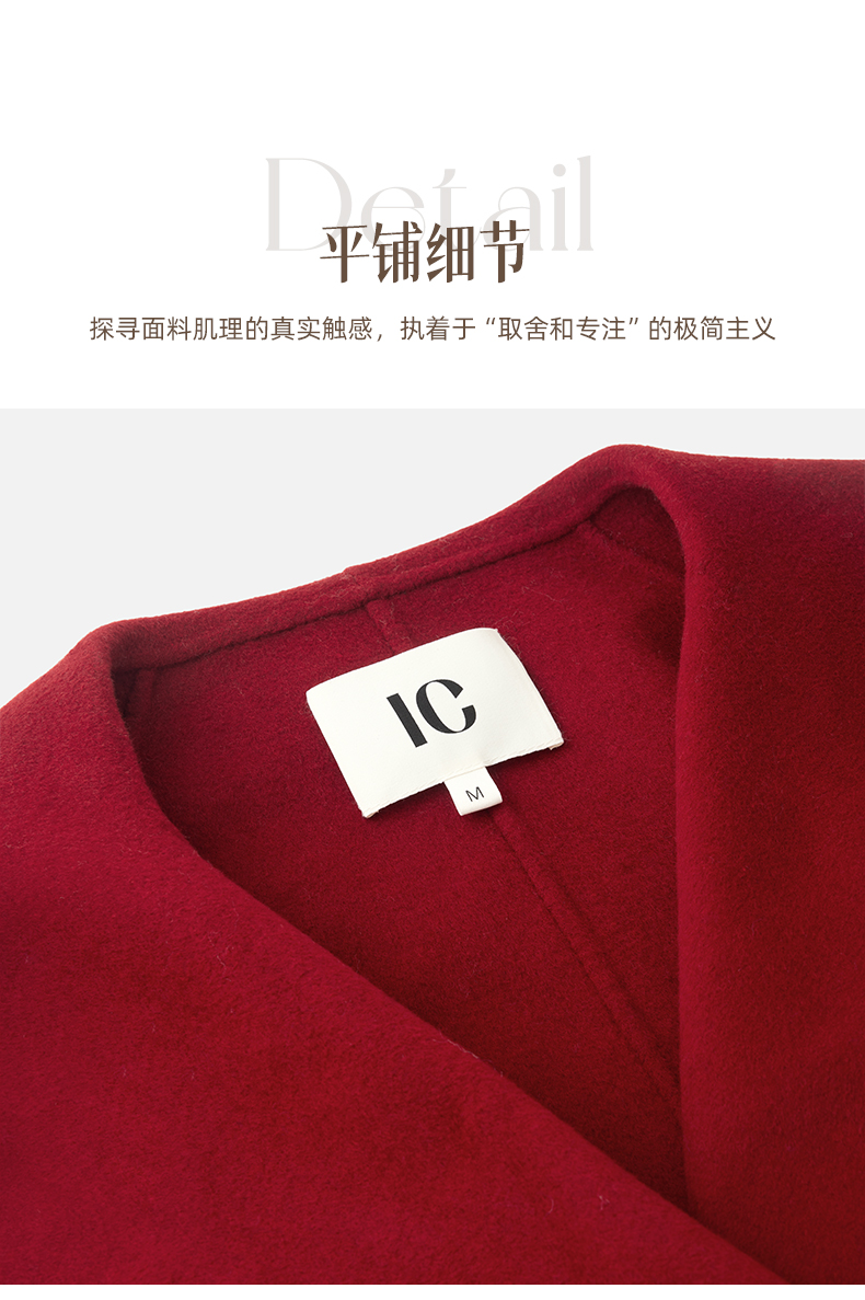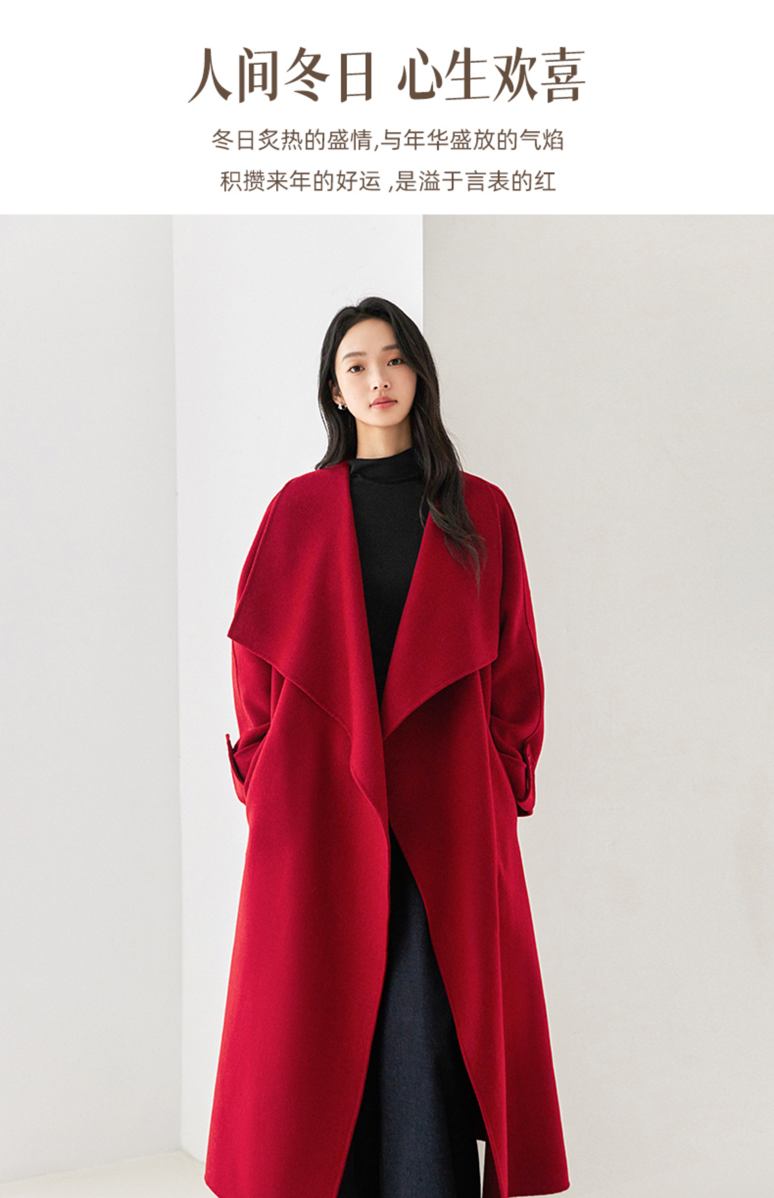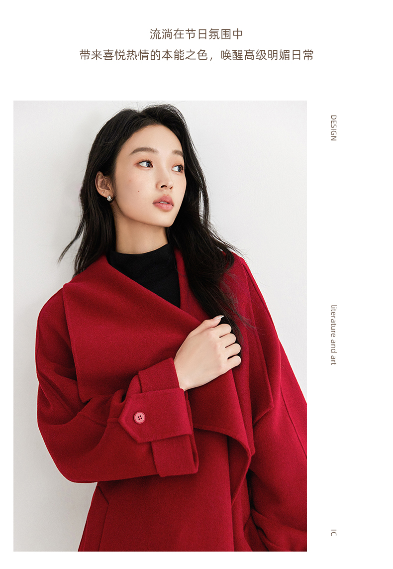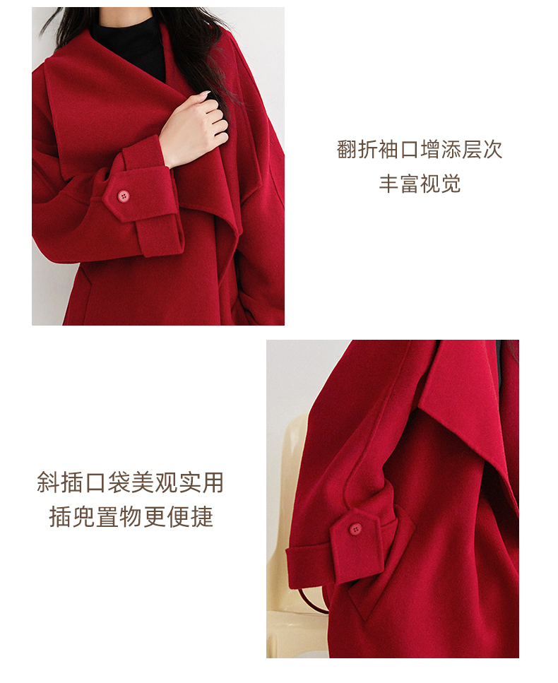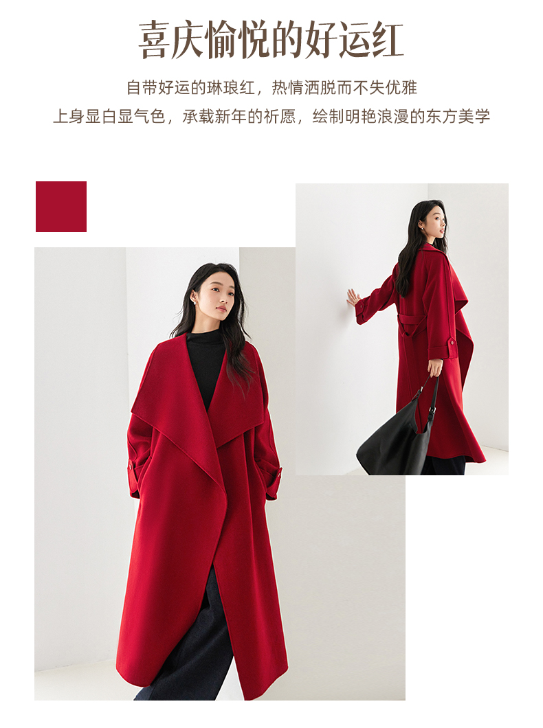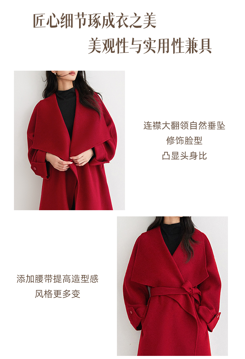 IC 秋冬红色轻奢大翻领长款双面呢大衣女新款高级感毛呢外套