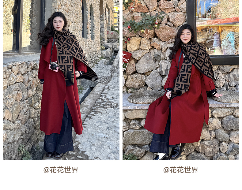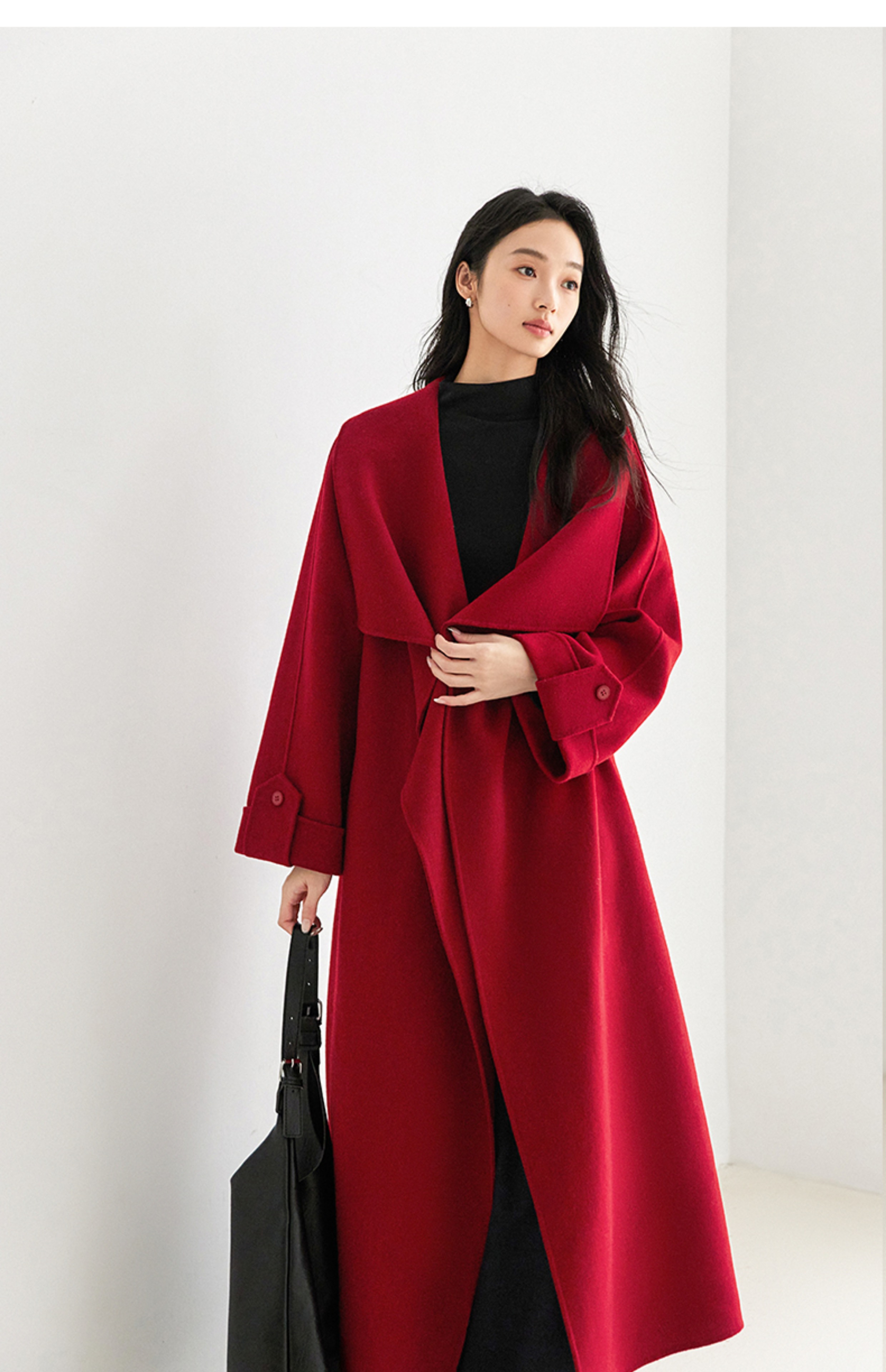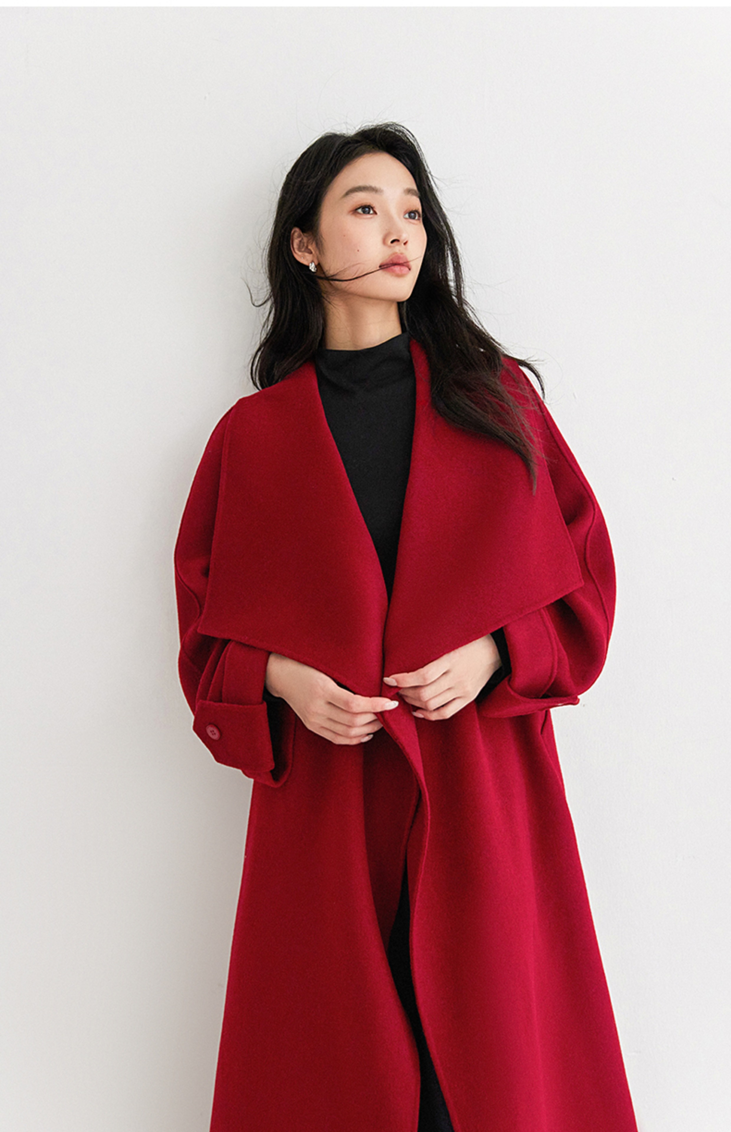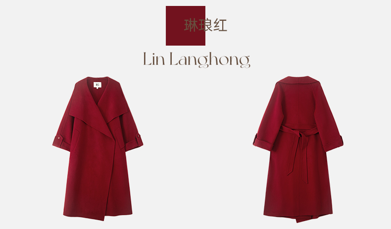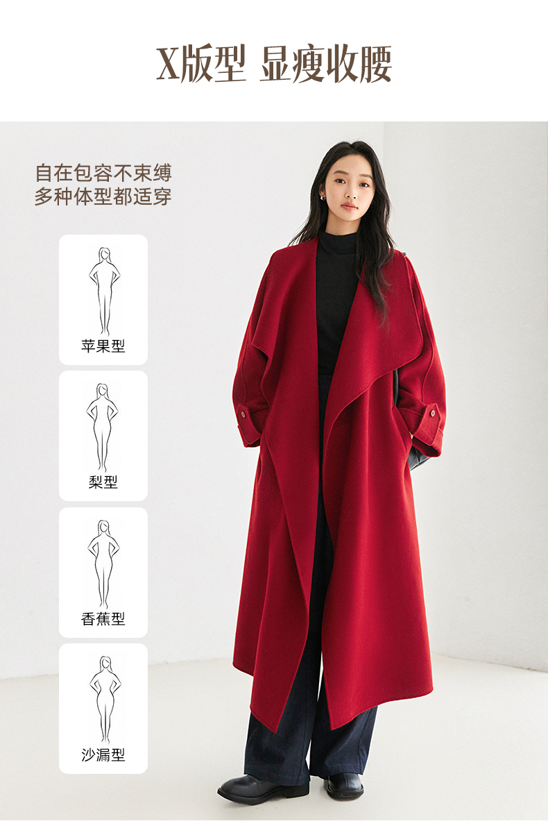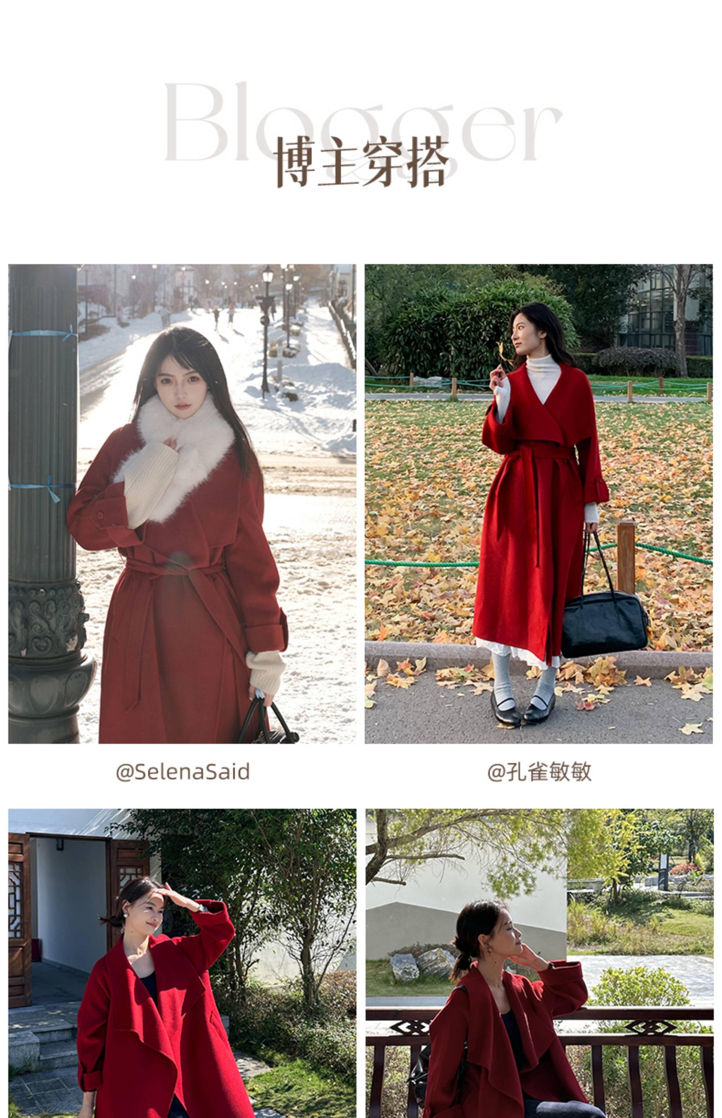 IC 秋冬红色轻奢大翻领长款双面呢大衣女新款高级感毛呢外套