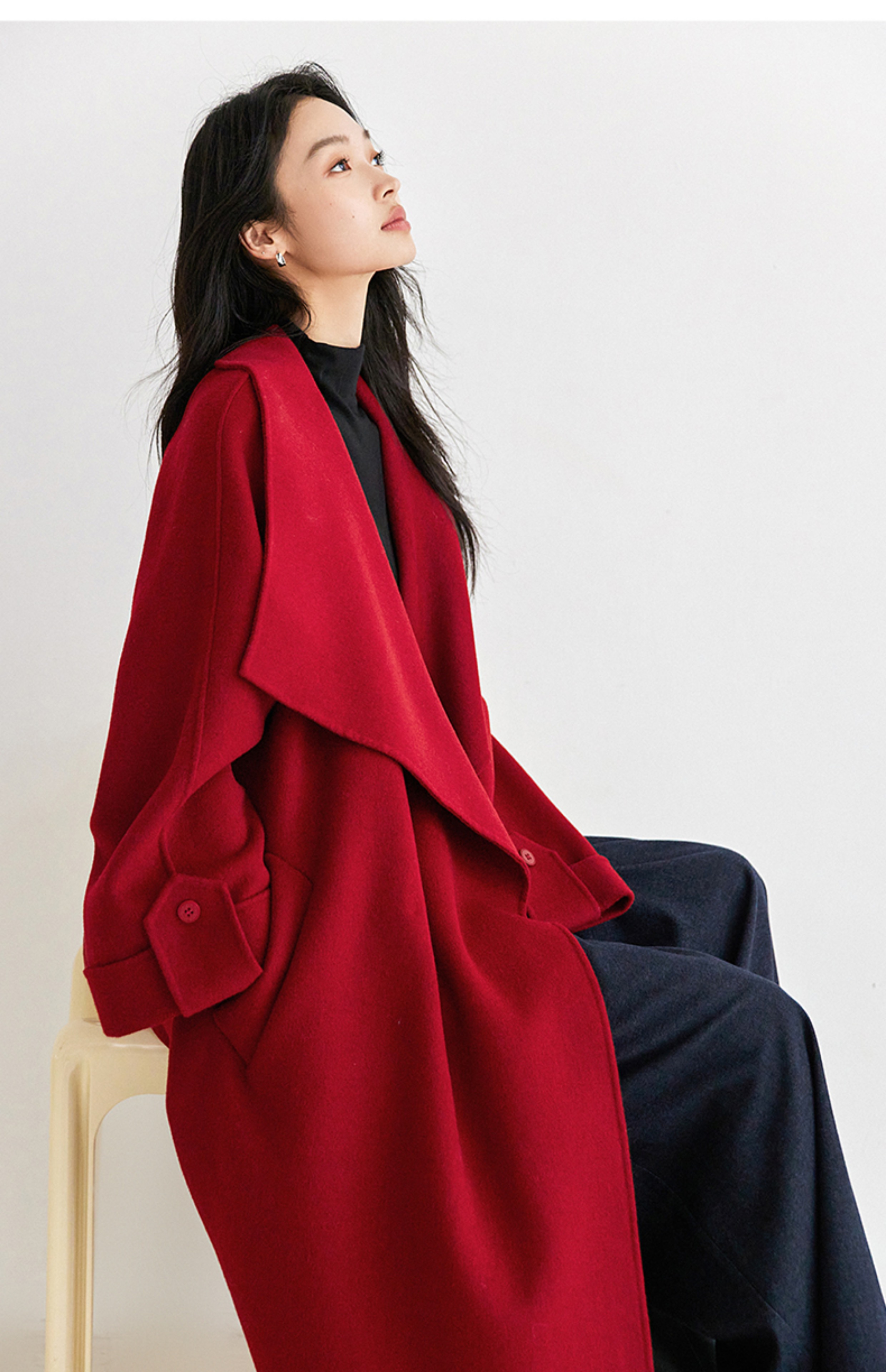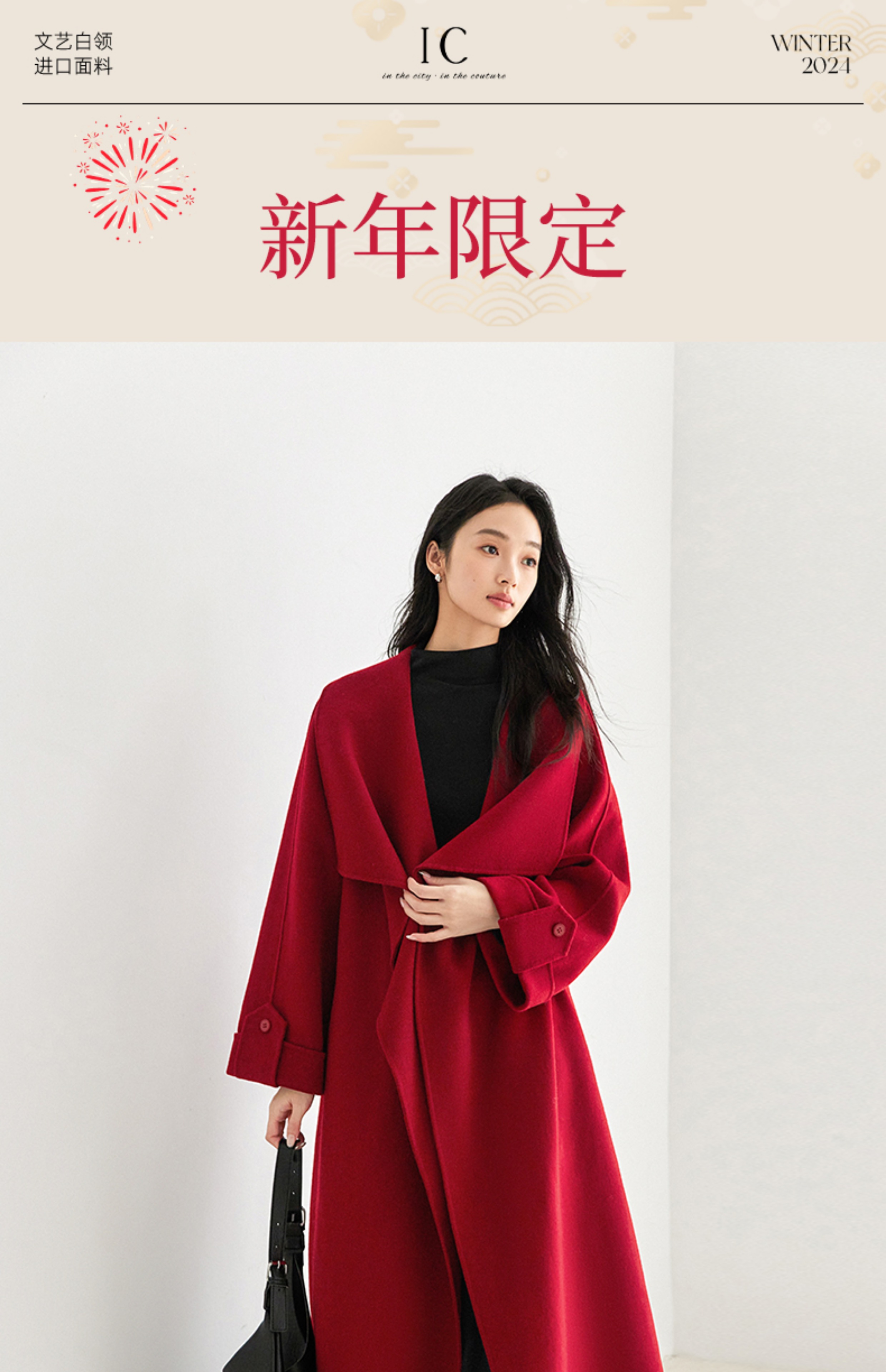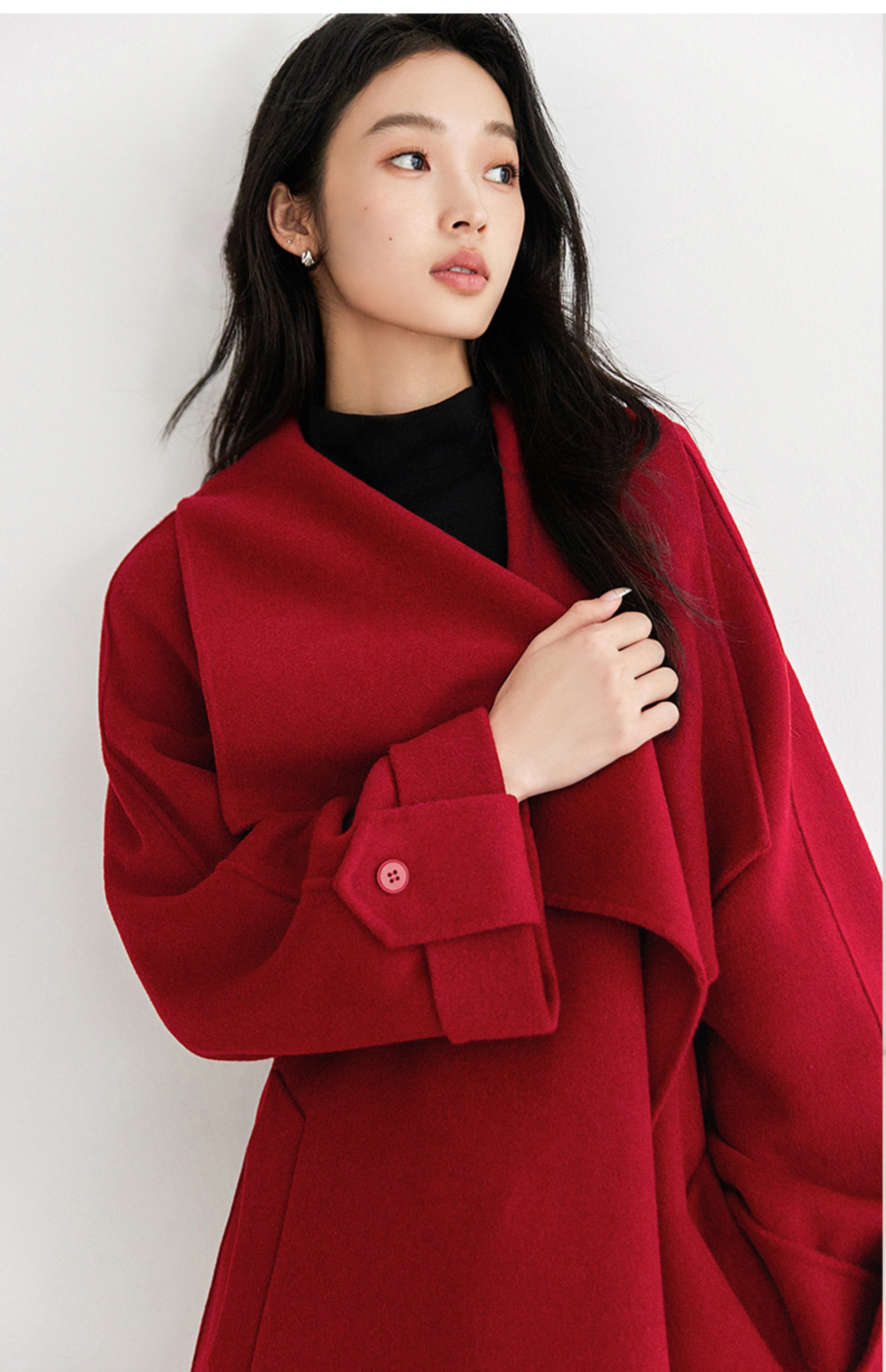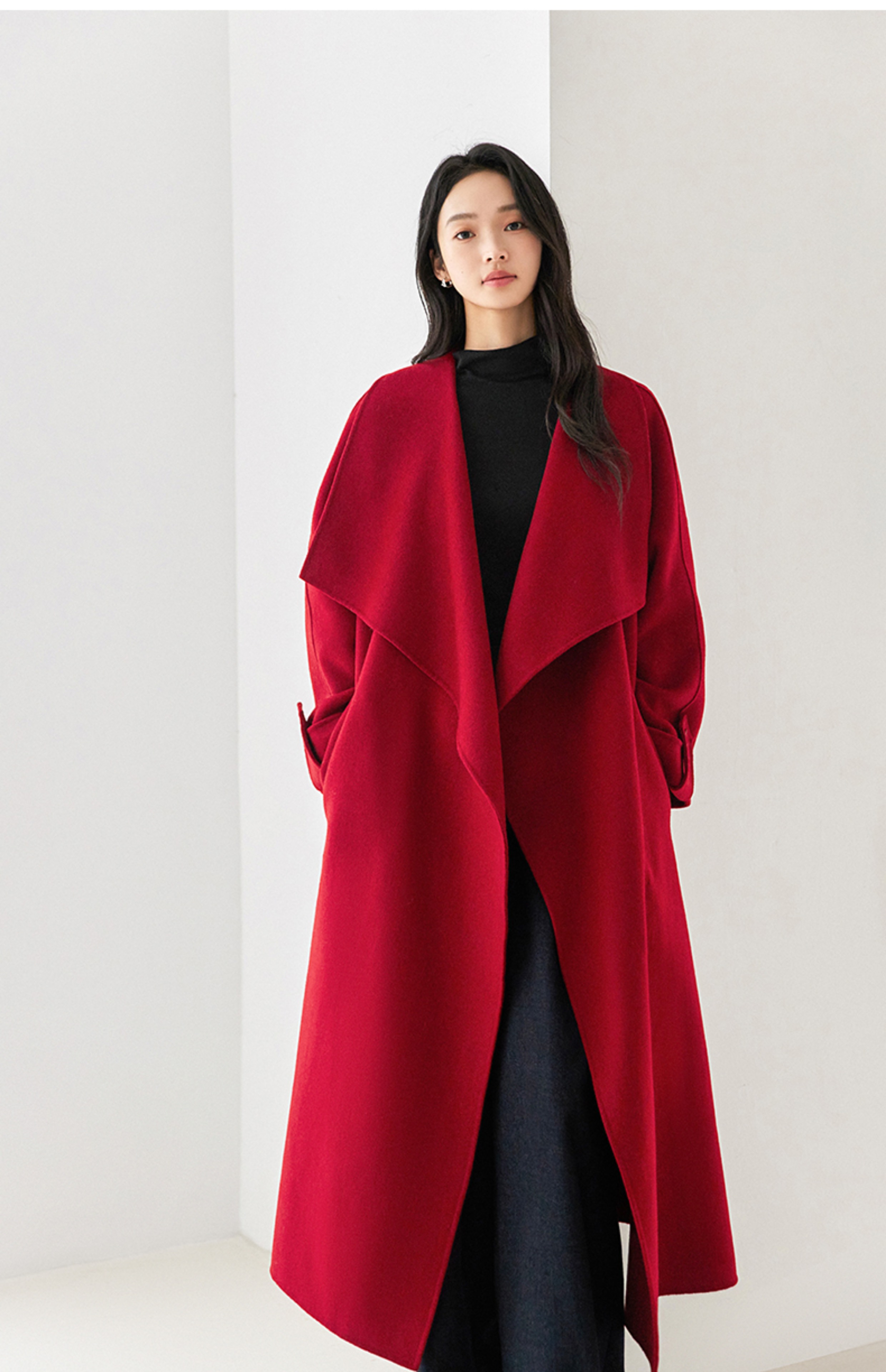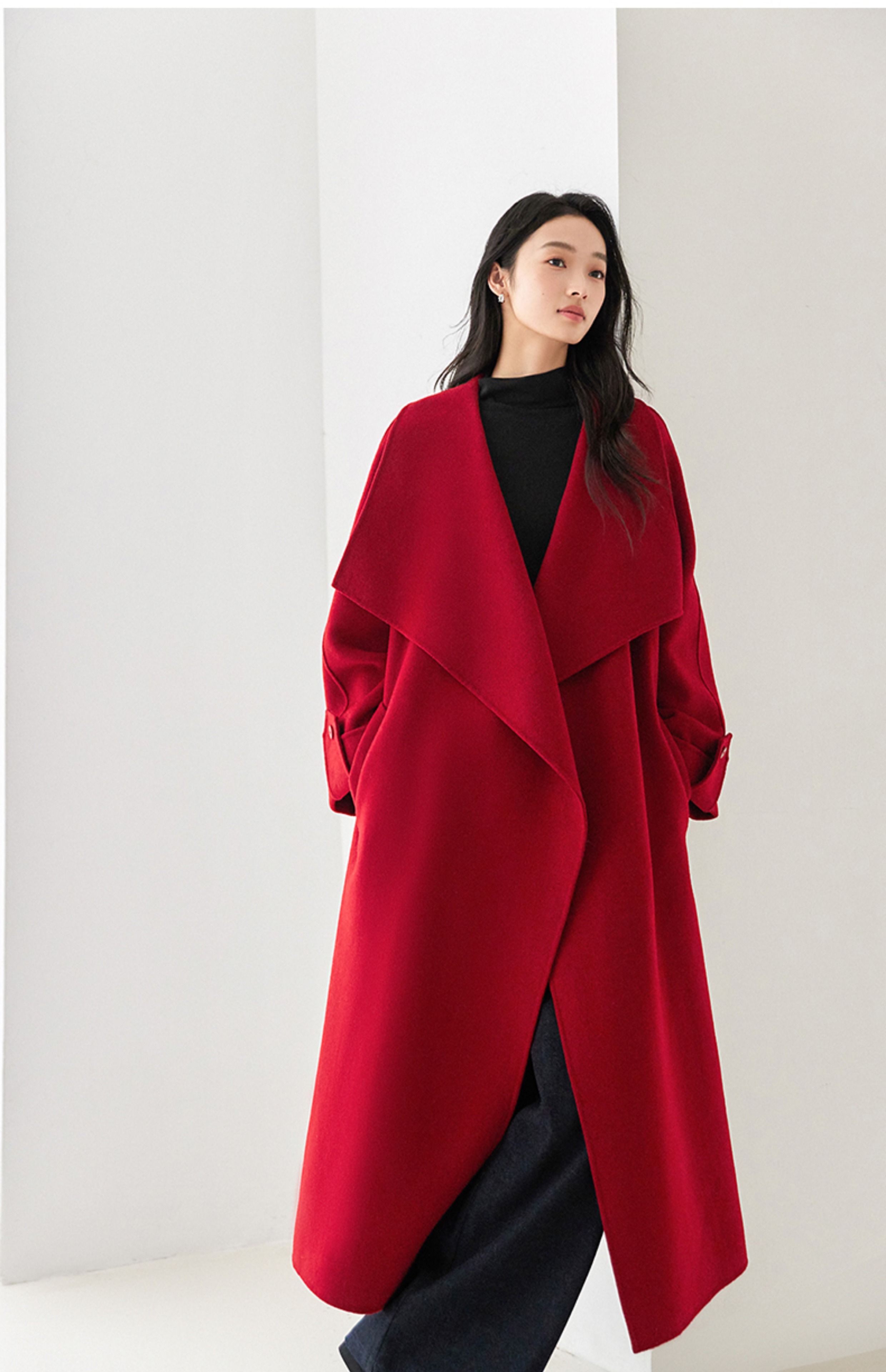 IC 秋冬红色轻奢大翻领长款双面呢大衣女新款高级感毛呢外套