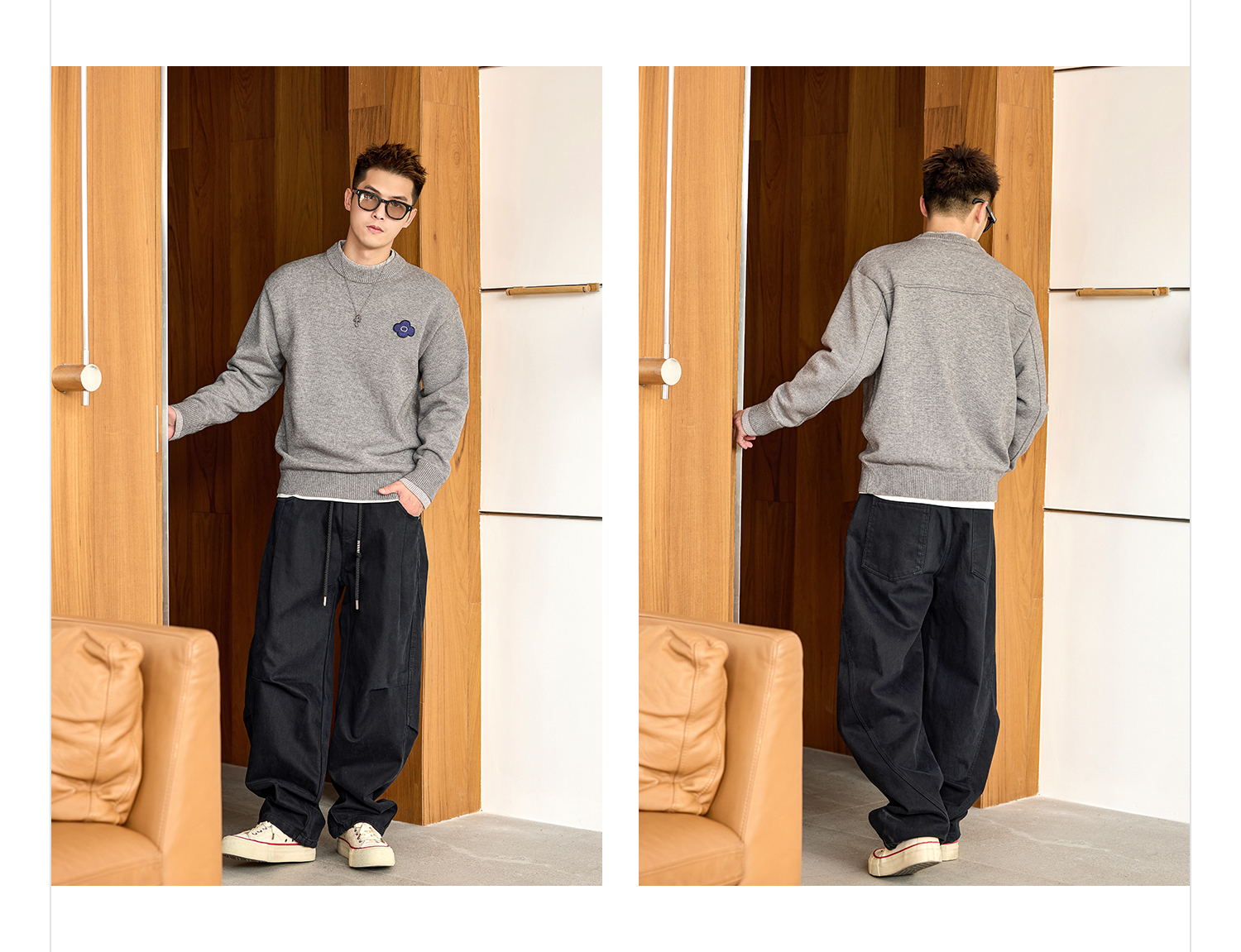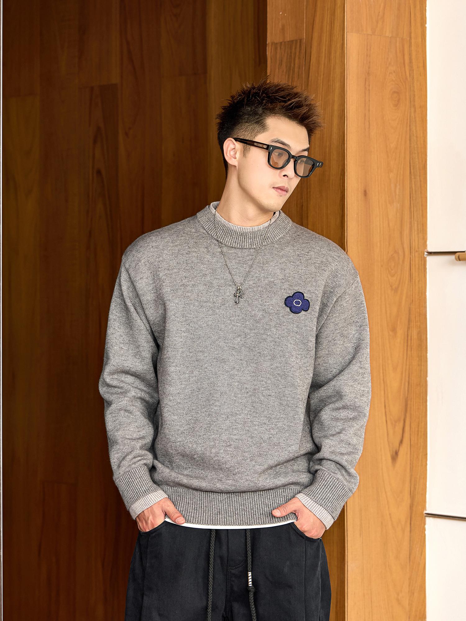 徐太浪【假两件圆领 花朵刺绣】套头毛衣男秋冬款大码针织衫上衣