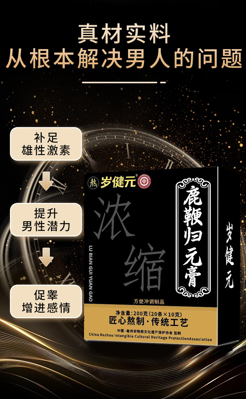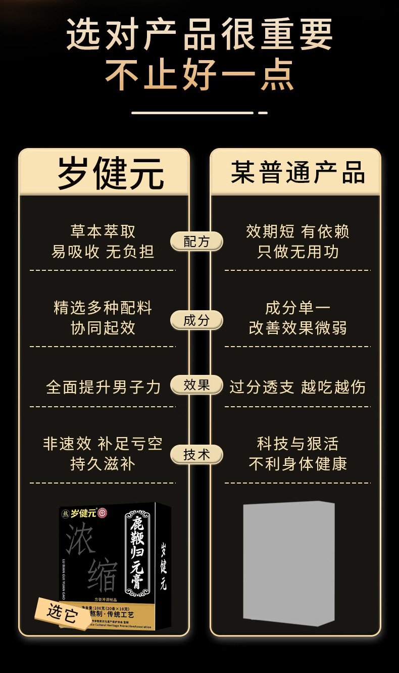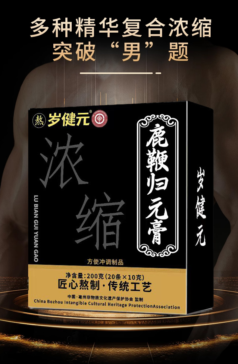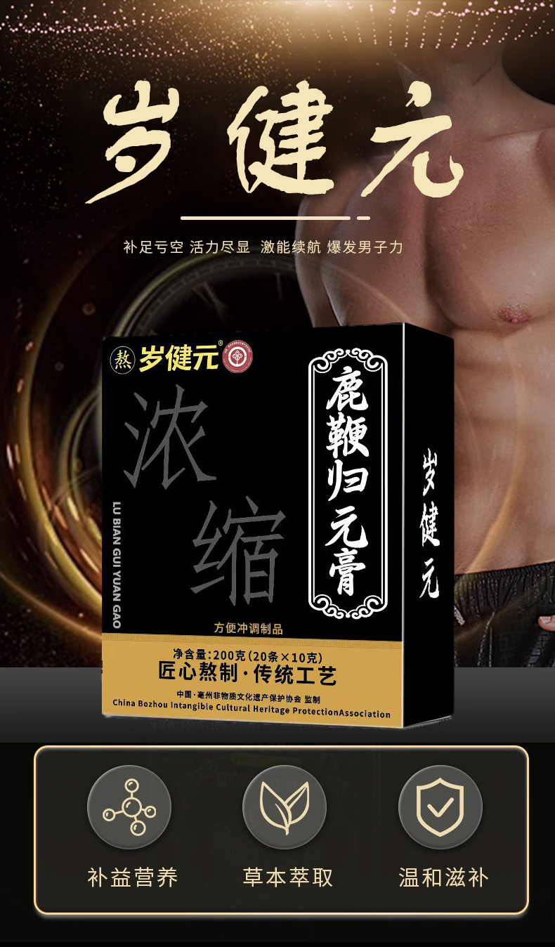 岁健元是膏滋产品,拥有调养身体之效。岁健元是最为适合男性滋补的一款膏体,品牌特别将人参、鹿鞭、黄精、肉苁蓉等多重草本萃取精华成分按照科学配比并经过多道工序浓缩制作得到,膏体粘稠,口感清香。最为重要的是,其中富含人体所需要的多重氨基酸、微量元素以及维生素等营养成分,能够快速的补充身体能量,保持体能充沛精力充足,又能够达到补肾壮阳强体质的作用。