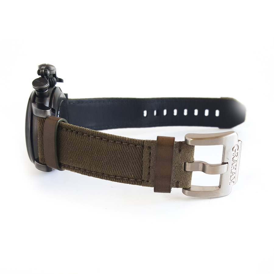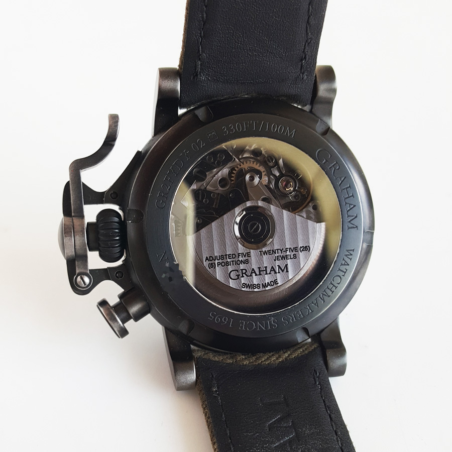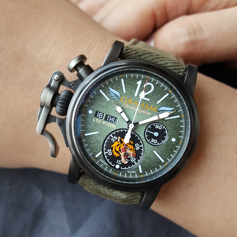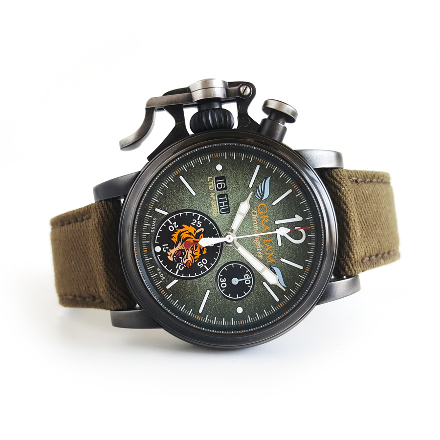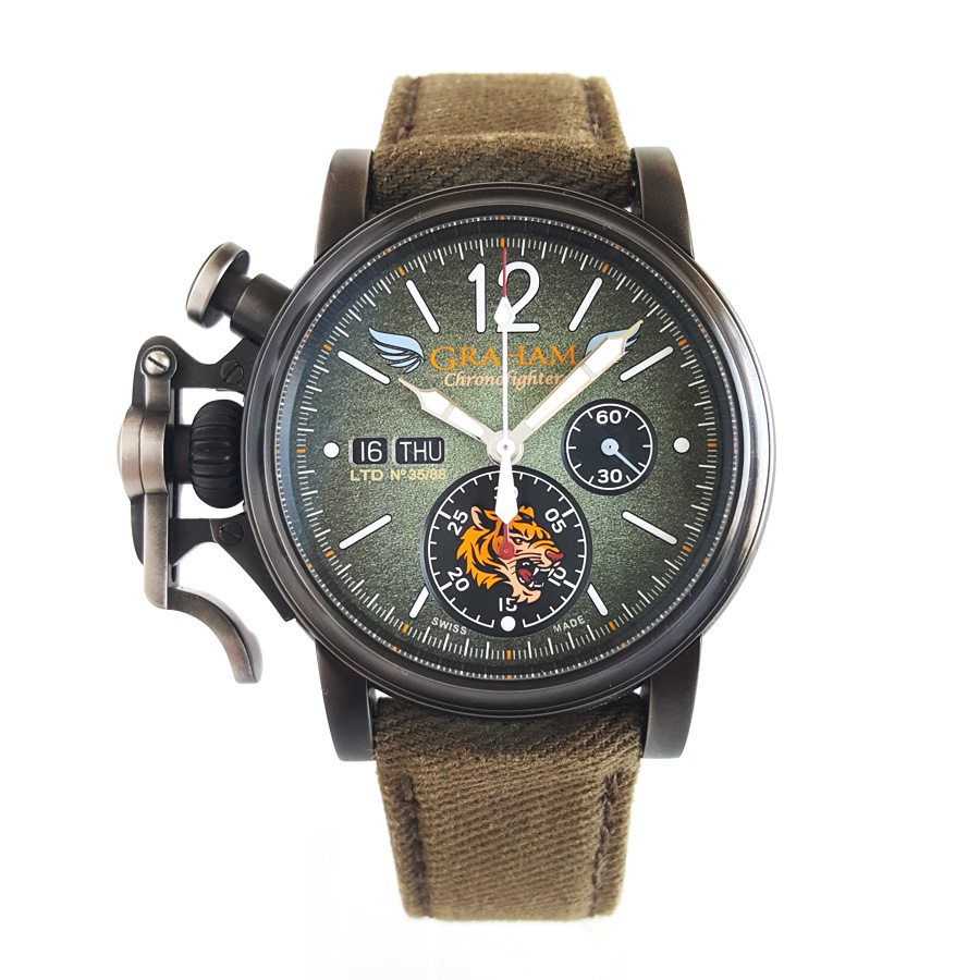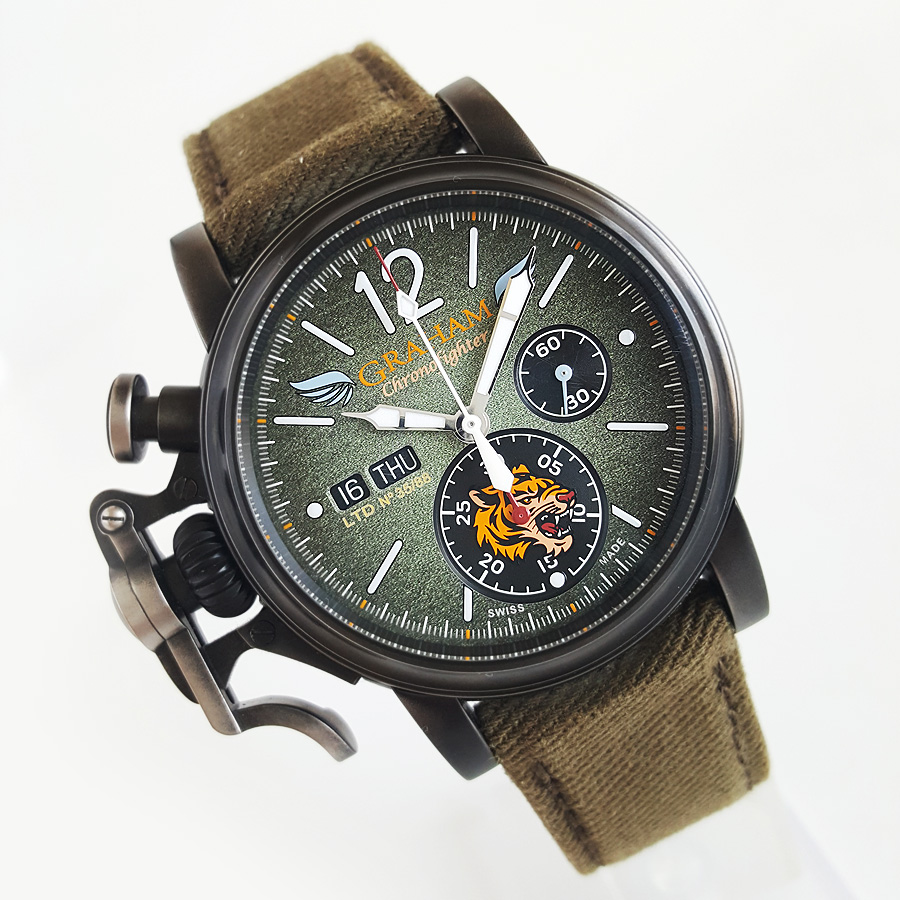 特别说明 | 日常生活防水;此款腕表为限量款,灵感来源于飞虎队,表达了对这支传奇飞行队伍的崇高敬意。Graham通过渐变的军绿色表盘,不锈钢表壳的黑色PVD镀层,在品牌Chronofighter系列中表达出一种特殊的经典复古魅力,以及超越腕表本身的英雄主义! |