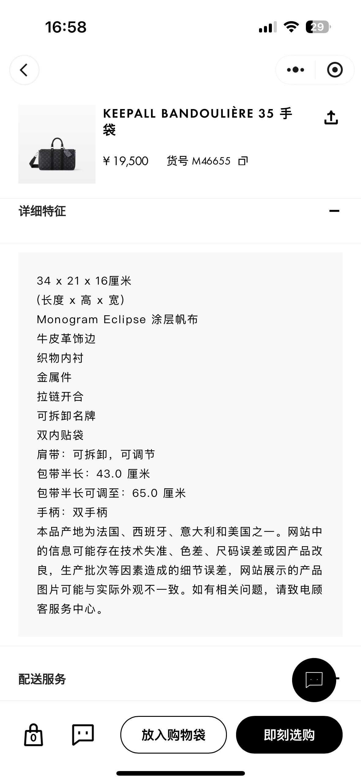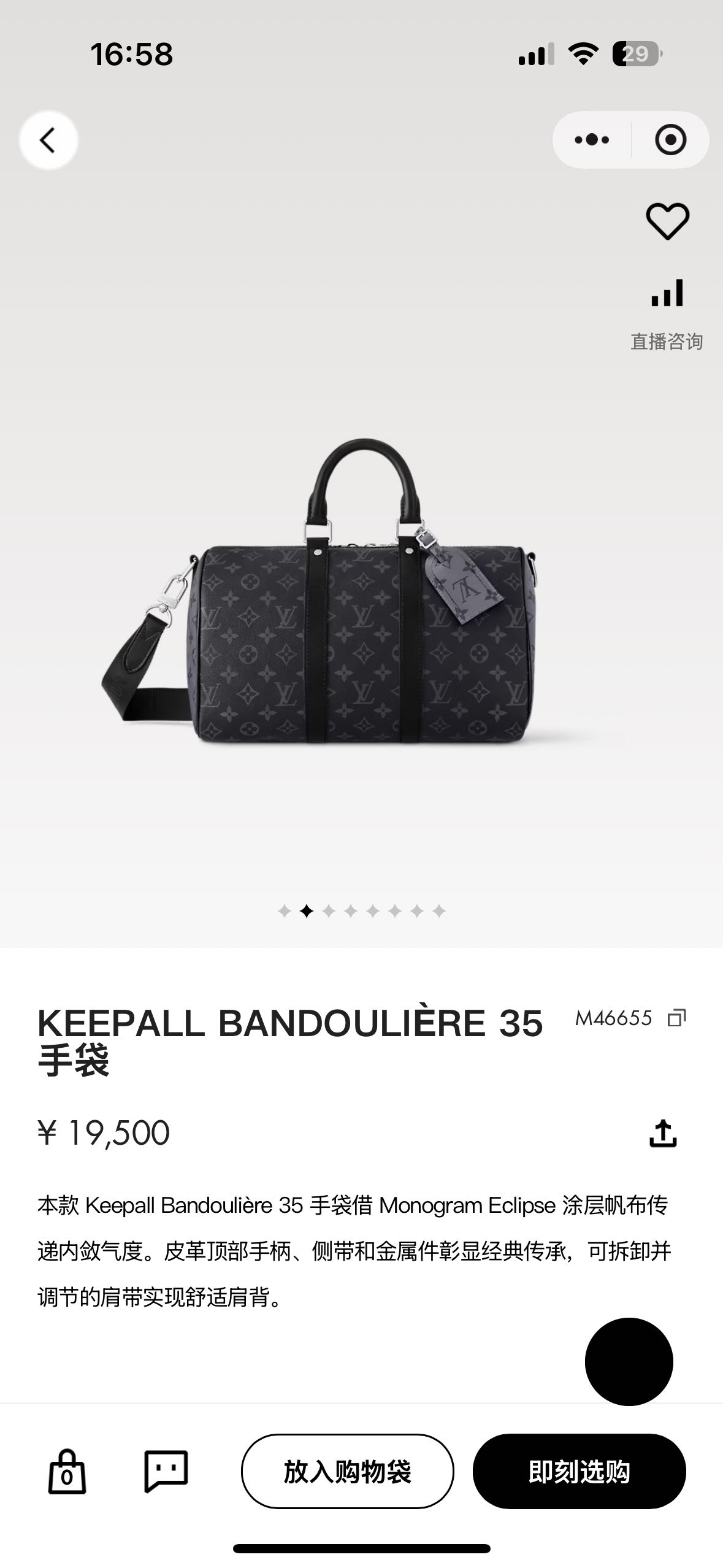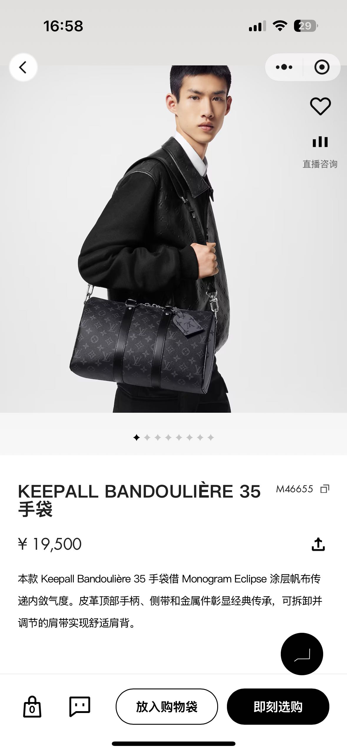 本款Keepall Bandoulière35手袋借Monogram Eclipse涂层帆布传递内敛气度。皮革顶部手柄、侧带和金属件彰显经典传承,可拆卸并调节的肩带实现舒适肩背。