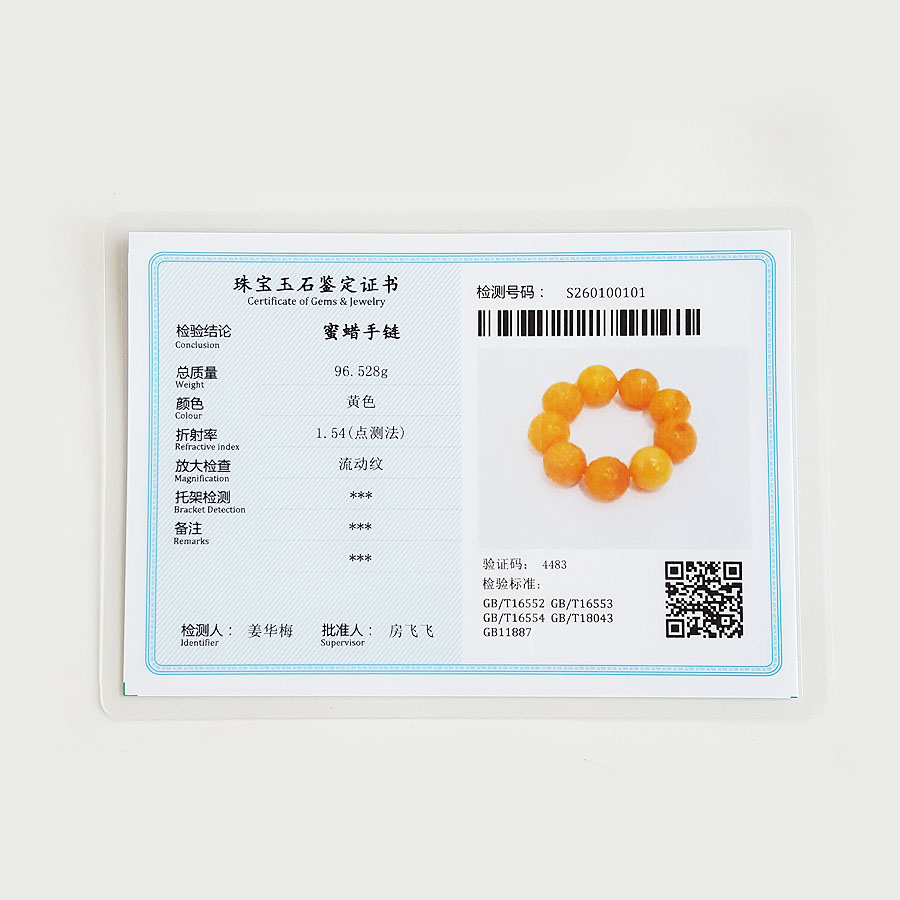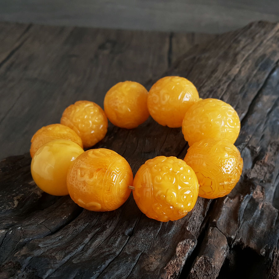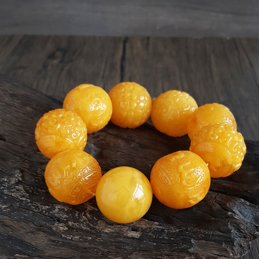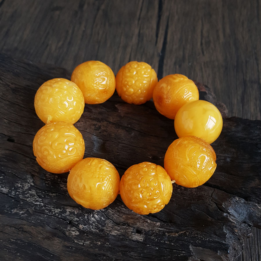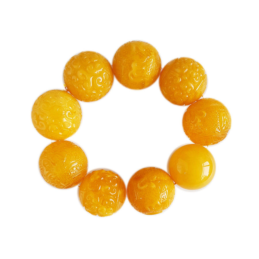 【天然正品】天然精品无杂裂鸡油黄约26-28MM刻如意纹蜜蜡手串17CM(弹力绳)060126NJS04