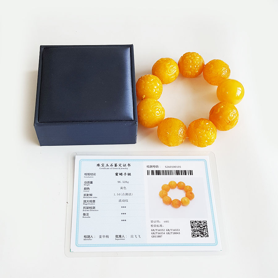 名称 | 天然精品无杂裂鸡油黄约26-28MM刻如意纹蜜蜡手串 |