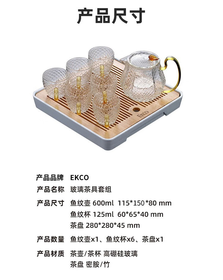 康宁玻璃茶具套装家用泡茶神器功夫茶杯鱼纹茶具会客茶壶小套组 EKCO鱼纹茶具