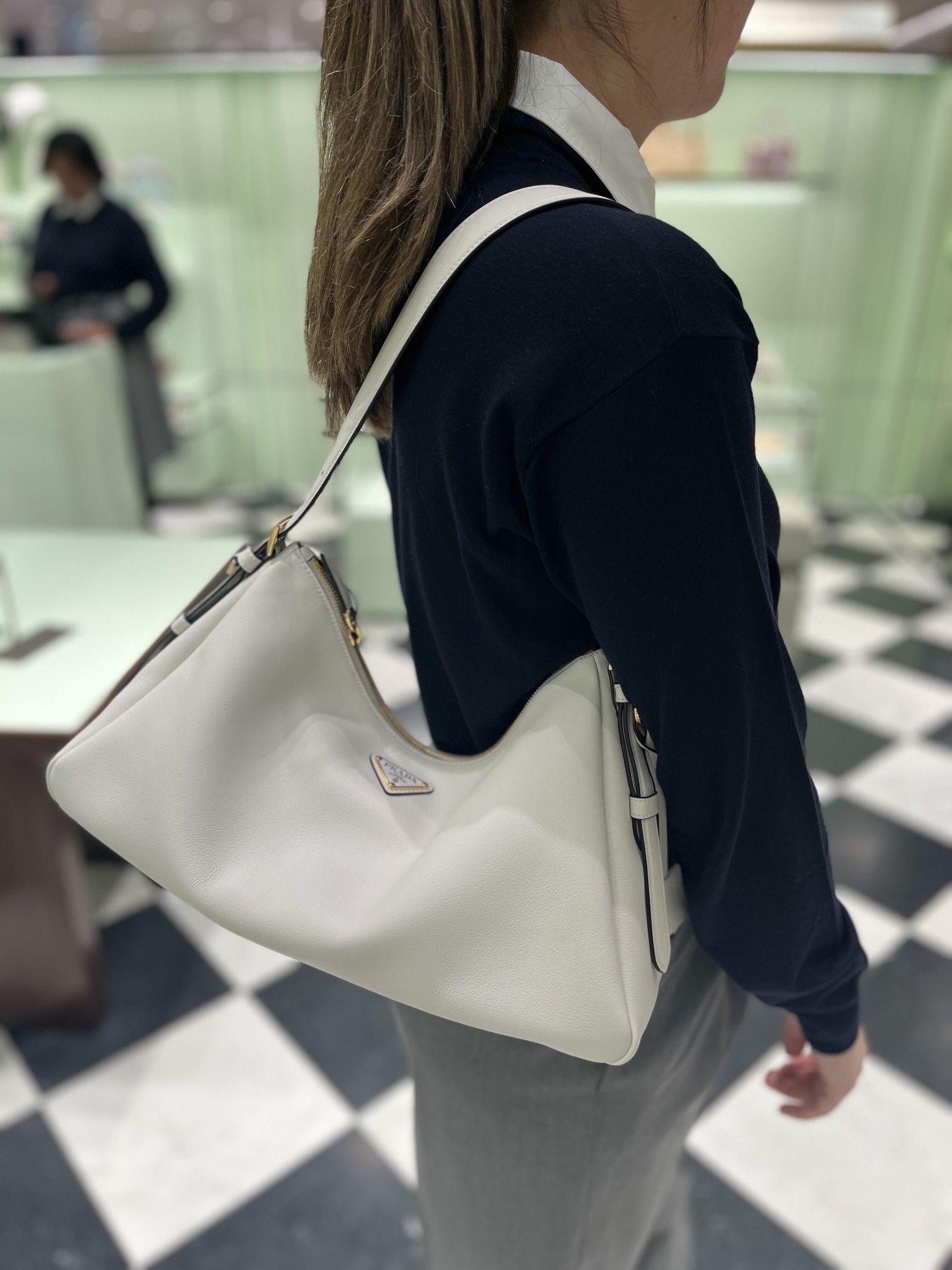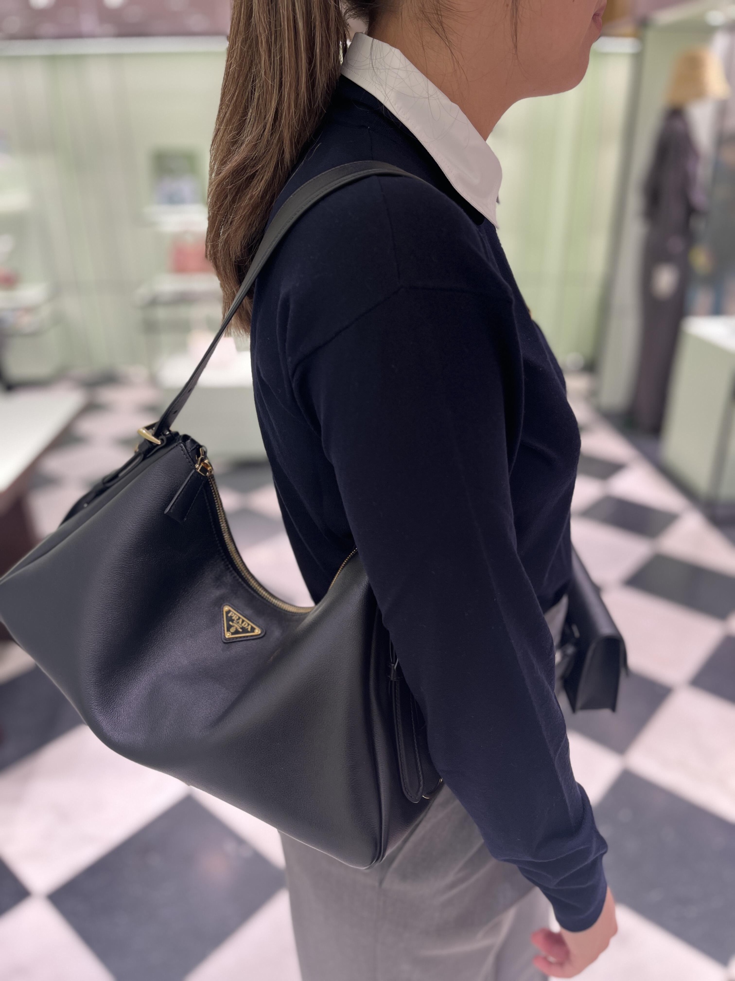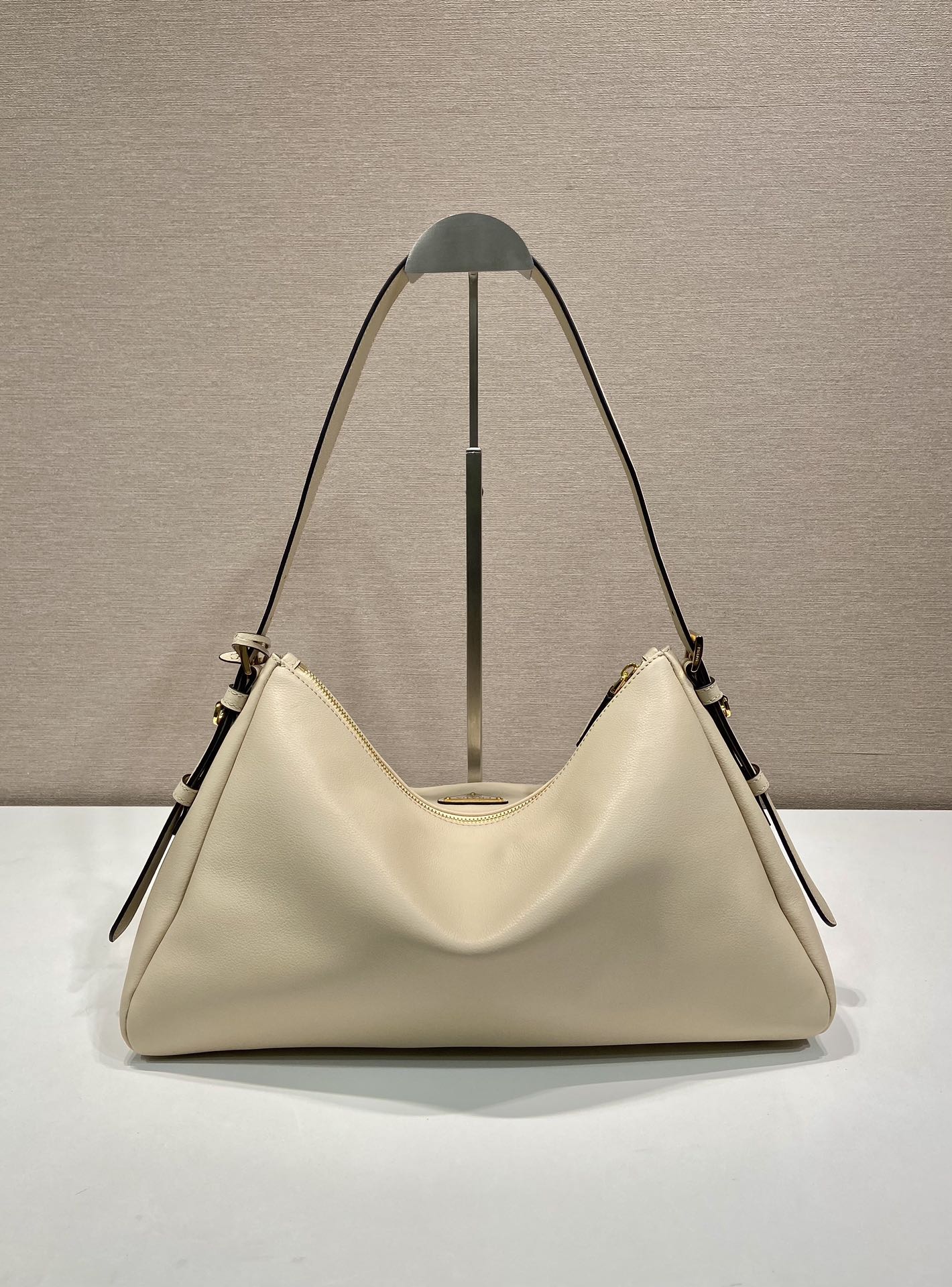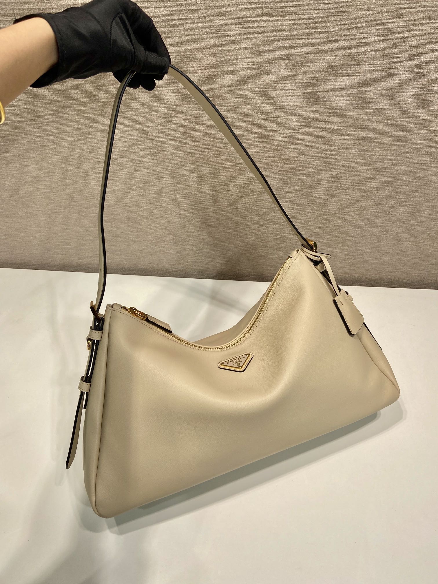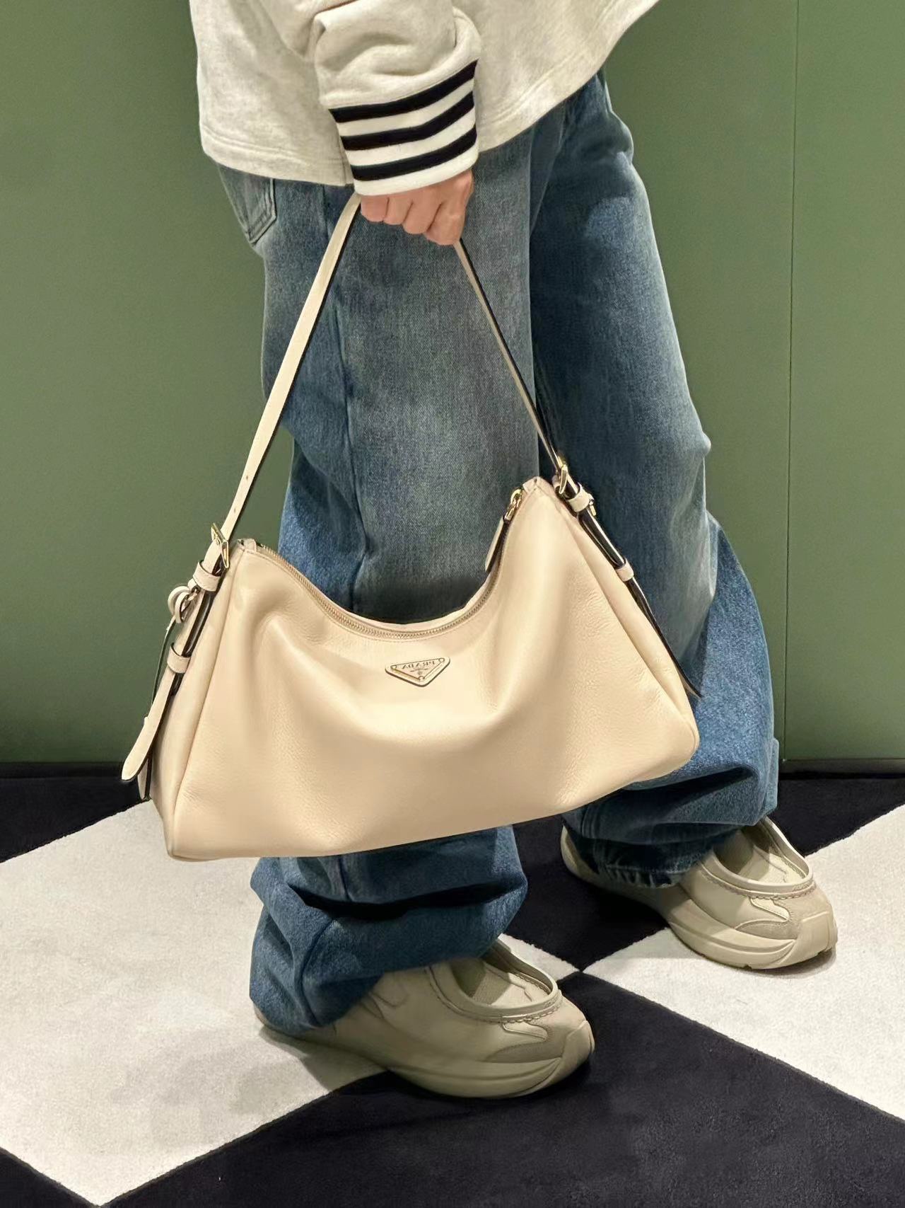 原厂皮 新款Aimee腋下包这款皮革Hobo腋下包设计气质简约,采用进口小牛皮,正面金属三角形珐琅徽标,配有可拆卸皮革肩带,皮质细腻柔软,实用轻便容量空间大高级百搭,又一个时尚爆款。赶紧入手吧,太美了 长39x高24x底12cm