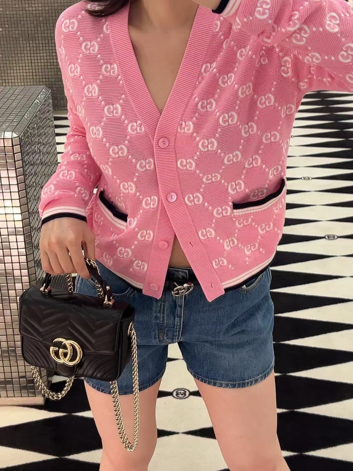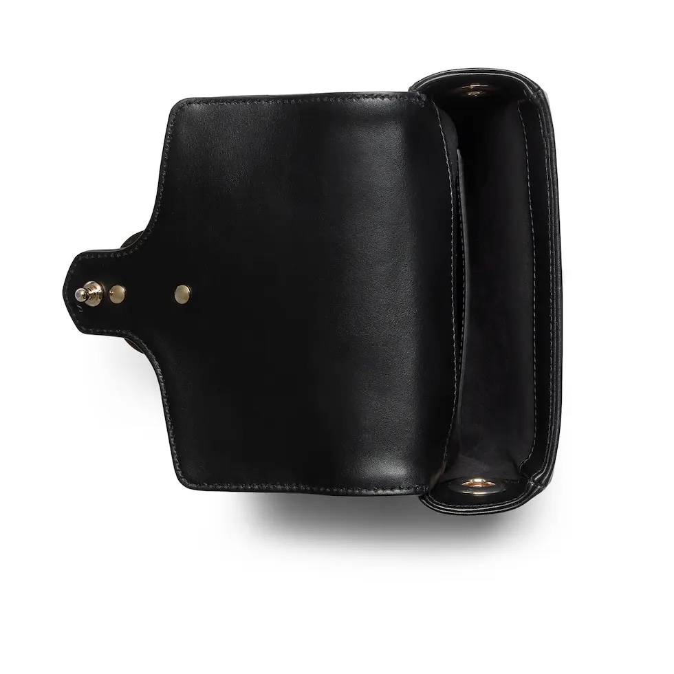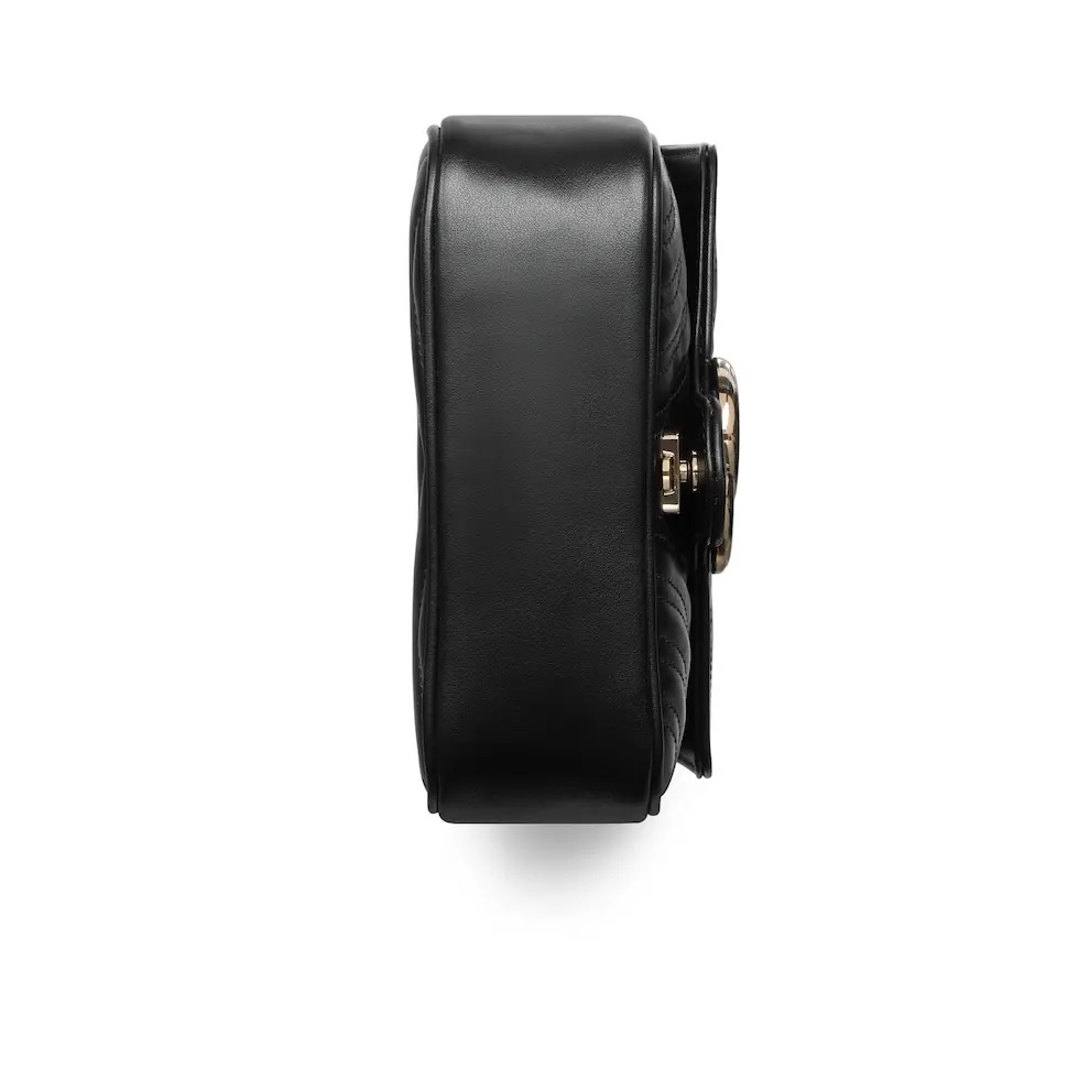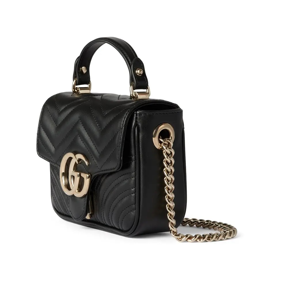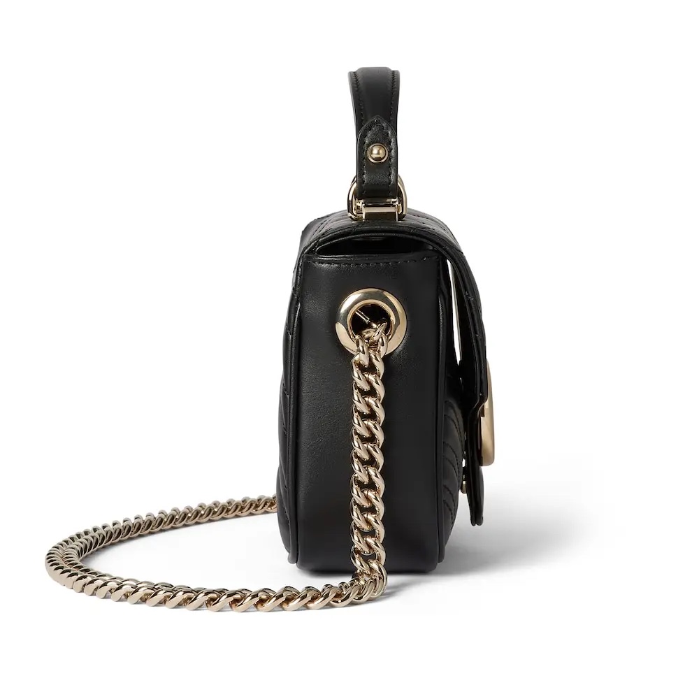 【原厂皮】GG Marmont系列以经典配色演绎全新廓形,811238展现早秋魅力风范。这款手提包以黑色绗缝V型皮革打造,搭配饰可拆卸栓扣浅金色调链条肩带。磁吸翻盖开合缀饰双G,令整个设计魅力倍增。