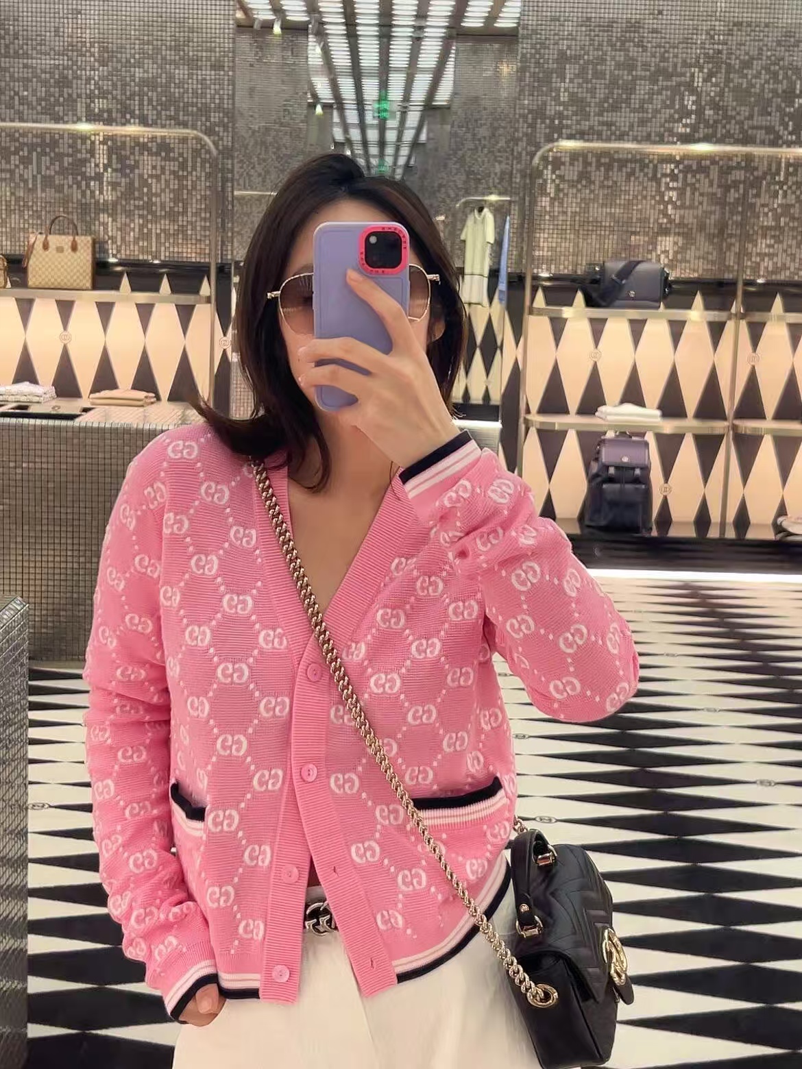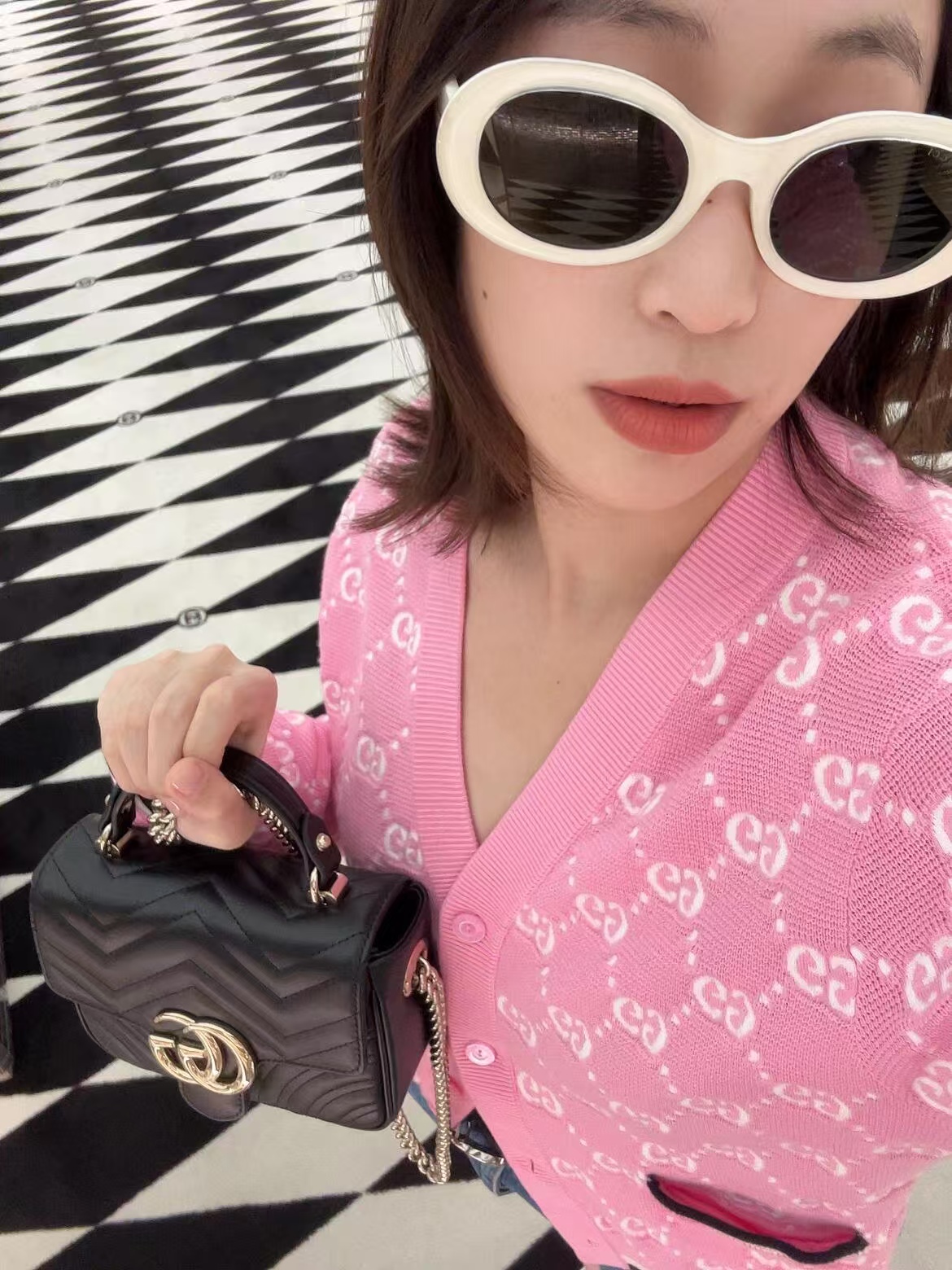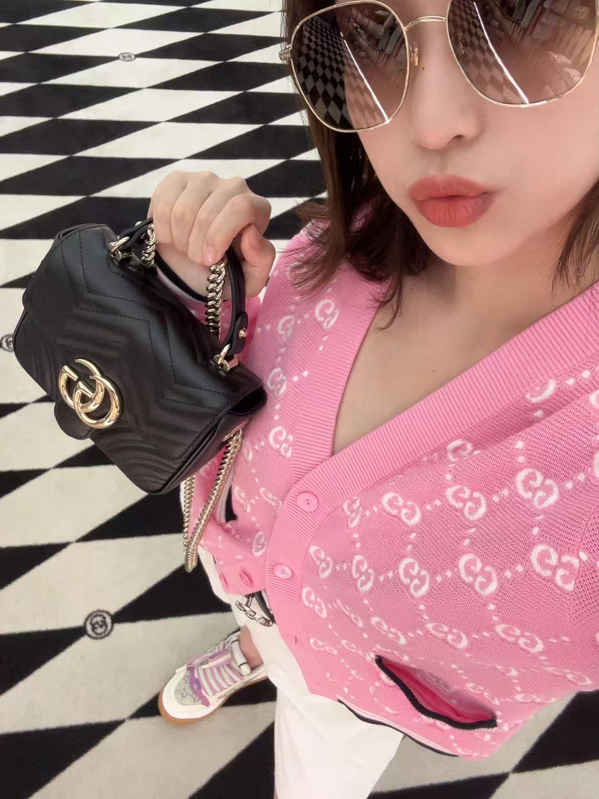 【原厂皮】GG Marmont系列以经典配色演绎全新廓形,811238展现早秋魅力风范。这款手提包以黑色绗缝V型皮革打造,搭配饰可拆卸栓扣浅金色调链条肩带。磁吸翻盖开合缀饰双G,令整个设计魅力倍增。