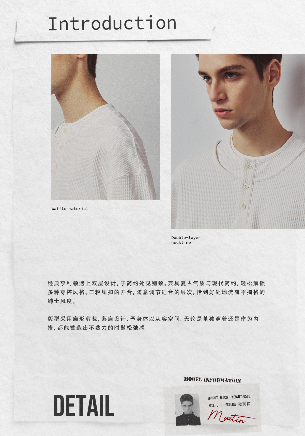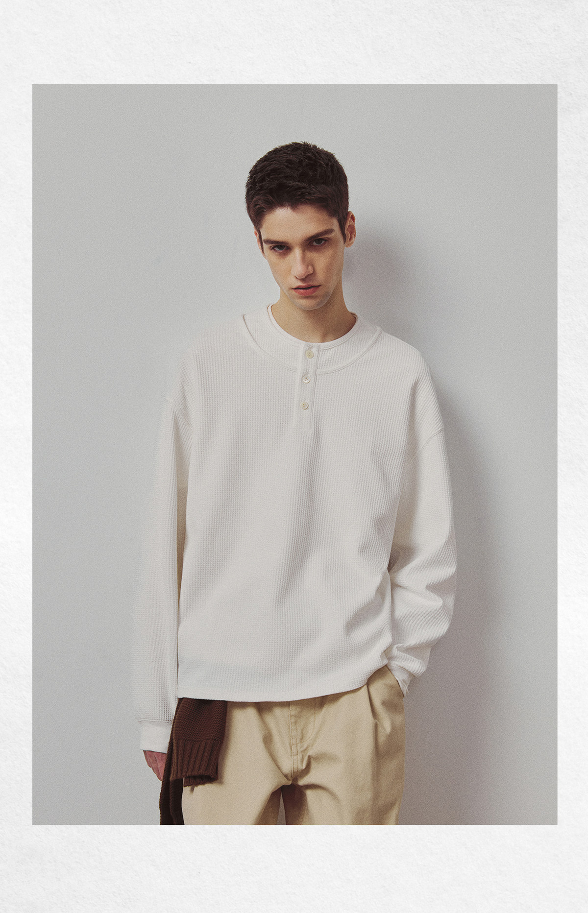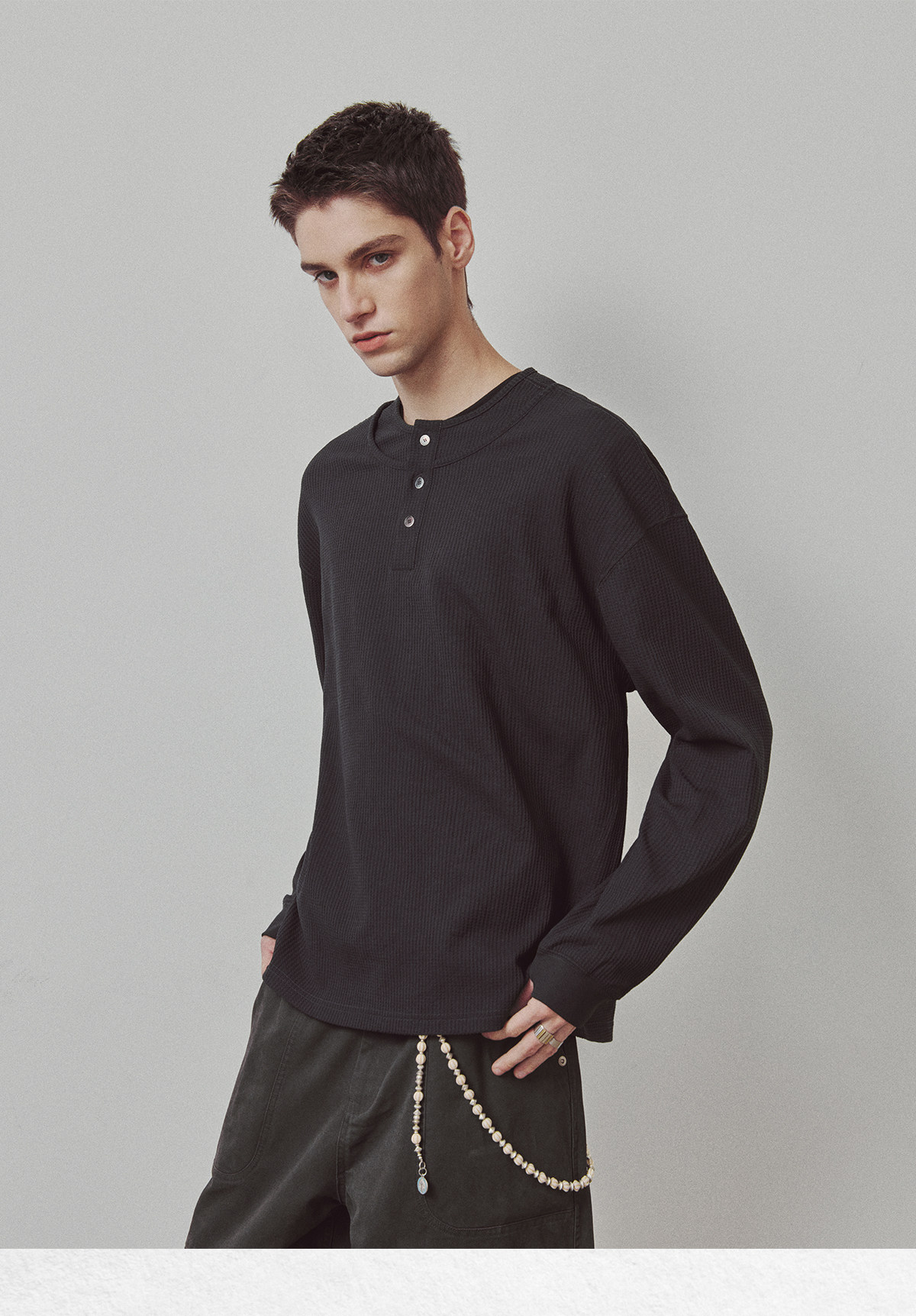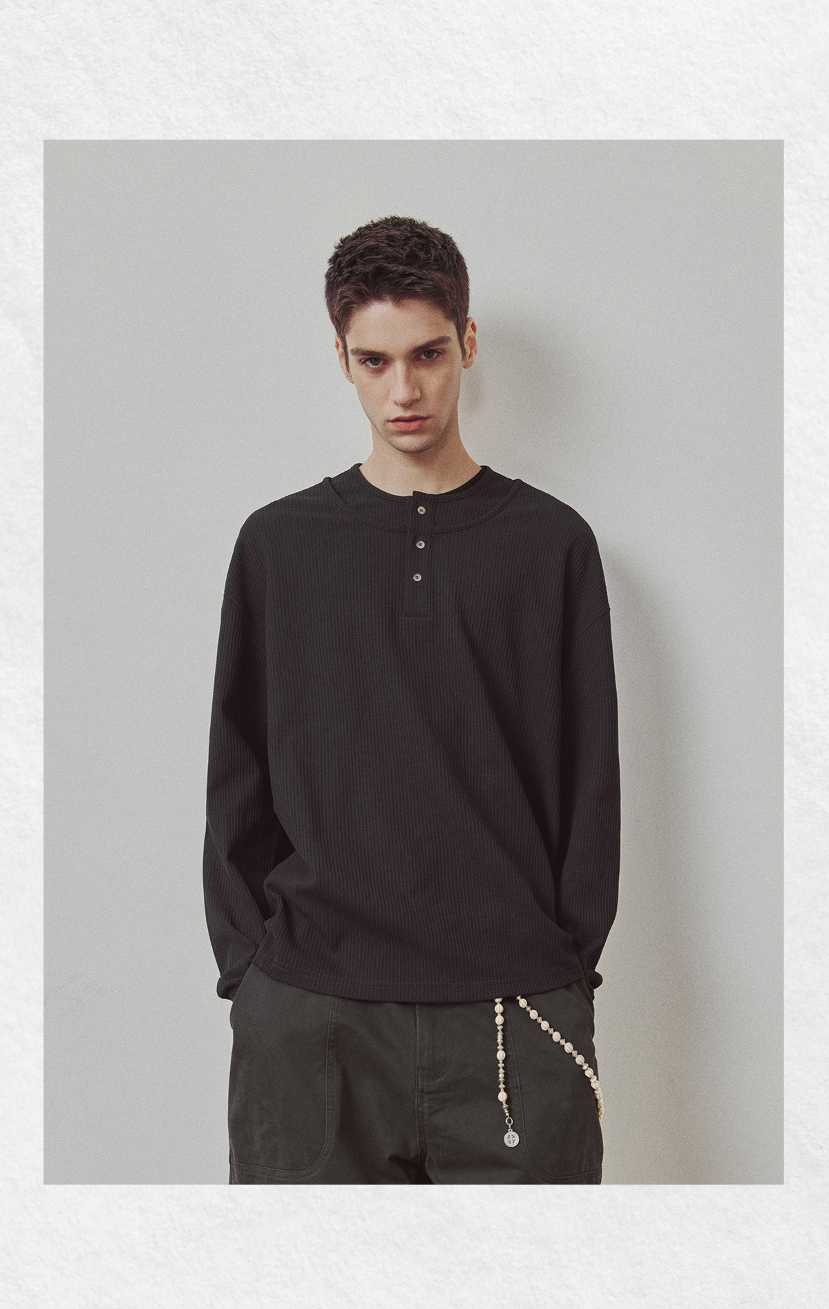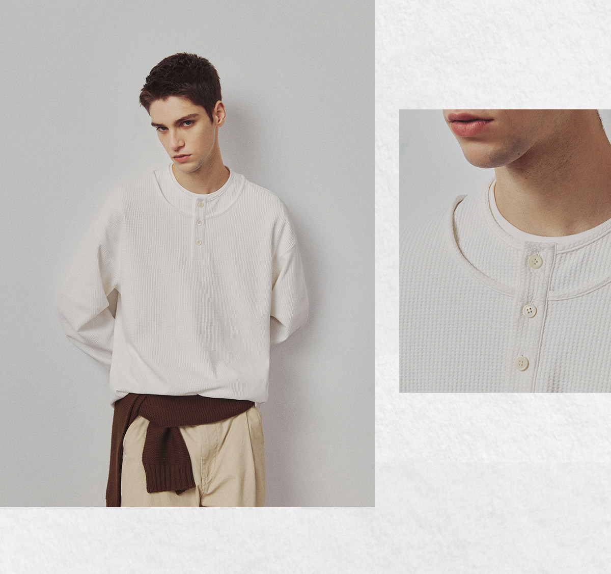 714street高端线BEHALF SORONA 华夫格贝壳扣 双层叠穿亨利领长袖