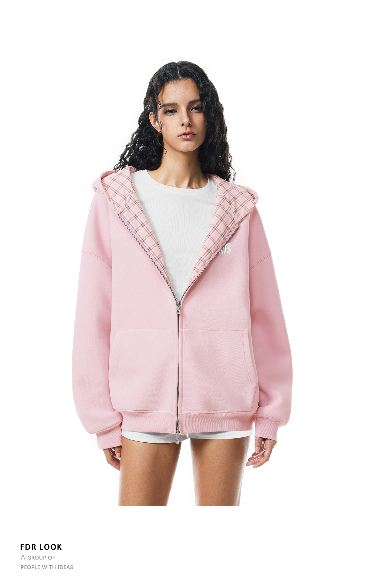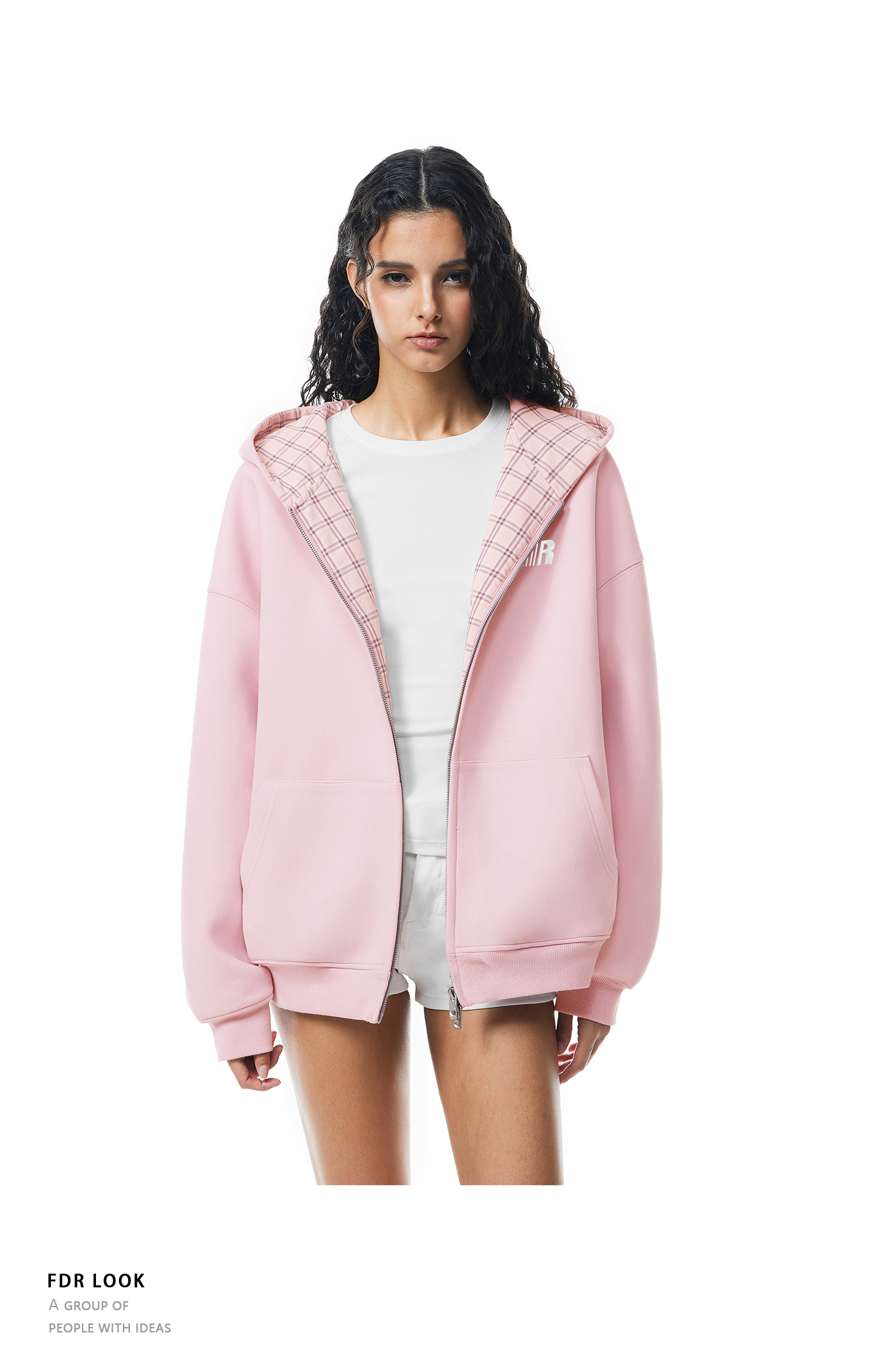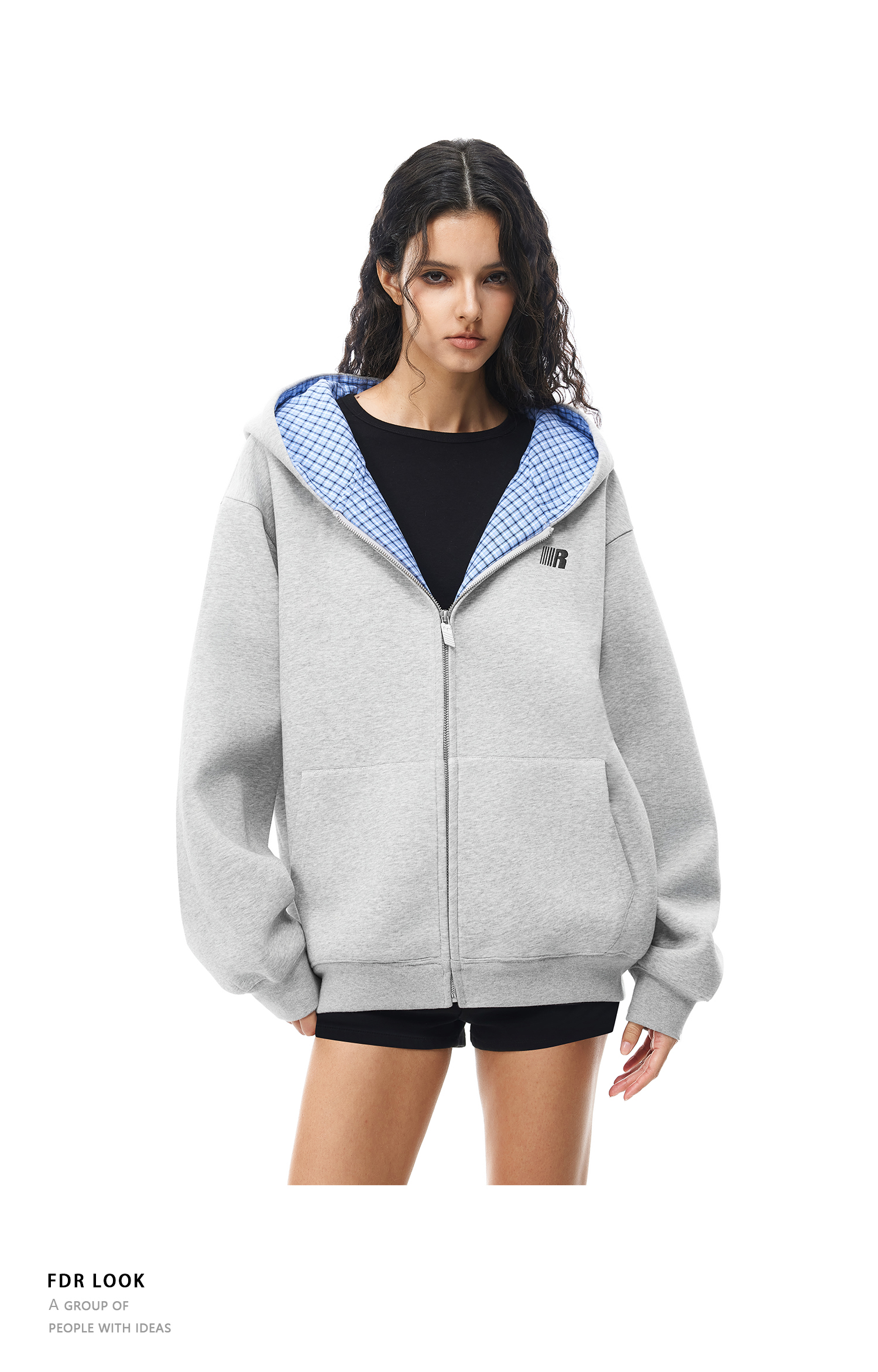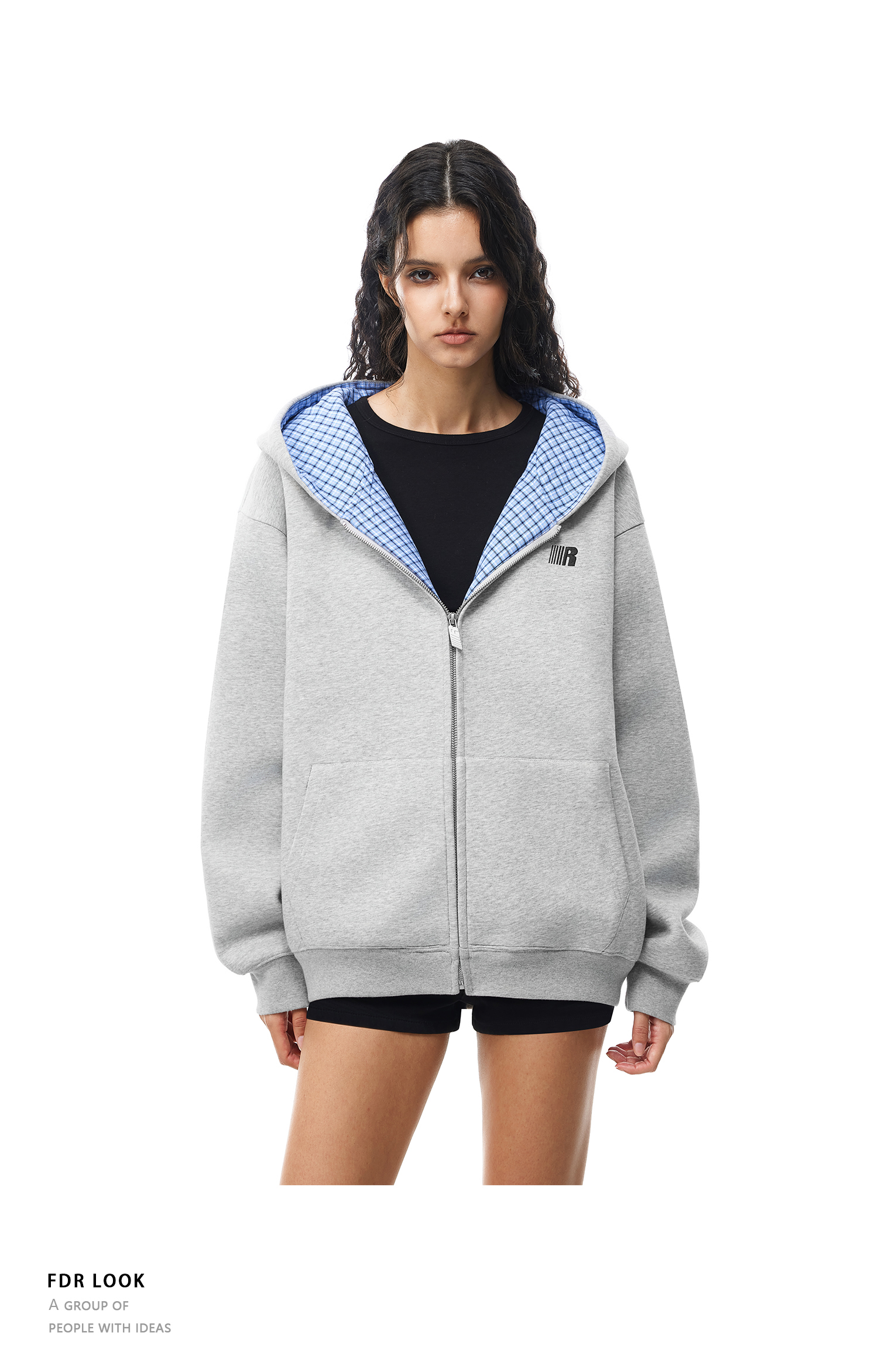 FDR官方店 R字撞色格纹连帽卫衣外套男女秋季宽松情侣装开衫上衣