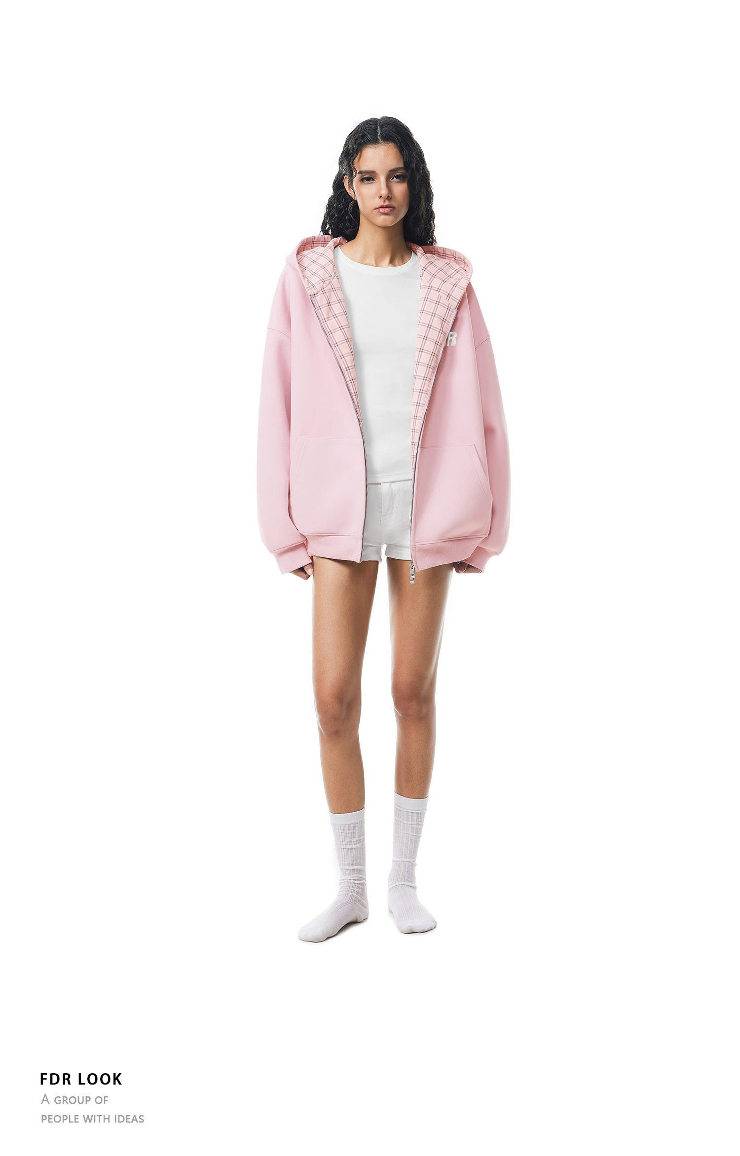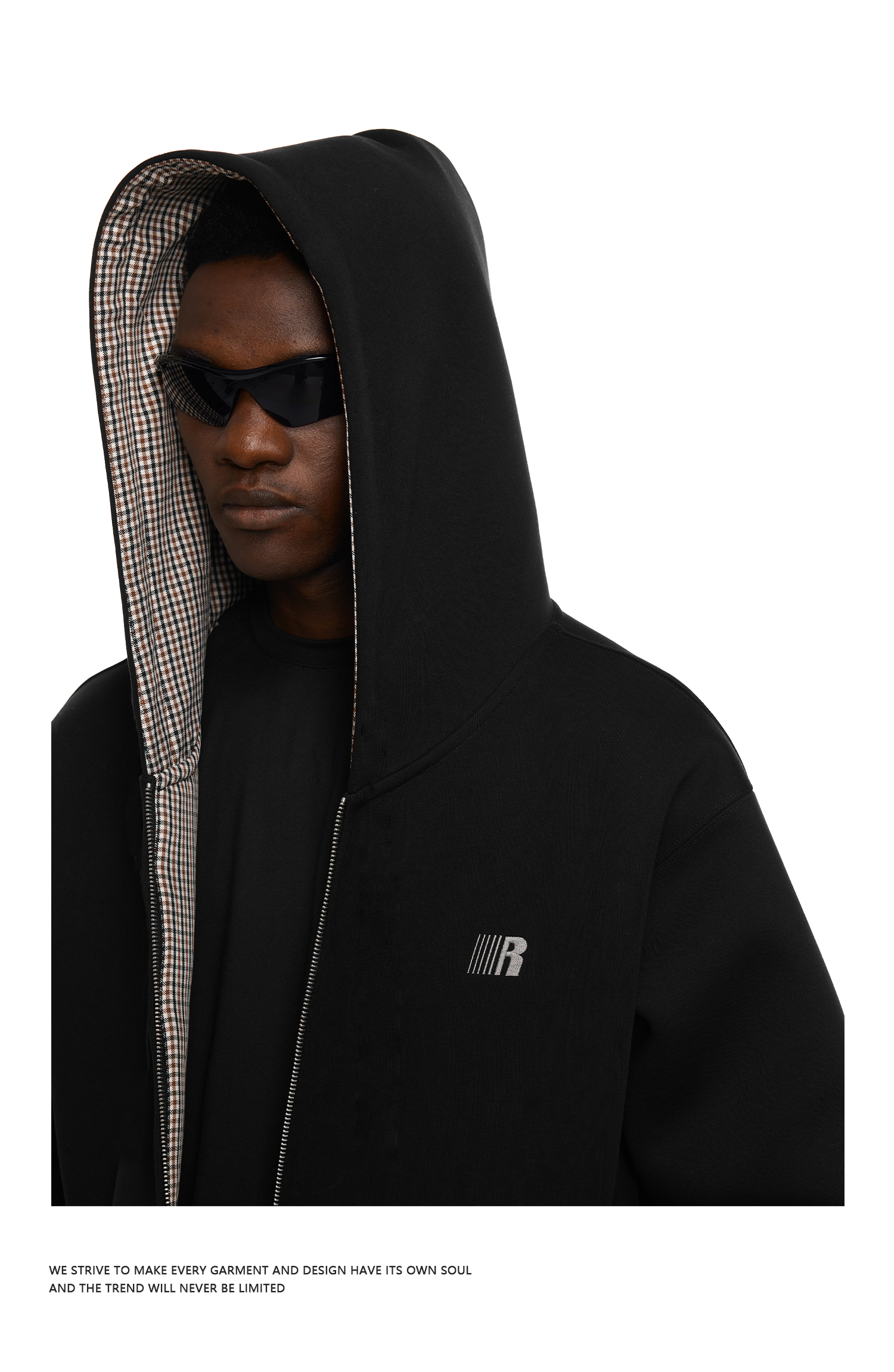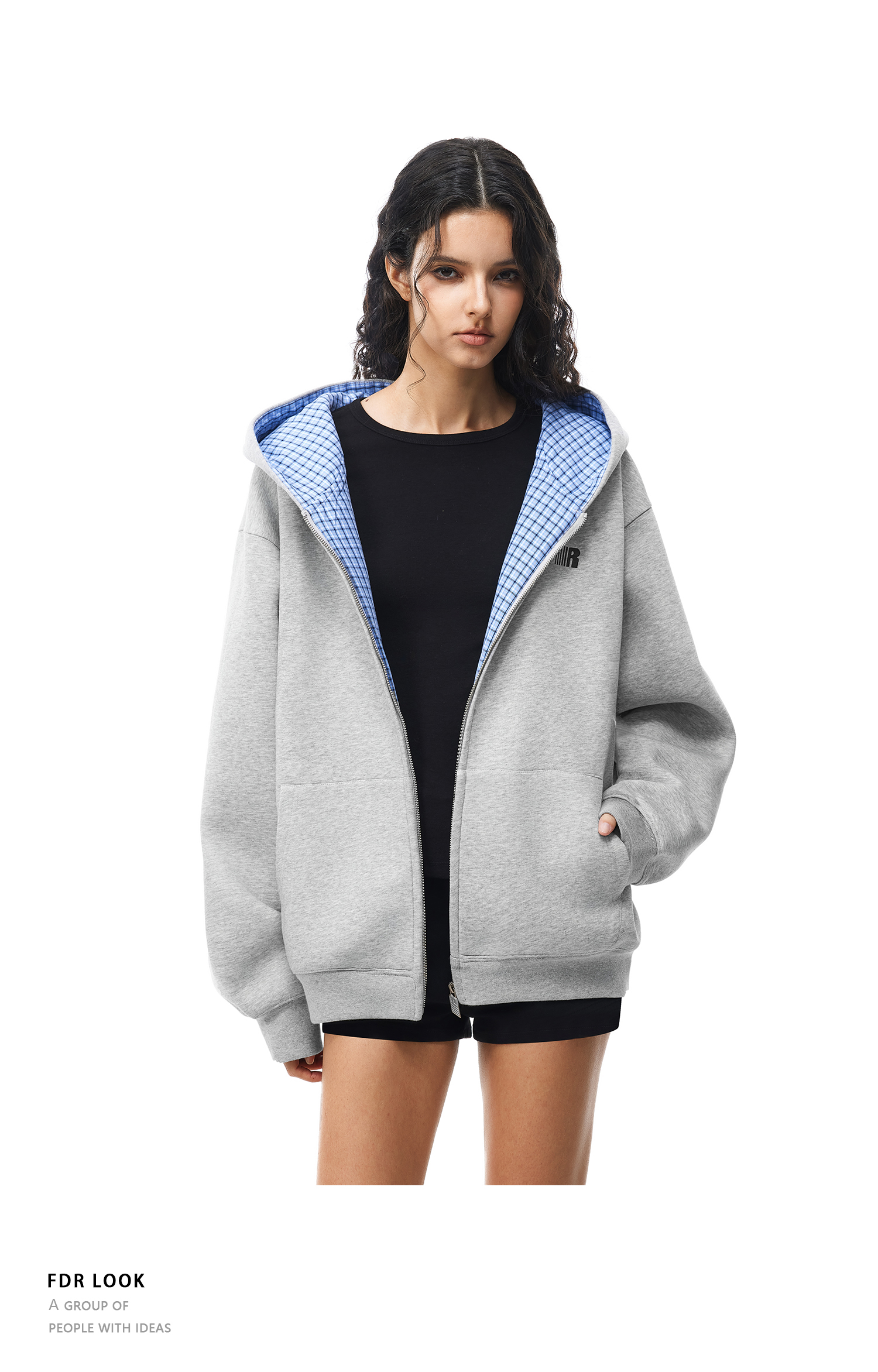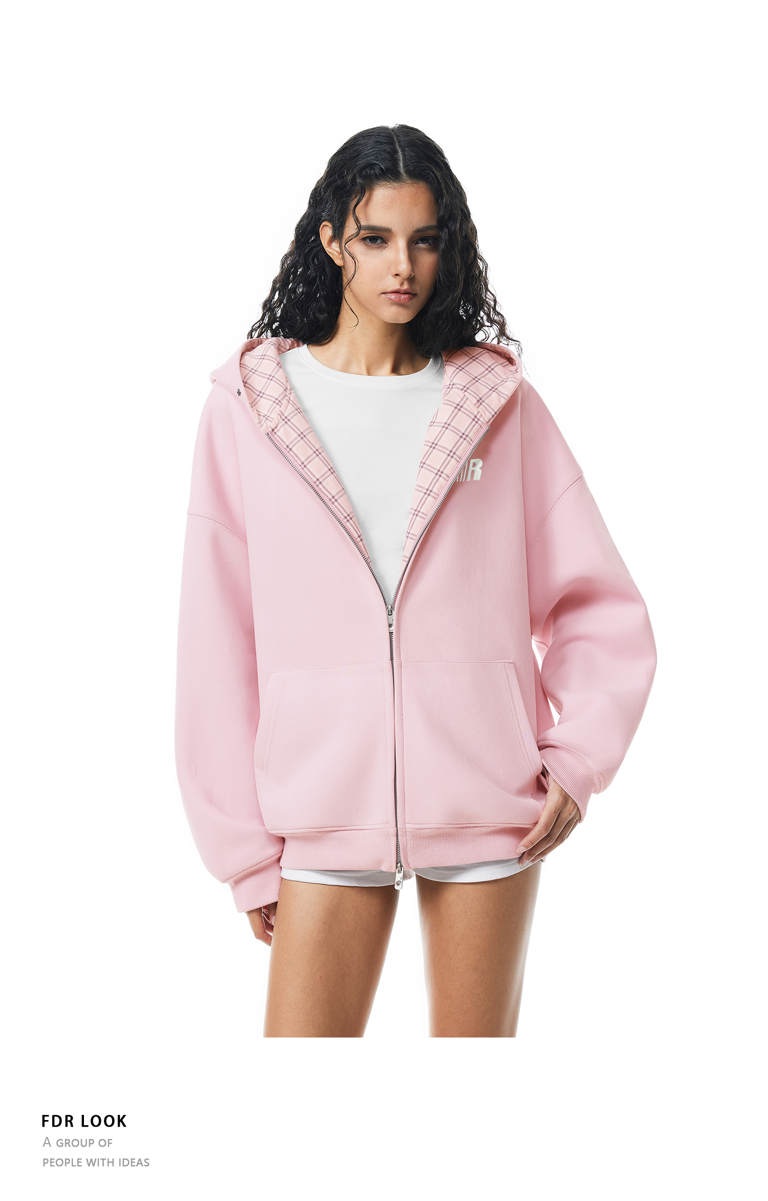 FDR官方店 R字撞色格纹连帽卫衣外套男女秋季宽松情侣装开衫上衣