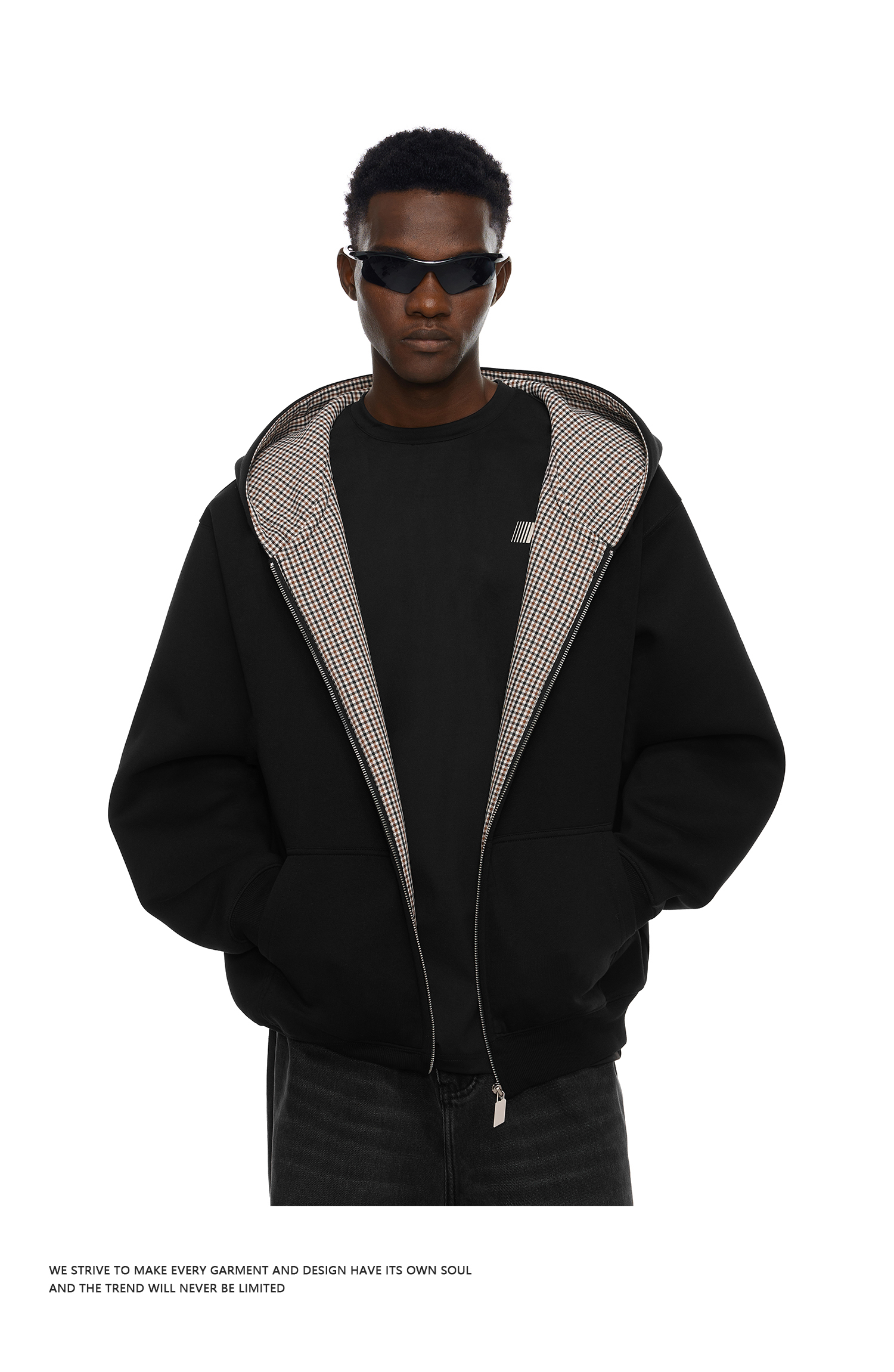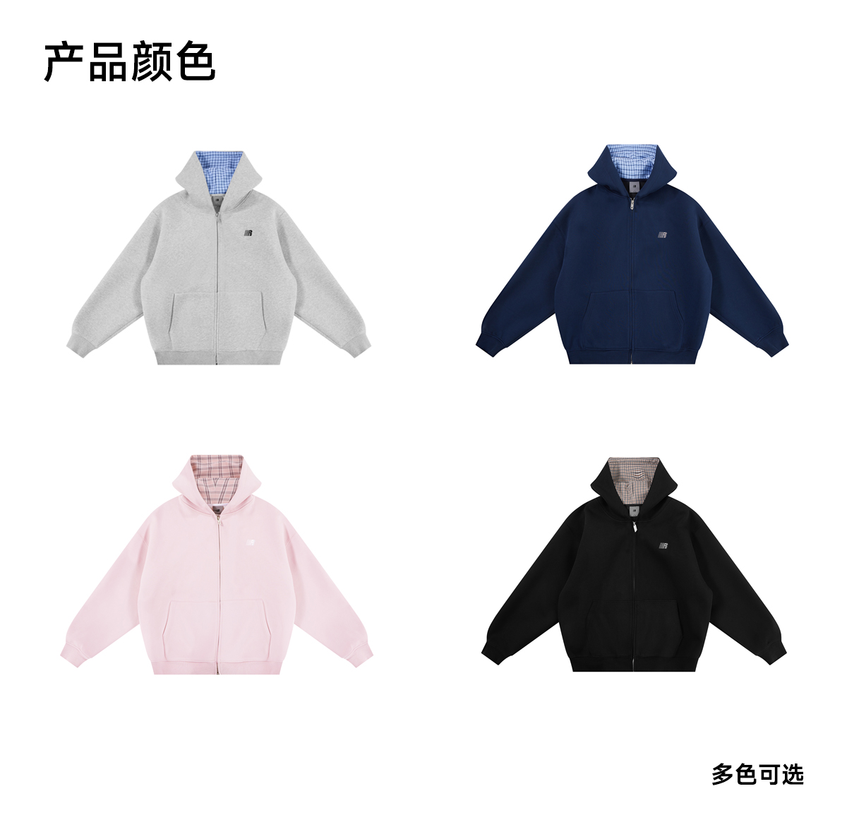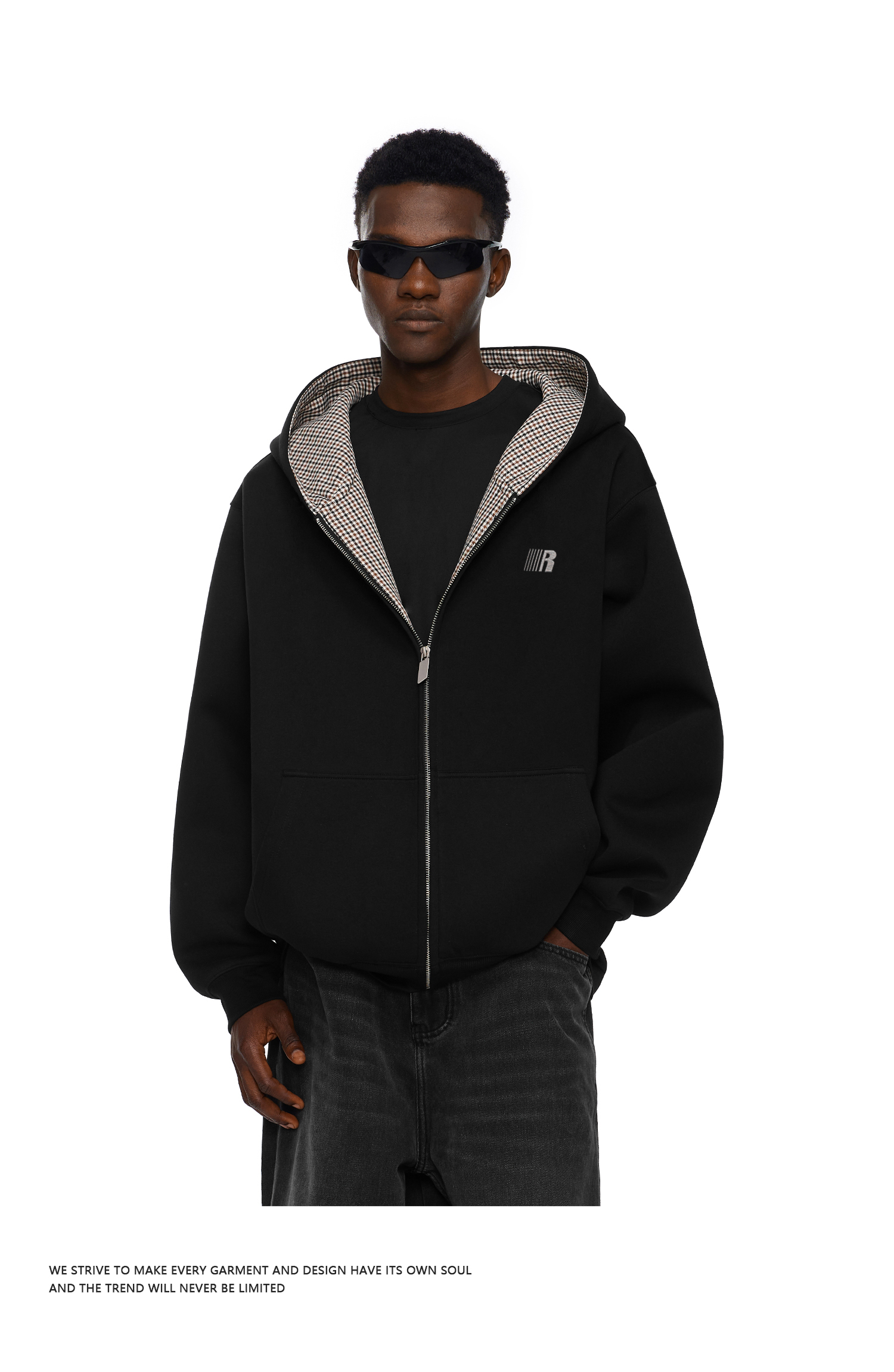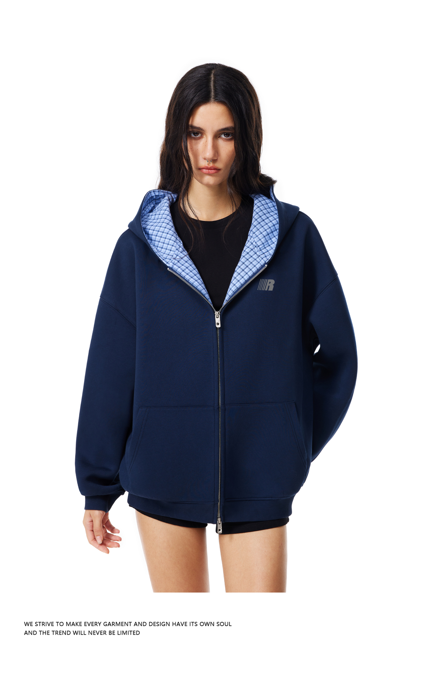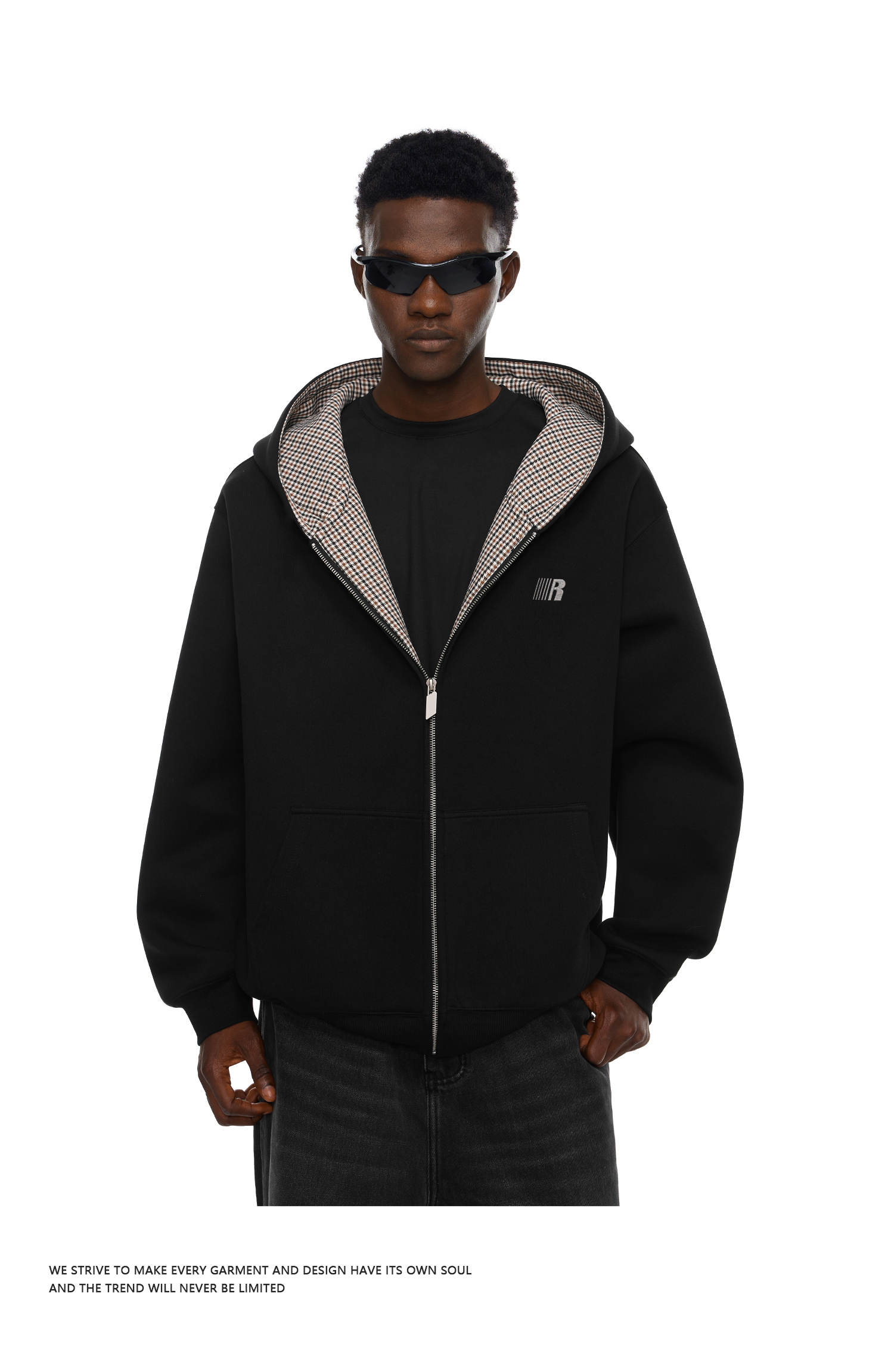 FDR官方店 R字撞色格纹连帽卫衣外套男女秋季宽松情侣装开衫上衣