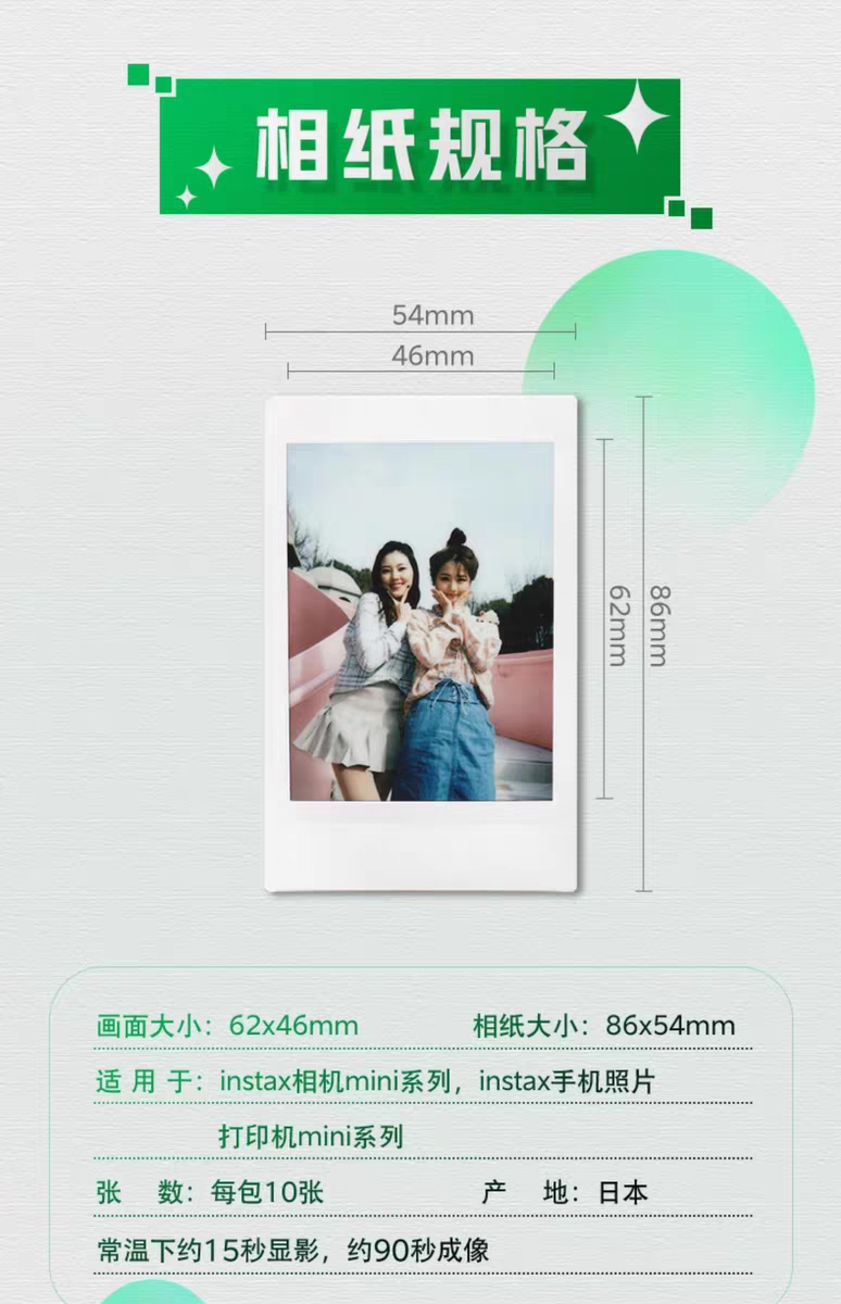 富士拍立得相纸,MINI 系列相纸多样,白边相纸适用于 MINI7 +、7s8、9、11、90、Liplay 等机型,生产时间 2025、2026 年左右。还有多种花边相纸,如手绘 kitty 猫相纸、米奇黑胶手绘 Kitty 卡通相纸、爱心相纸、迪士尼公主相纸、星星相纸、粉边相纸、黑白相纸、糖霜相纸、黑边相纸、经典黑胶相纸、花语相纸、蓝边相纸、流光相纸、马卡龙相纸、人鱼相纸、石灰岩相纸、双子星相纸、糖果相纸、天青石相纸、涂鸦相纸、维尼熊相纸、薰衣草紫边相纸。