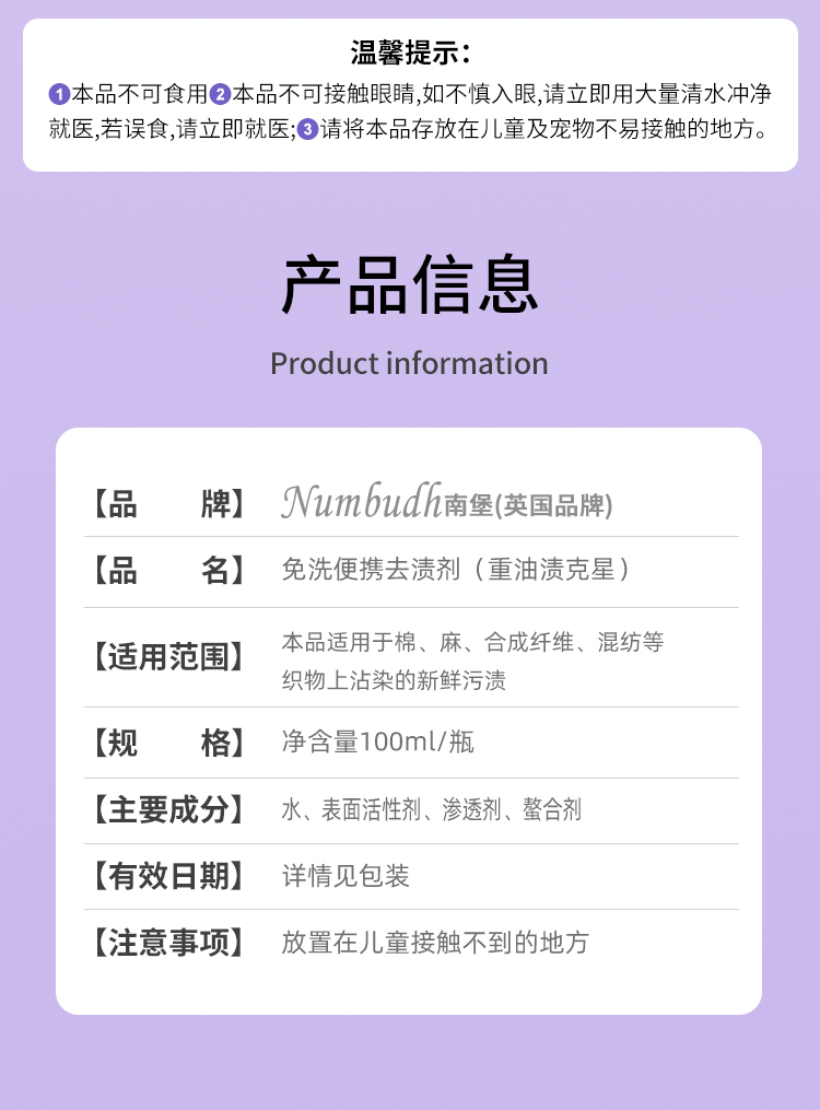 南堡Numbudh免洗便捷去渍剂100ml(重油渍克星)