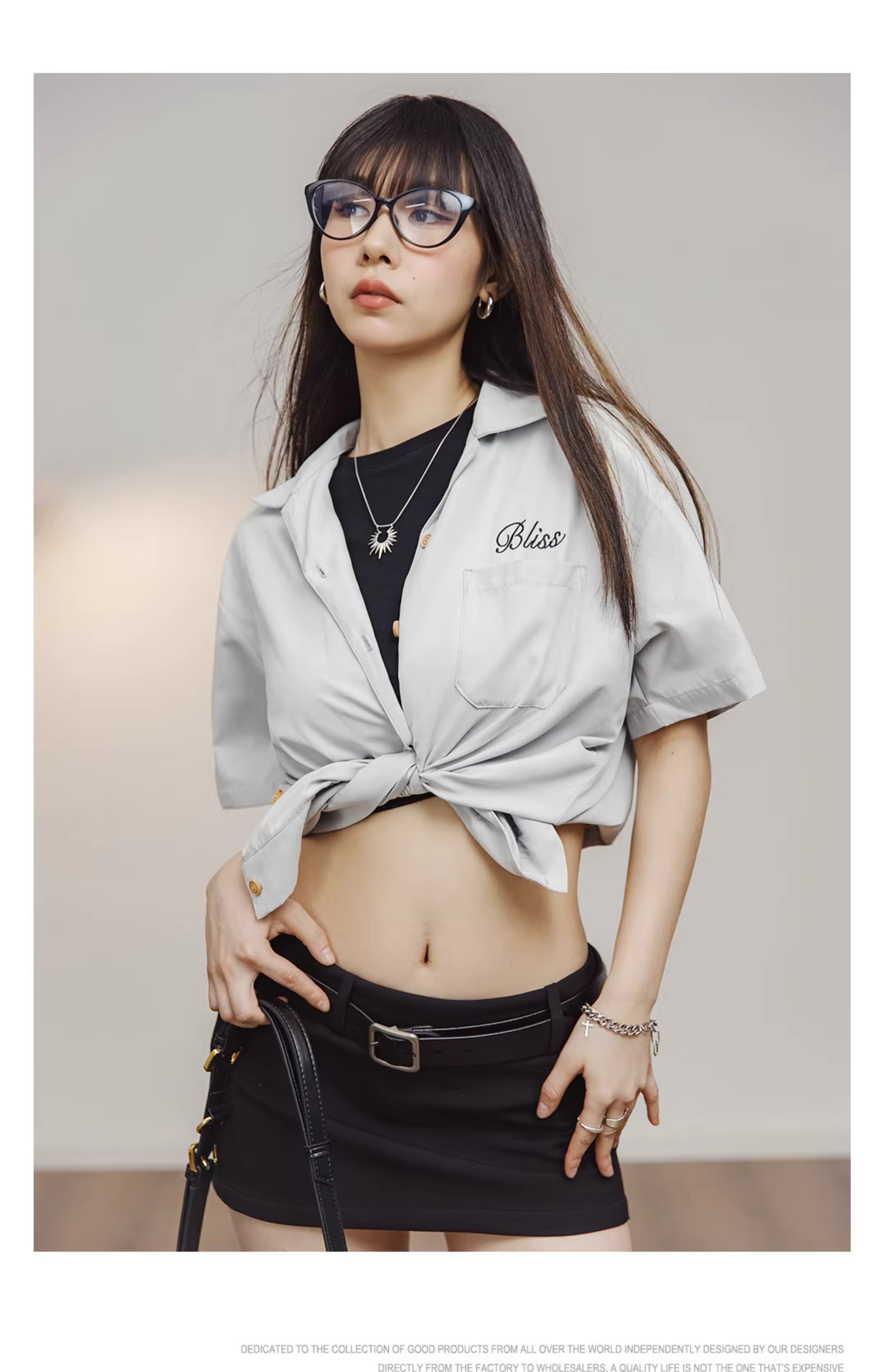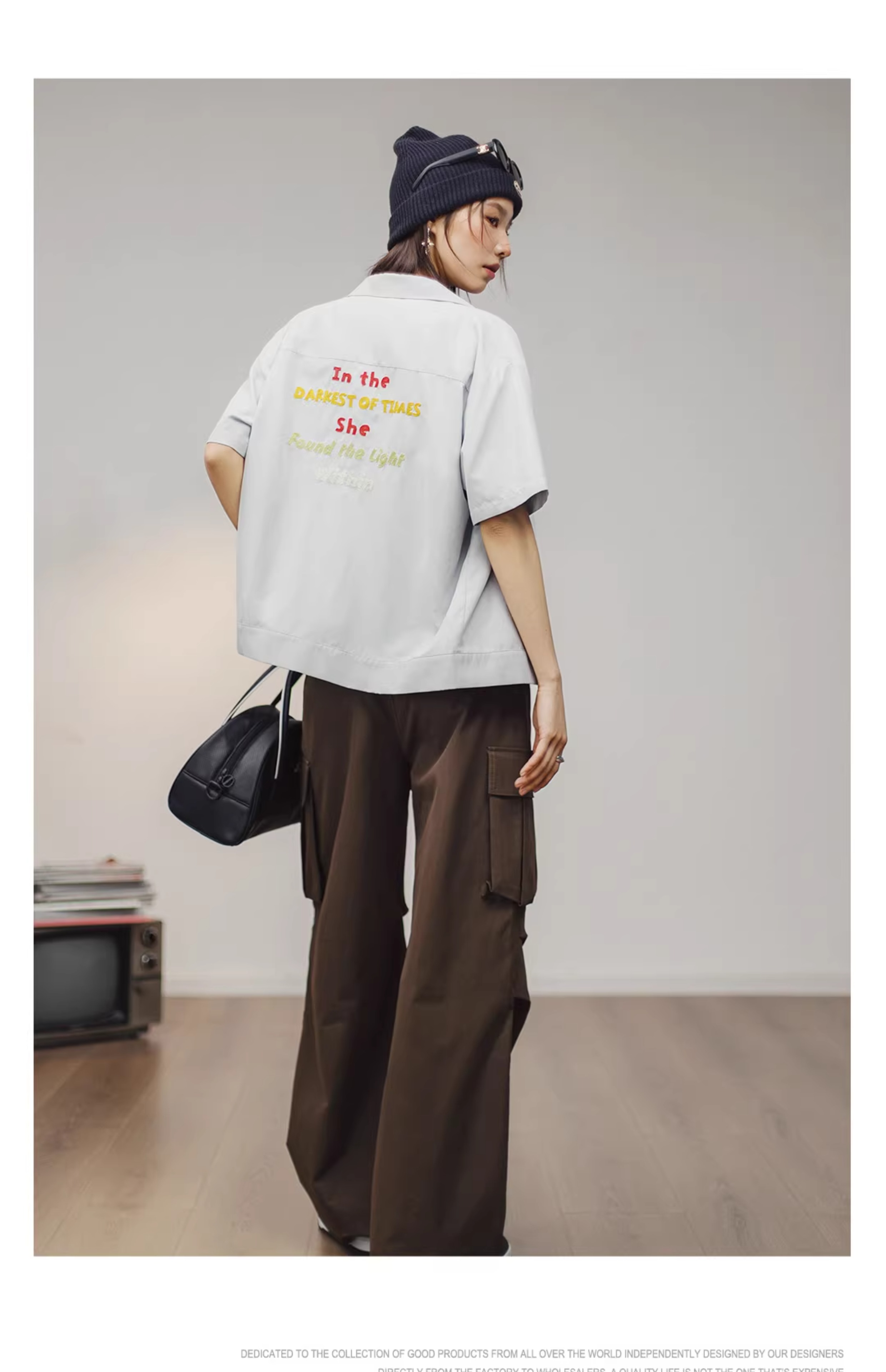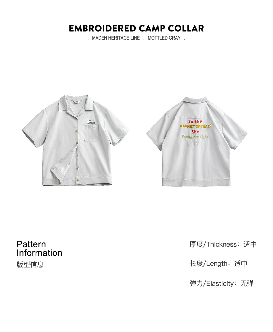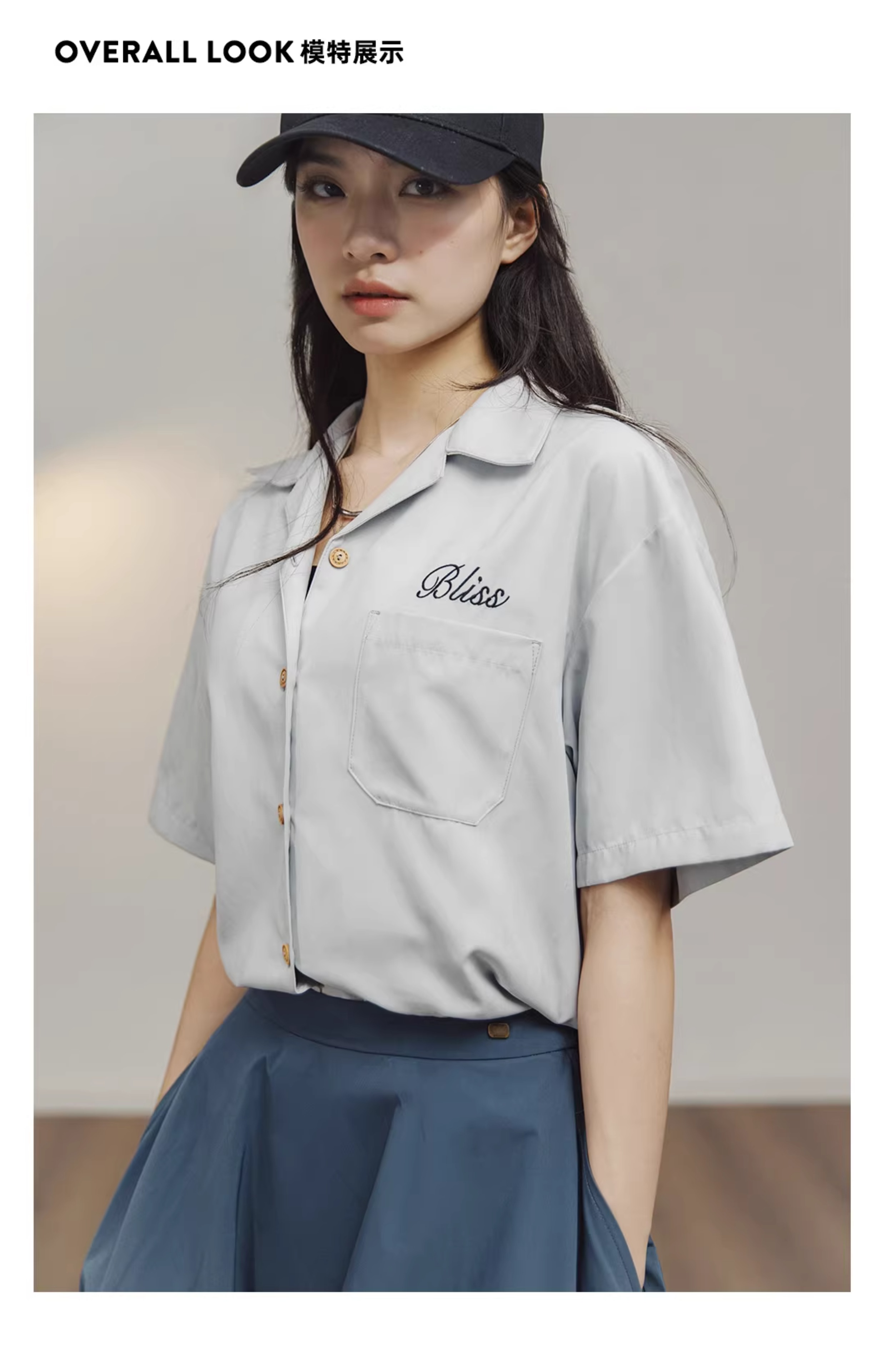 马登刺绣古巴领衬衣宽松设计感短袖小众休闲上衣内搭叠穿薄夏季女