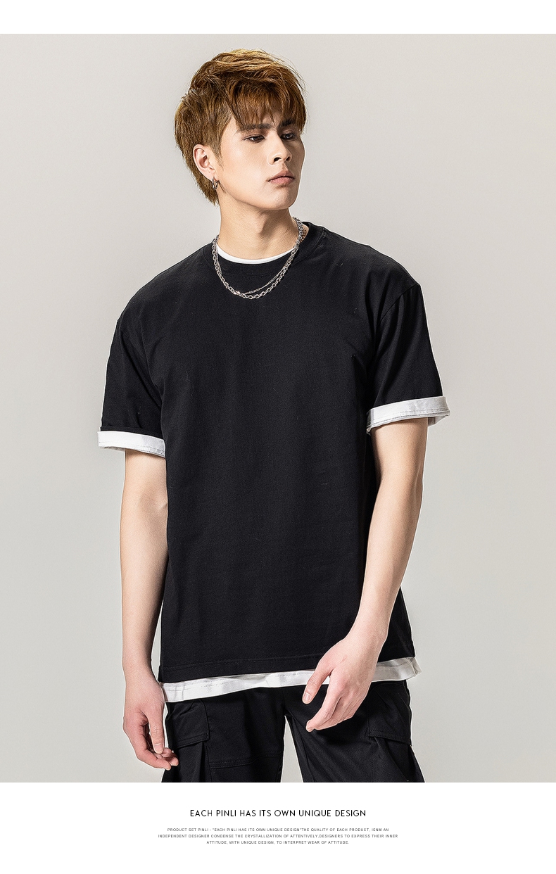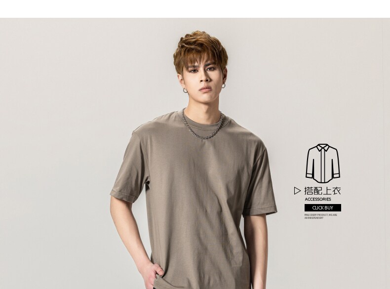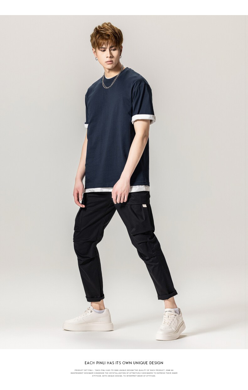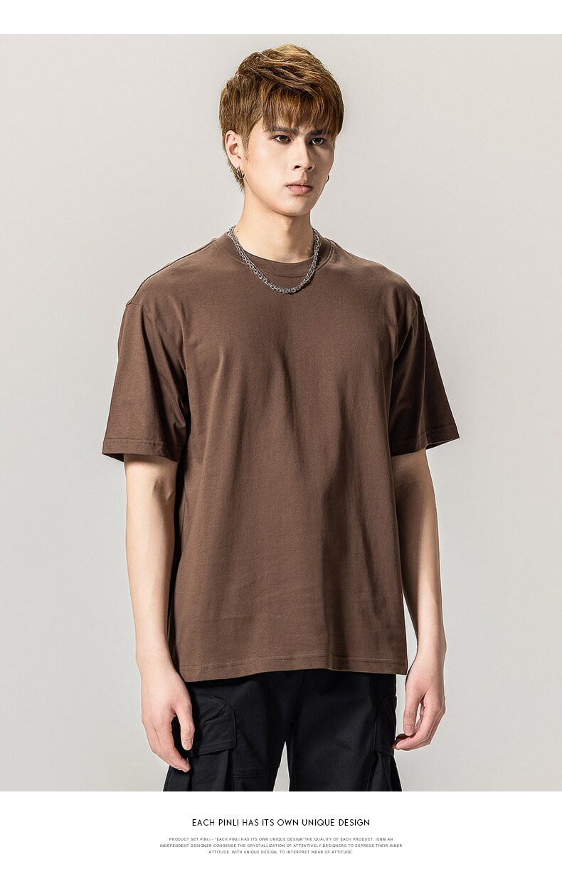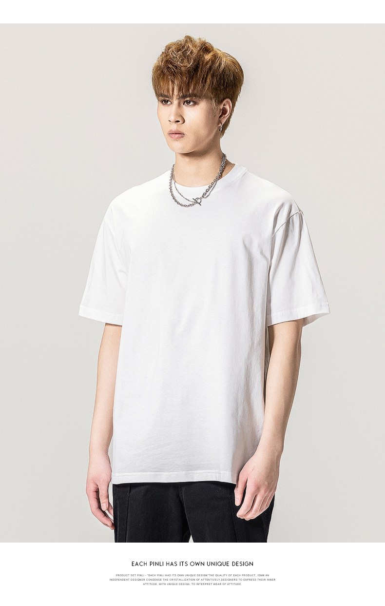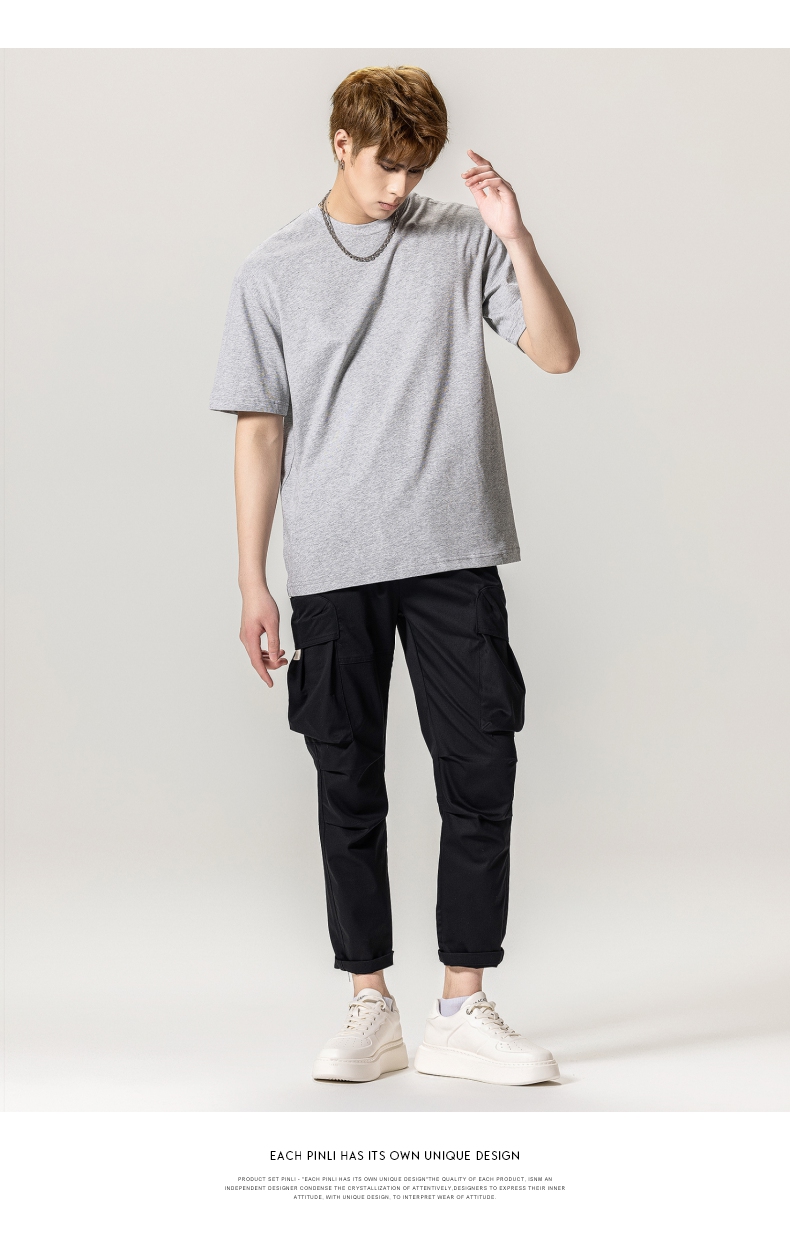 PINLI品立夏季新款男士圆领落肩纯色短袖T恤打底衫GD231111021