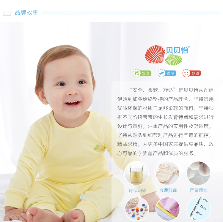 - 贝贝怡专注0-6岁婴幼儿服饰,坚持安全、柔软、舒适的产品理念,为千万中国家庭提供超高品质、安全可靠的婴幼儿服饰产品,妈妈放心,宝宝开心!