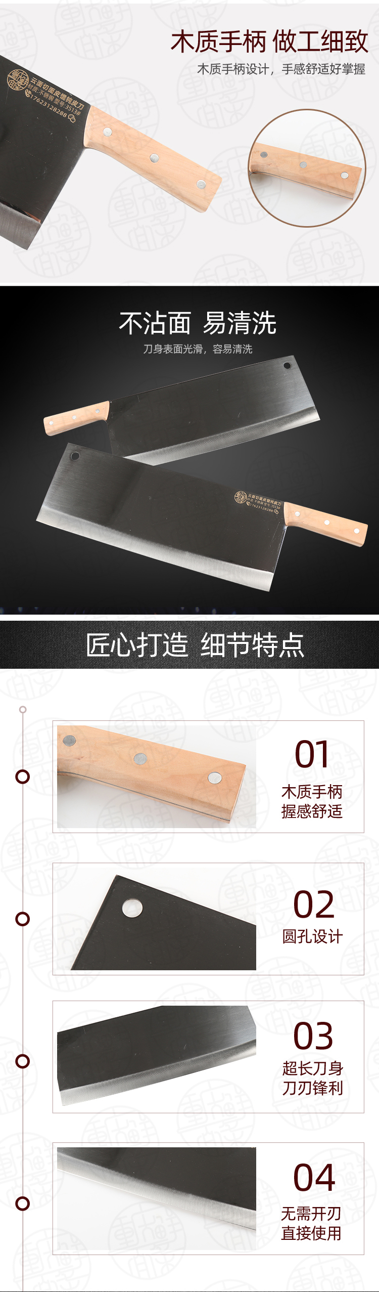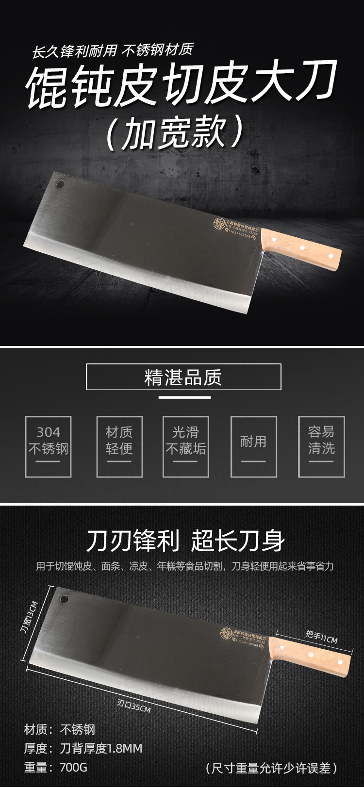 尺寸:总长46厘米,刃长35厘米,宽度13厘米,把长11厘米。重量1.42斤左右。