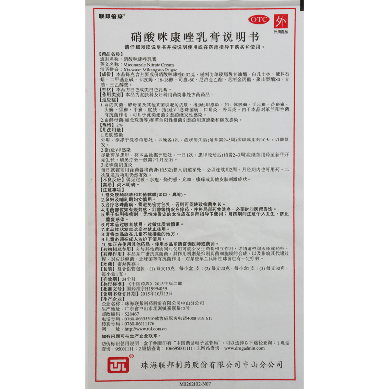 联邦硝酸咪康唑乳膏15g 口角炎 外耳炎 阴道感染和继发感染甲癣