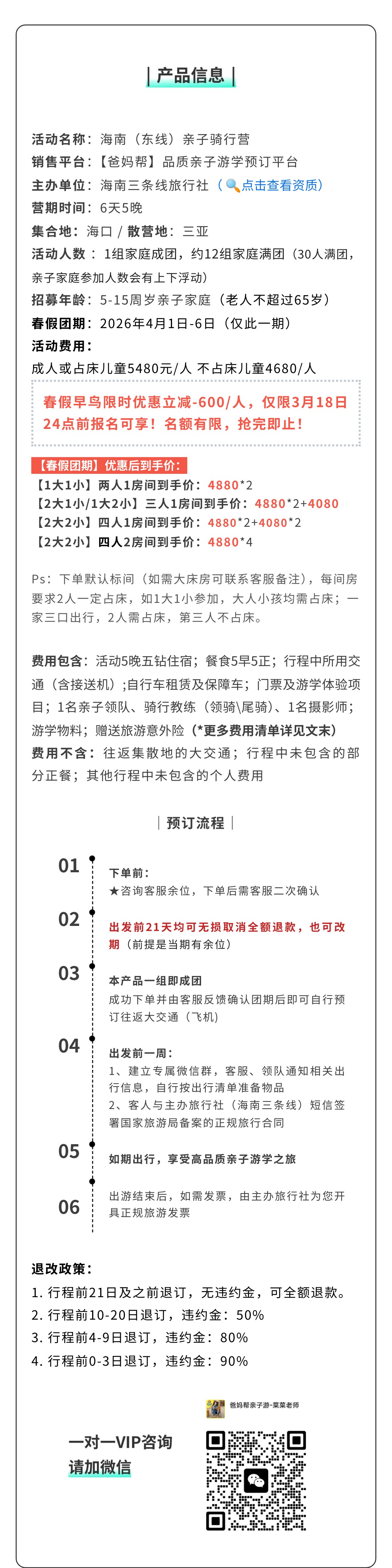 春假4.1-4.6仅此一期!早鸟立减600!【海南东线亲子骑行营】从海口到三亚,半天骑行半天游学!4段精华骑行,航天游学、冲浪、野趣赶海、海鲜大餐、博物馆游学!专业领骑+保障,全程摄影!