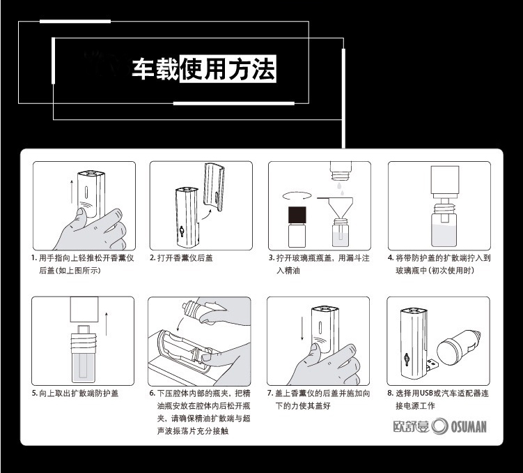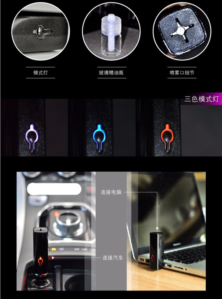 便携式香薰仪包括:香薰仪+两个棉芯玻璃瓶(用于装精油)+使用说明书。