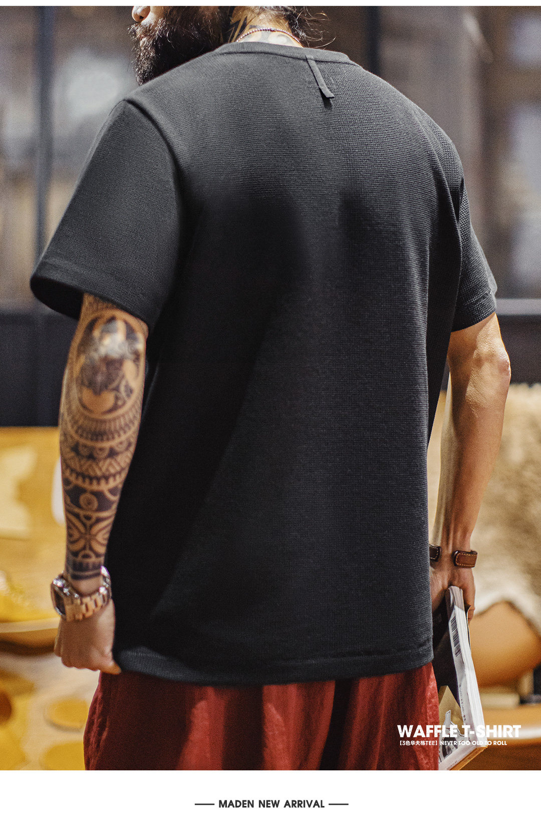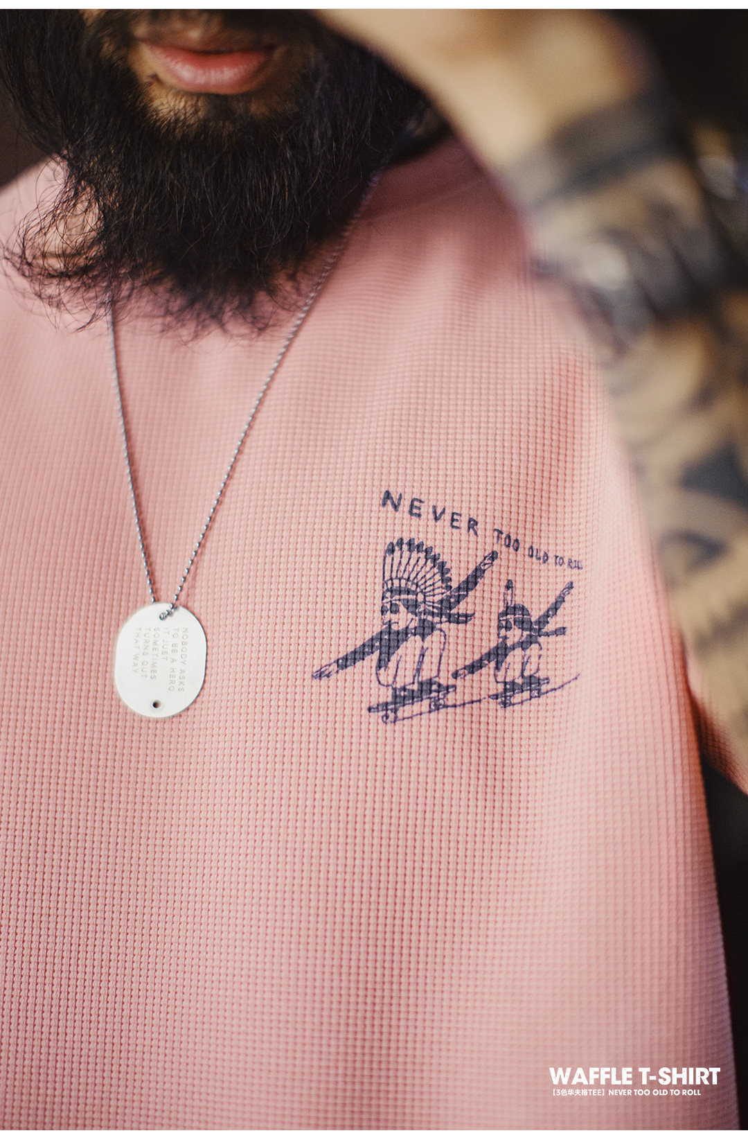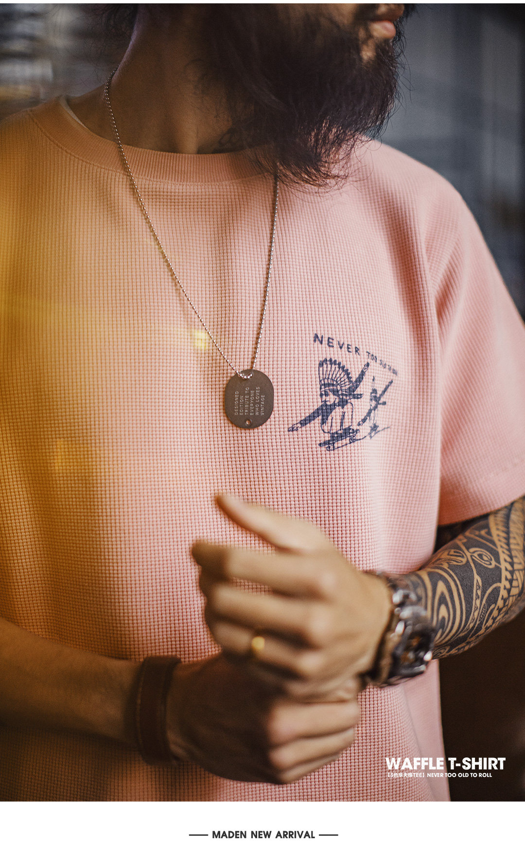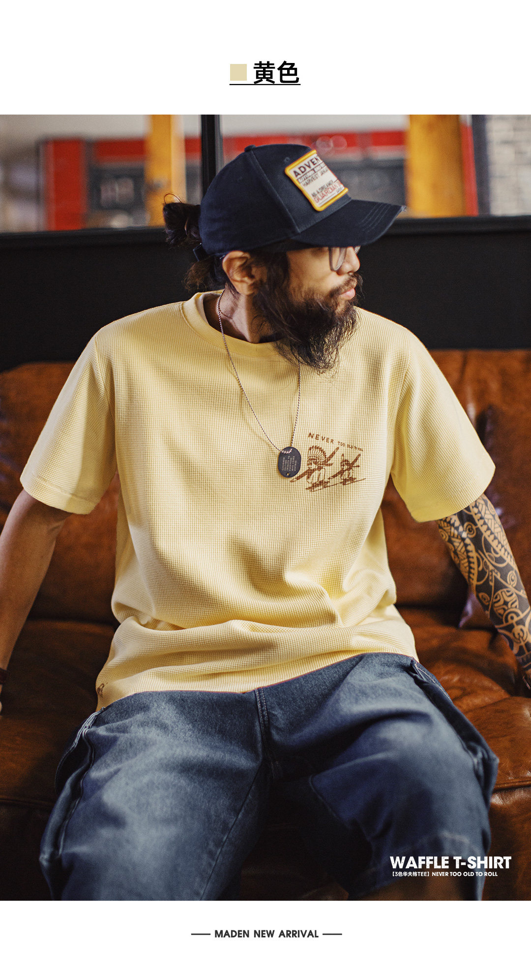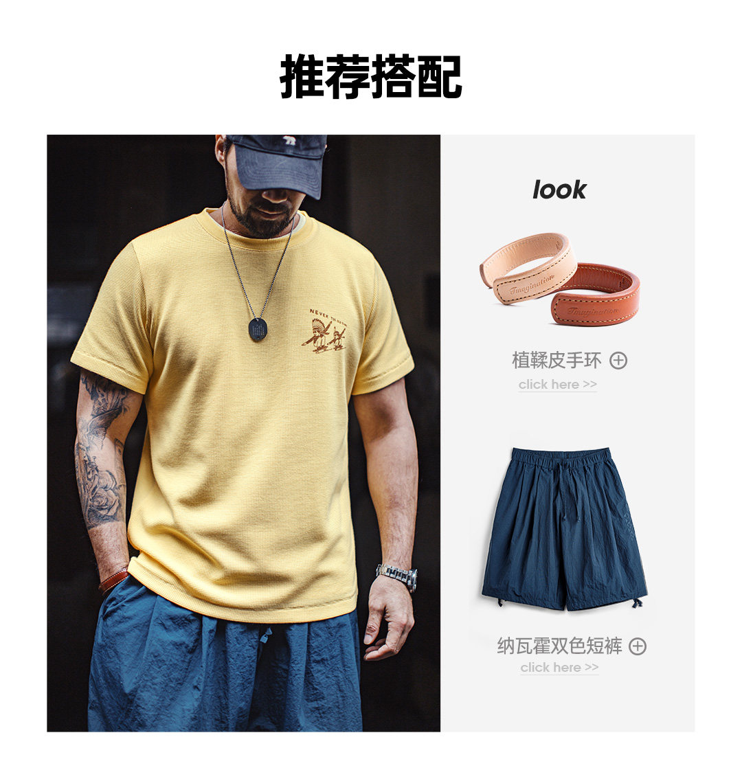 马登工装美式复古华夫格圆领短袖t恤阿美咔叽印第安印花上衣男夏