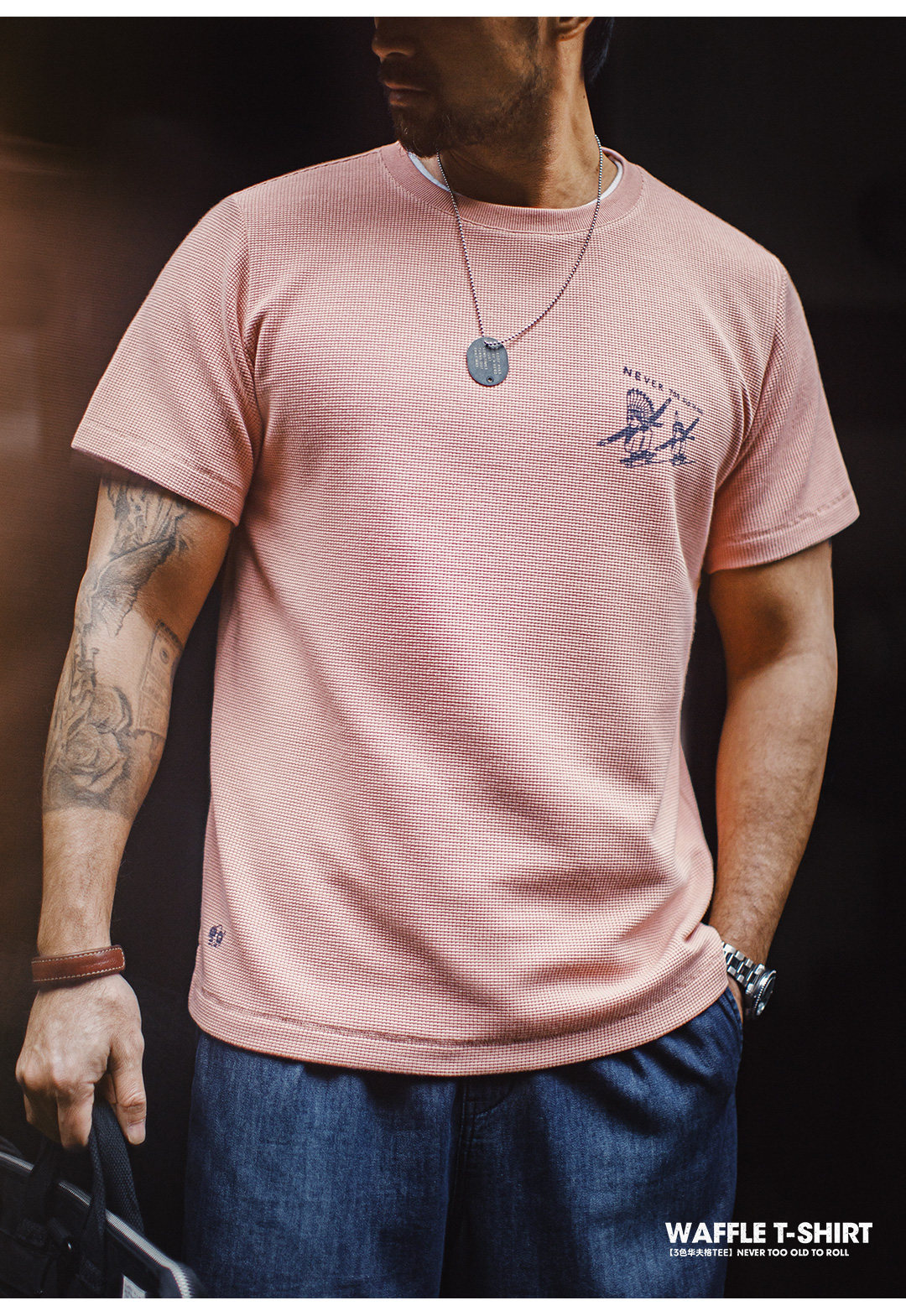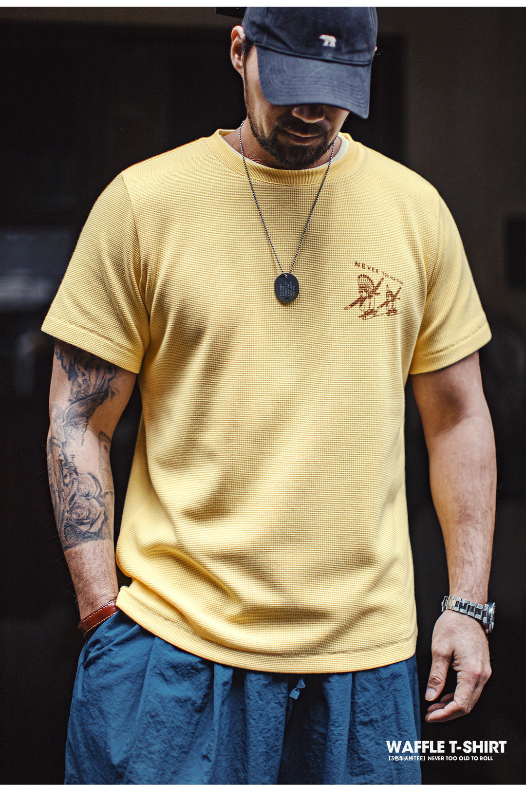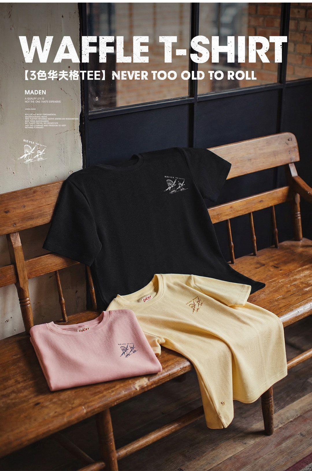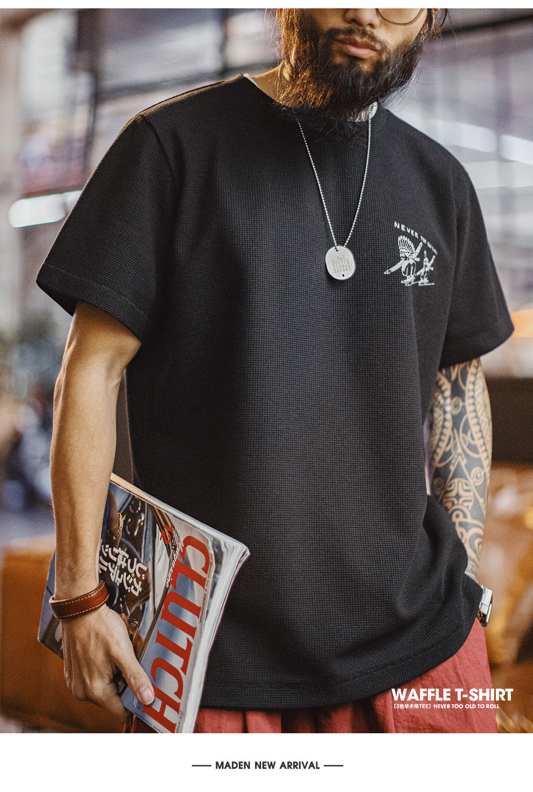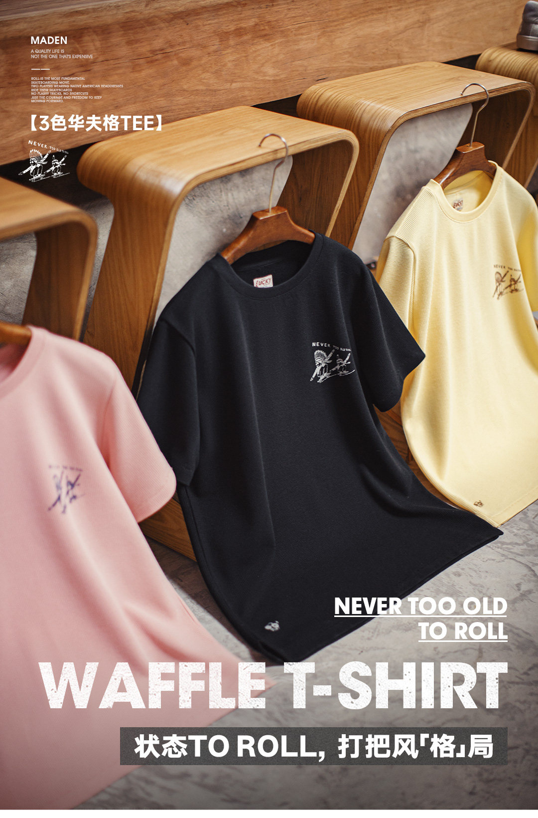 马登工装美式复古华夫格圆领短袖t恤阿美咔叽印第安印花上衣男夏