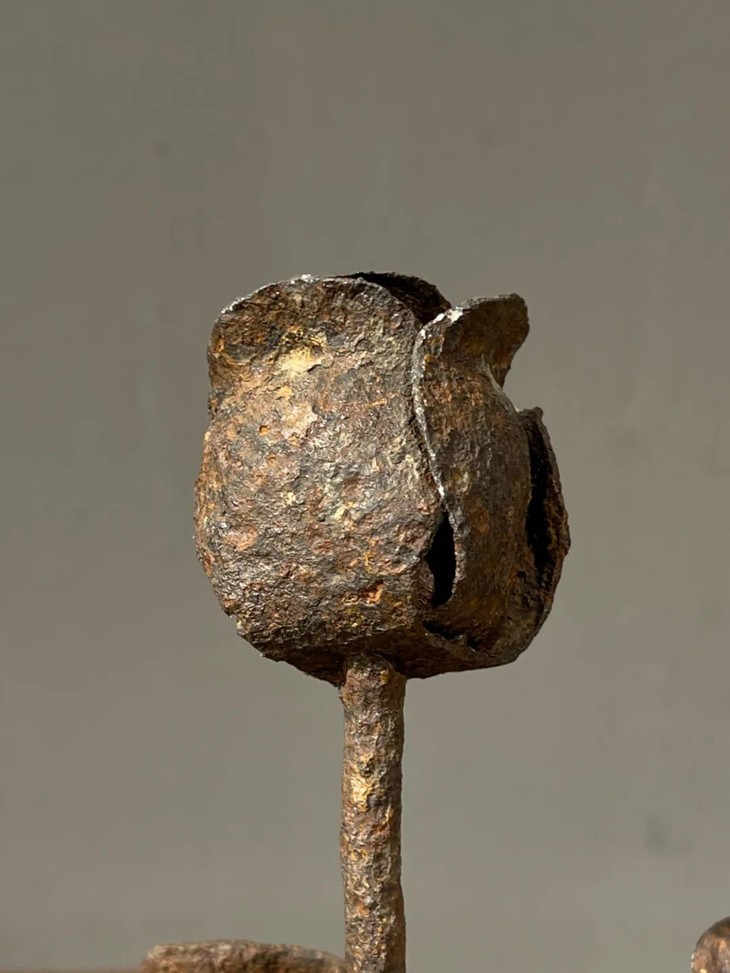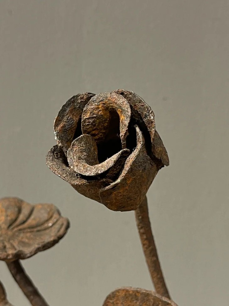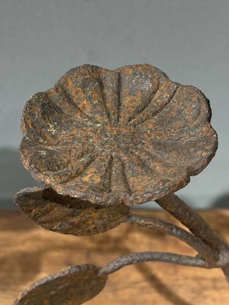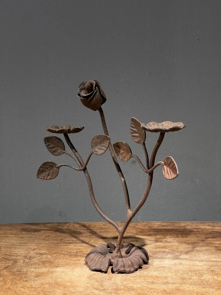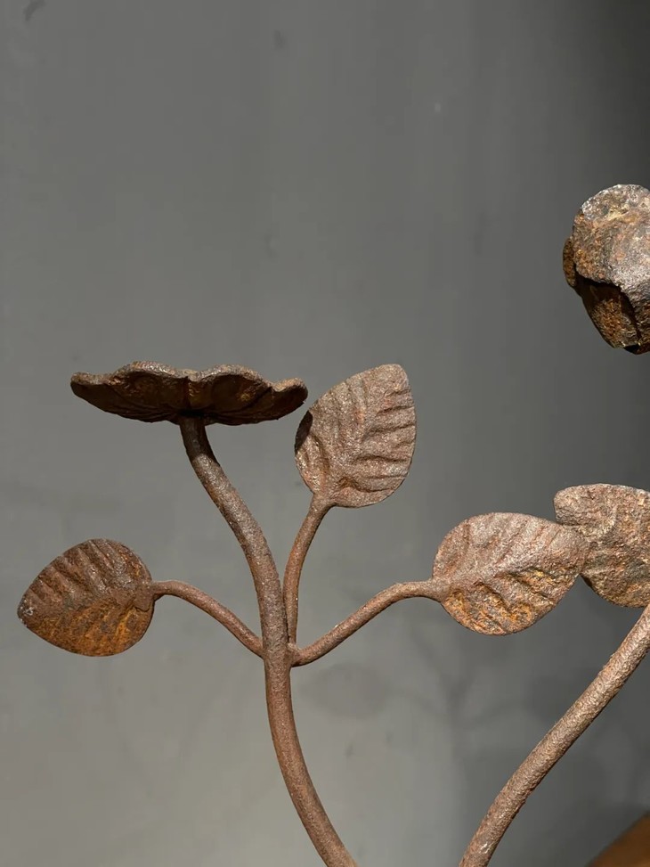 这是一件以铸铁塑形成花卉状的案头雕塑摆件,仿生剪枝花卉造型,形态自然生动,花朵与枝叶塑形流畅优美,中央一朵半开月季,两侧各一朵盛开向上葵花或可充当烛台,应是清代厅堂摆设或是烛台,塑型典雅生动,制作严谨精緻,是年代挺老的空间摆设品。