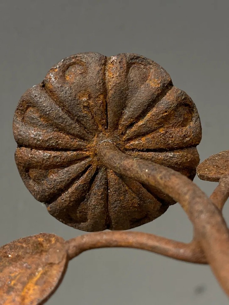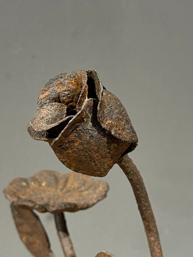 此件铸铁花卉形雕塑案头摆件,尺寸饰适中,案头摆设典雅别致,整体雕塑艺术性高,如图所示,除表面蒙尘与斑驳铁锈及积垢外,基本保存完好无损。
